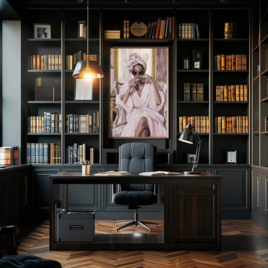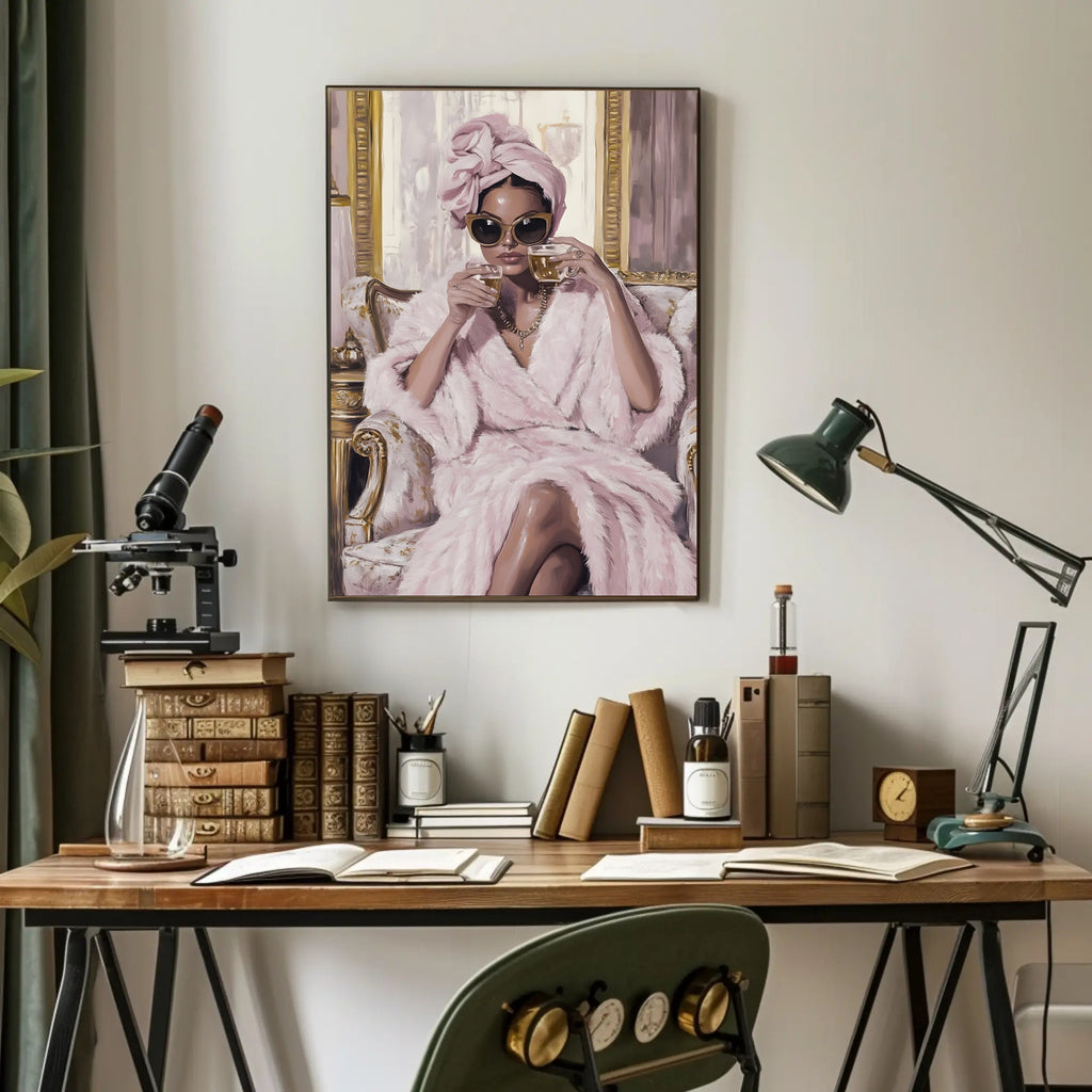 Bring haute couture into your home with the "Glamour And Elegance" poster from PosterGoat — a luxe fashion print that pairs minimalist composition with high-fashion attitude. This artful wall decor depicts a poised woman in a plush pink robe and turban, oversized sunglasses and a gold-accented setting, rendered in soft brushstrokes that add texture and cinematic charm to any room.
