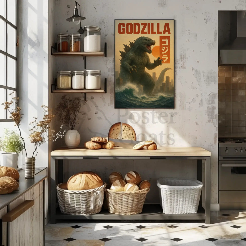 Bring cinematic scale and vintage pop-culture energy to your walls with the Godzilla Rampage in Tokyo Pop Culture Poster from PosterGoat. This striking 24x36 poster captures the iconic kaiju rising through stormy surf toward a skyline of towering skyscrapers, rendered in moody greens, muted oranges and warm browns for a dramatic, movie-poster aesthetic.