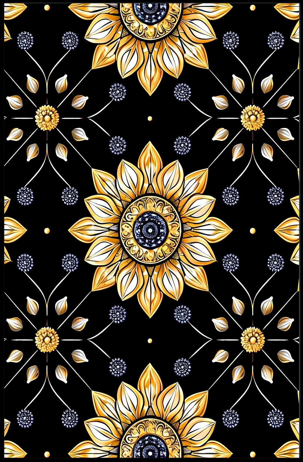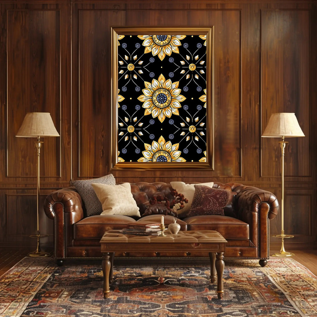 This art print blends classic botanical inspiration with contemporary design: each sunflower-like medallion features layered, hand-drawn petals and an intricately decorated center that reads like a miniature work of art. The result is a sophisticated focal piece that brings warmth, contrast, and visual depth to any wall without overpowering your décor.