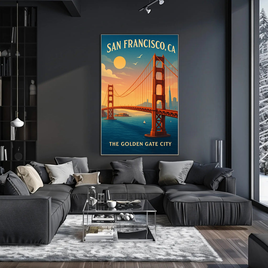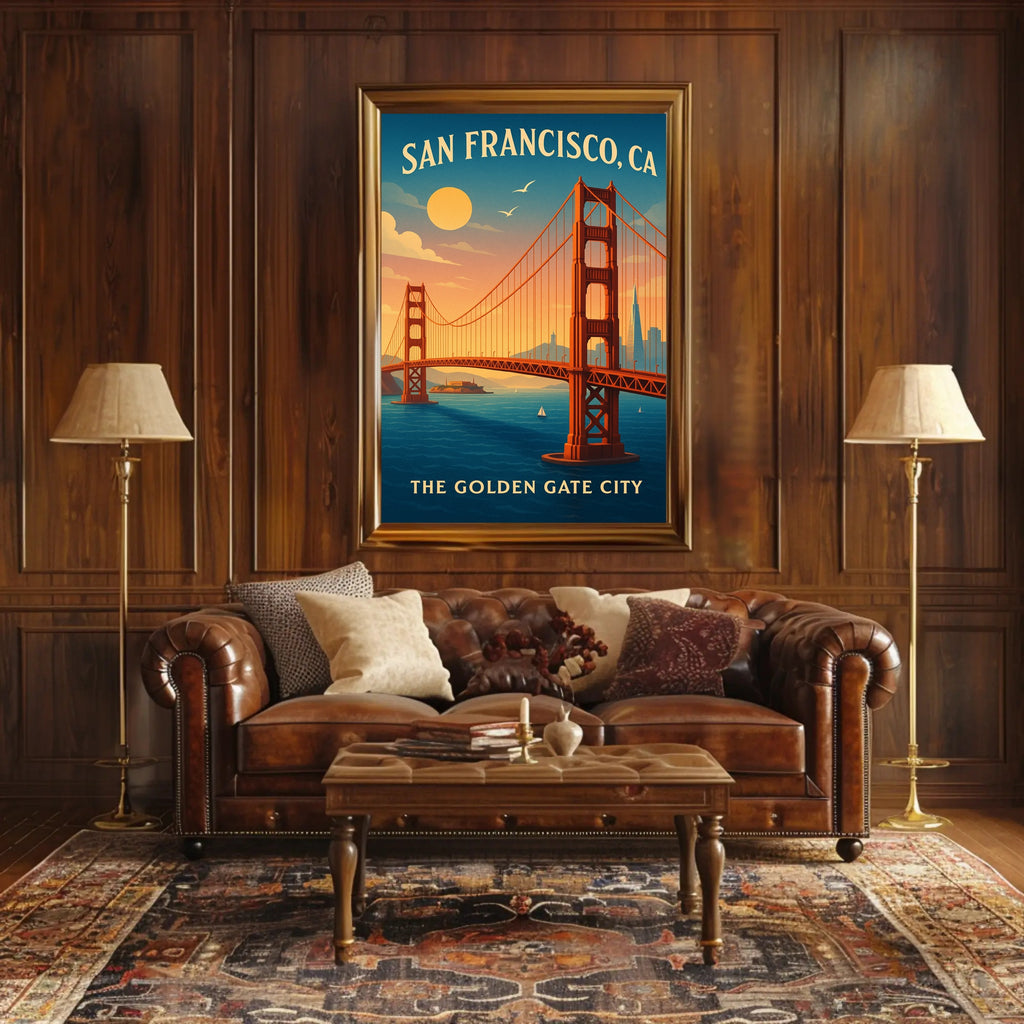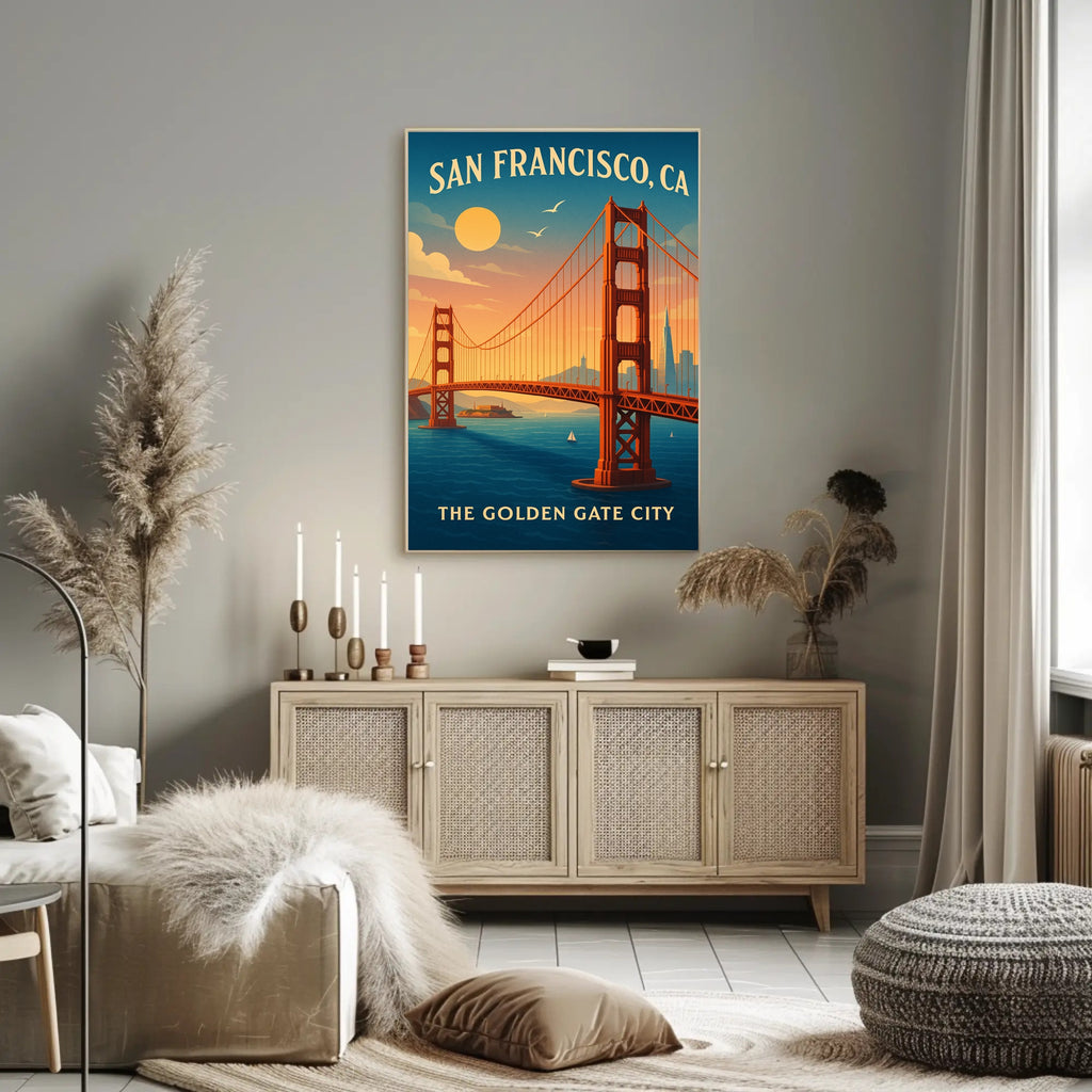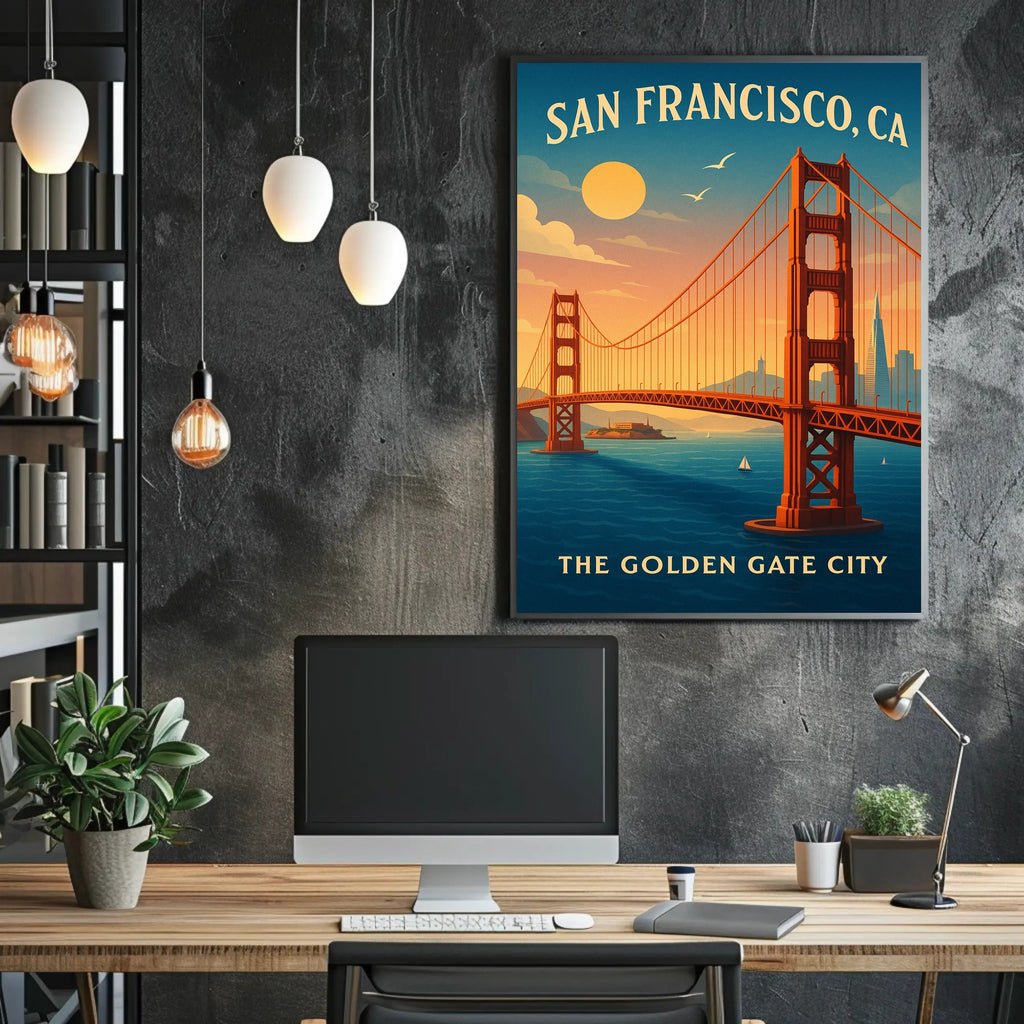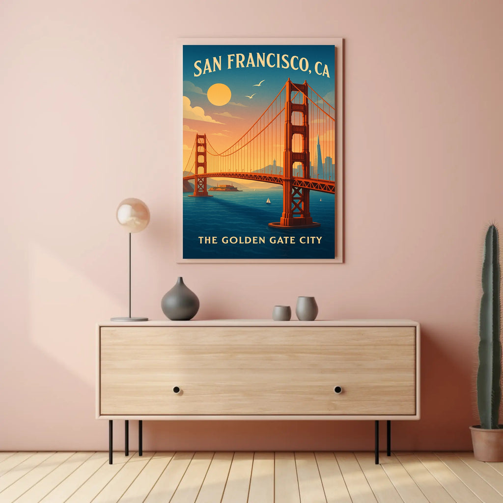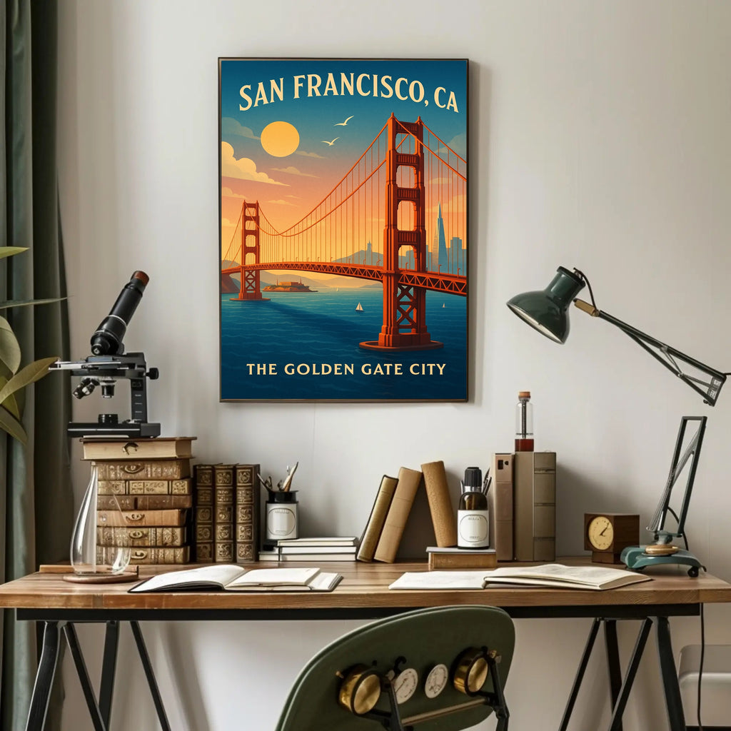 - Themes: Golden Gate Bridge, San Francisco, Vintage travel poster