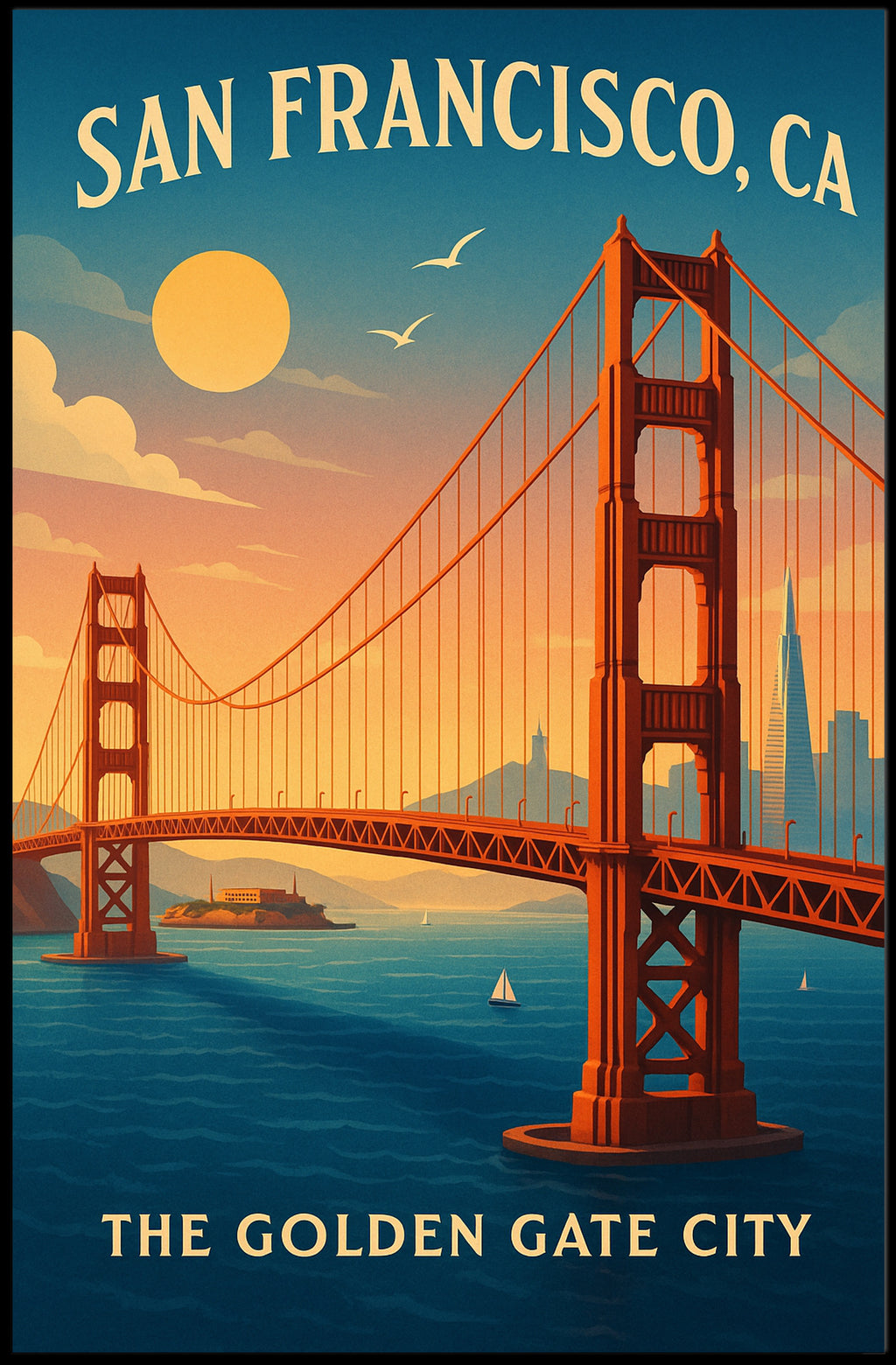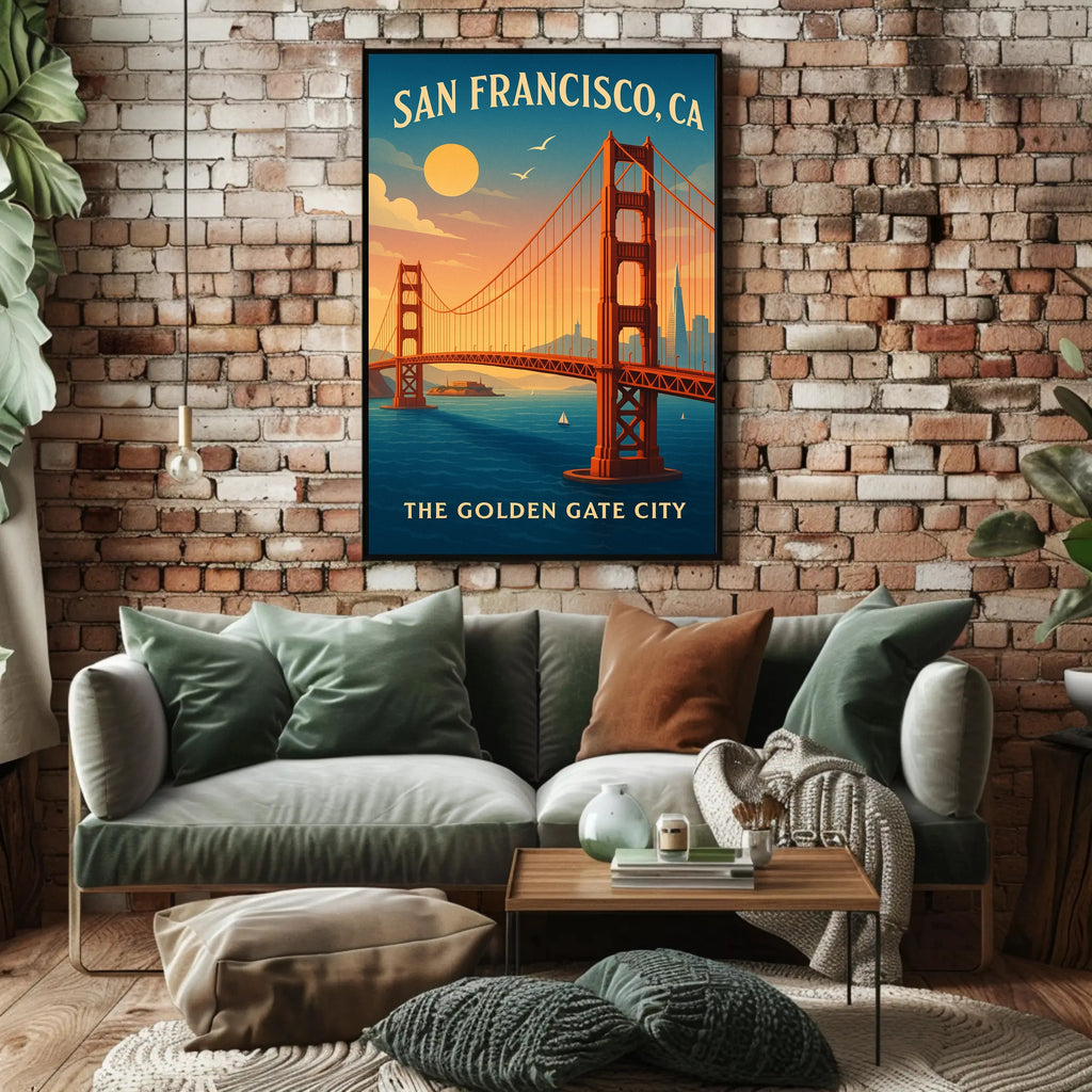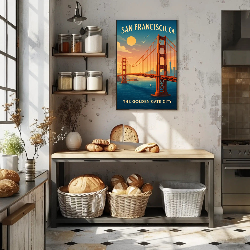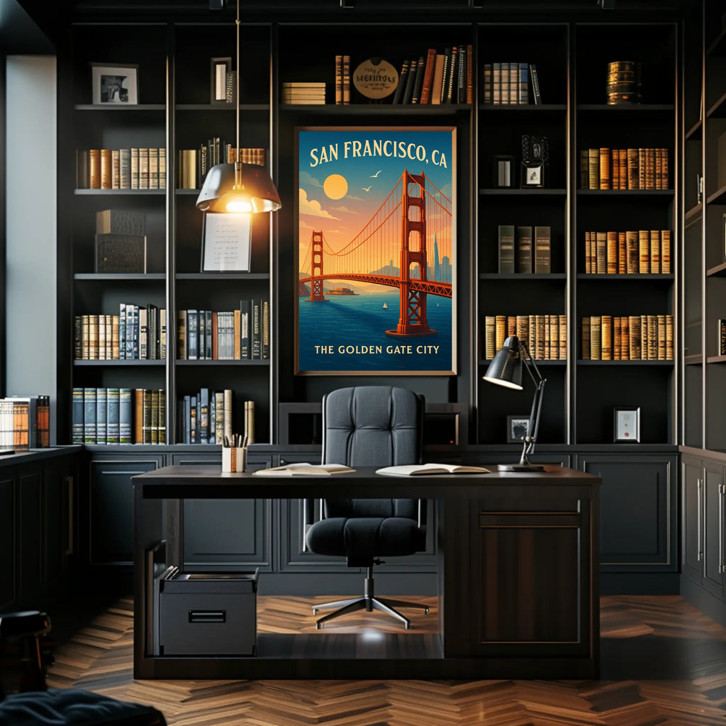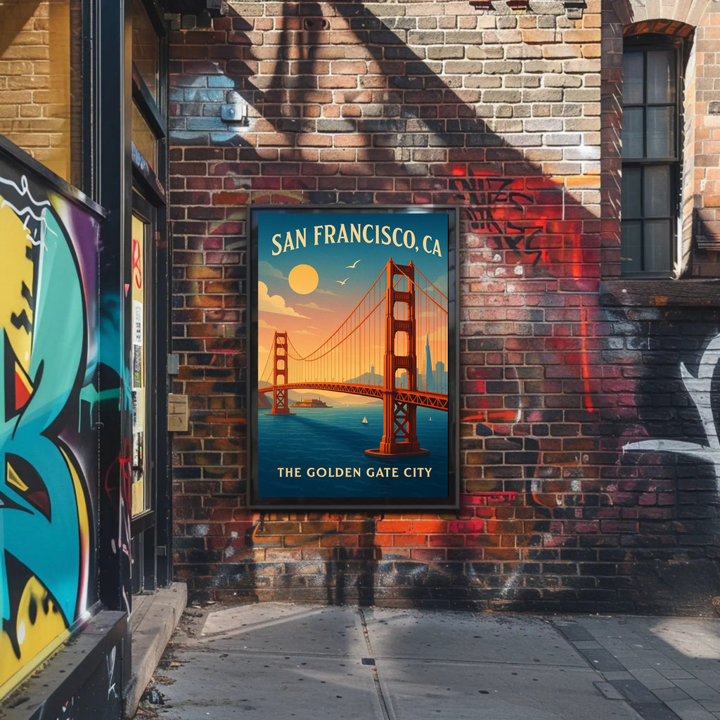- Themes: Golden Gate Bridge, San Francisco, Vintage travel poster