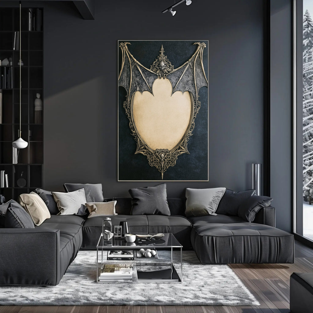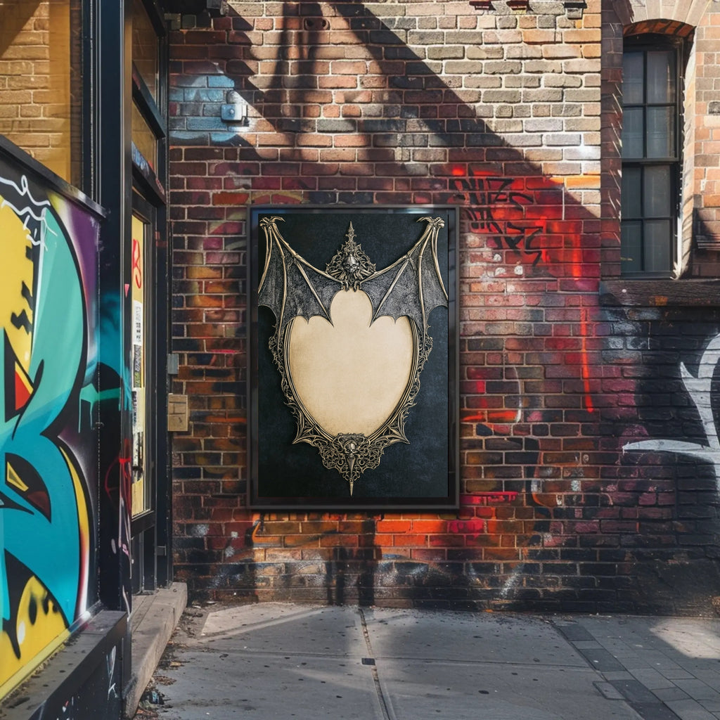 Gothic Bat Frame Poster from PosterGoat brings dramatic, museum-quality gothic style to your walls. This striking poster features an ornate bat-shaped frame rendered in fine, filigreed detail — skeletal wing bones, a central skull crest and dagger-like ornamentation surround a warm, parchment-like center that contrasts beautifully with the deep, textured black background. The result is a bold focal piece perfect for art lovers, gothic decor enthusiasts, and seasonal displays alike.