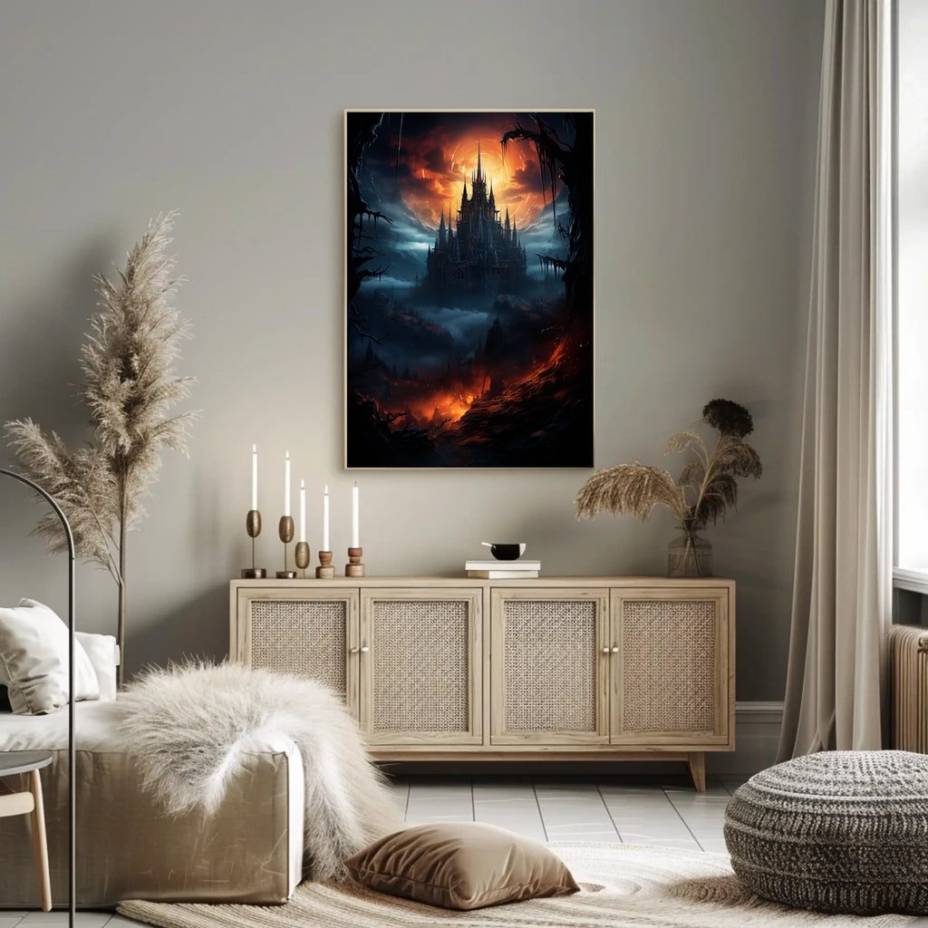 Step into a world of dark fantasy with this captivating poster, showcasing a majestic gothic castle set against a misty, mountainous backdrop. The scene is brought to life with photorealistic detail, highlighting the castle's intricate spires and glowing windows. The foreground's fiery, molten terrain contrasts sharply with the swirling celestial phenomenon in the sky, evoking a sense of mystery and impending doom. This dramatic artwork, with its intense contrasts and eerie atmosphere, is perfect for fans of gothic art and mythical landscapes, adding a touch of dark magic to any space.