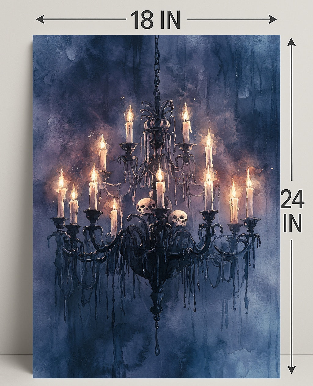 Gothic Chandelier Poster by PosterGoat blends haunting elegance with minimalist artistry to create a striking focal point for any wall. Rendered in deep indigo washes and warm candlelight, this print captures a dripping, watercolor-like chandelier adorned with melting candles and subtle skull accents—perfect for fans of gothic, Halloween, and moody scenic art.