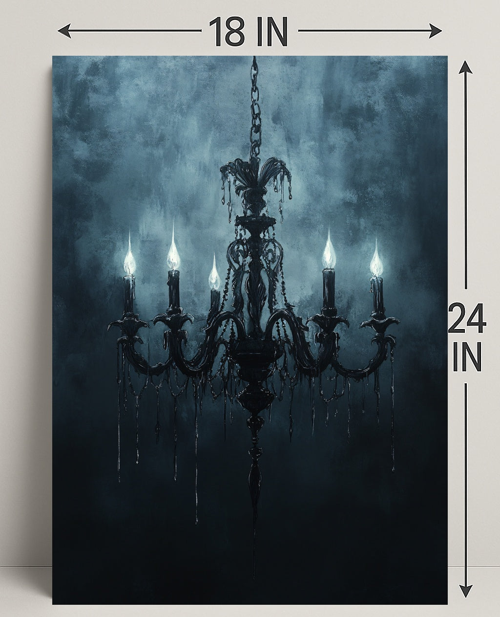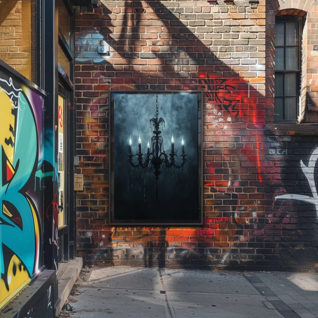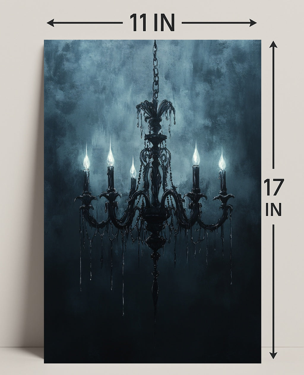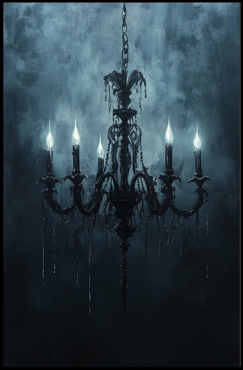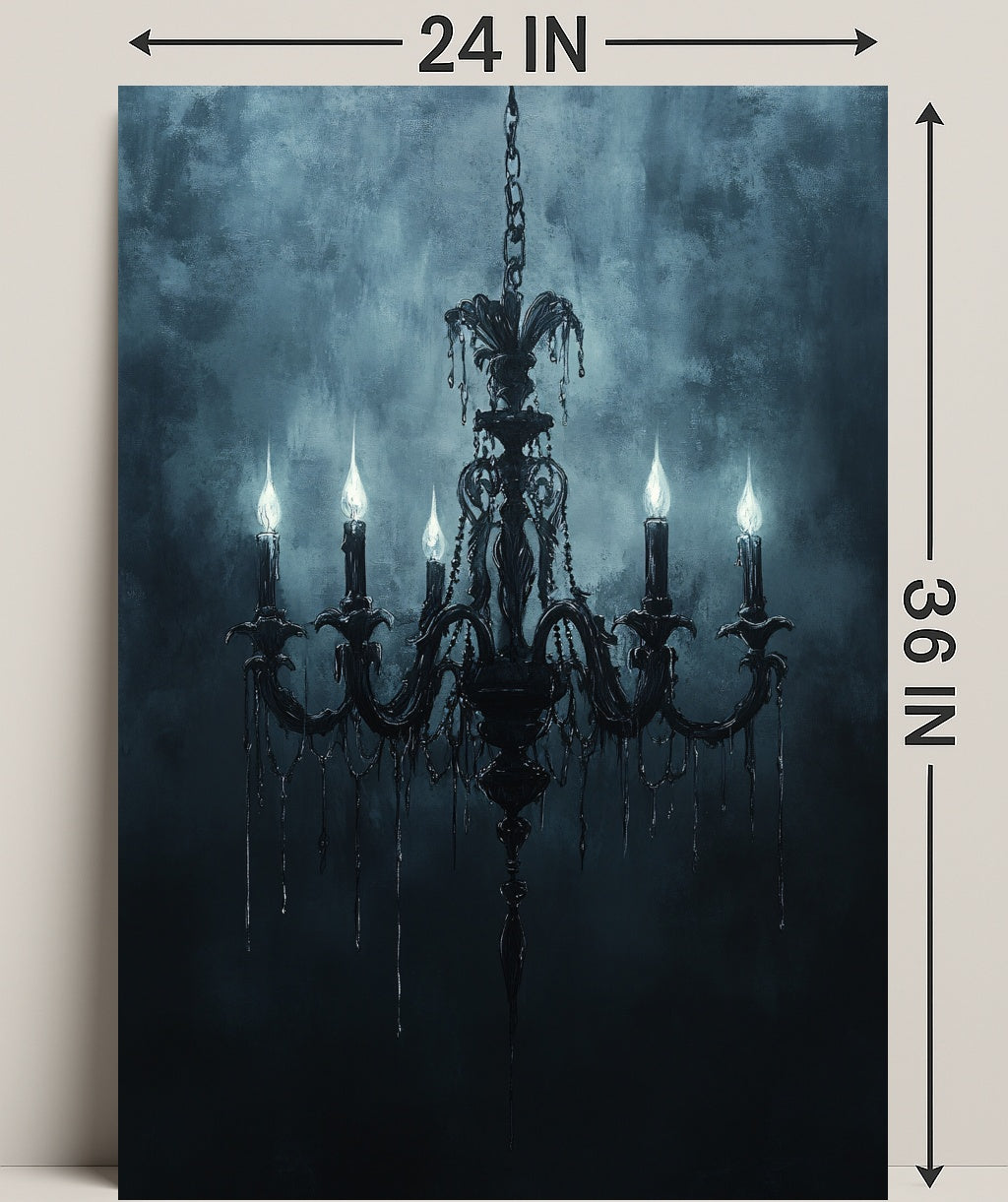 Elevate your walls with timeless Gothic elegance. The Gothic Chandelier Poster from PosterGoat transforms any room into a moody, artful space — a striking centerpiece that blends classic architecture with minimalist, atmospheric design. Rich blue-gray tones and painterly texture set a dramatic backdrop for an ornate chandelier silhouette, its six candle-like lights casting an eerie, sophisticated glow.