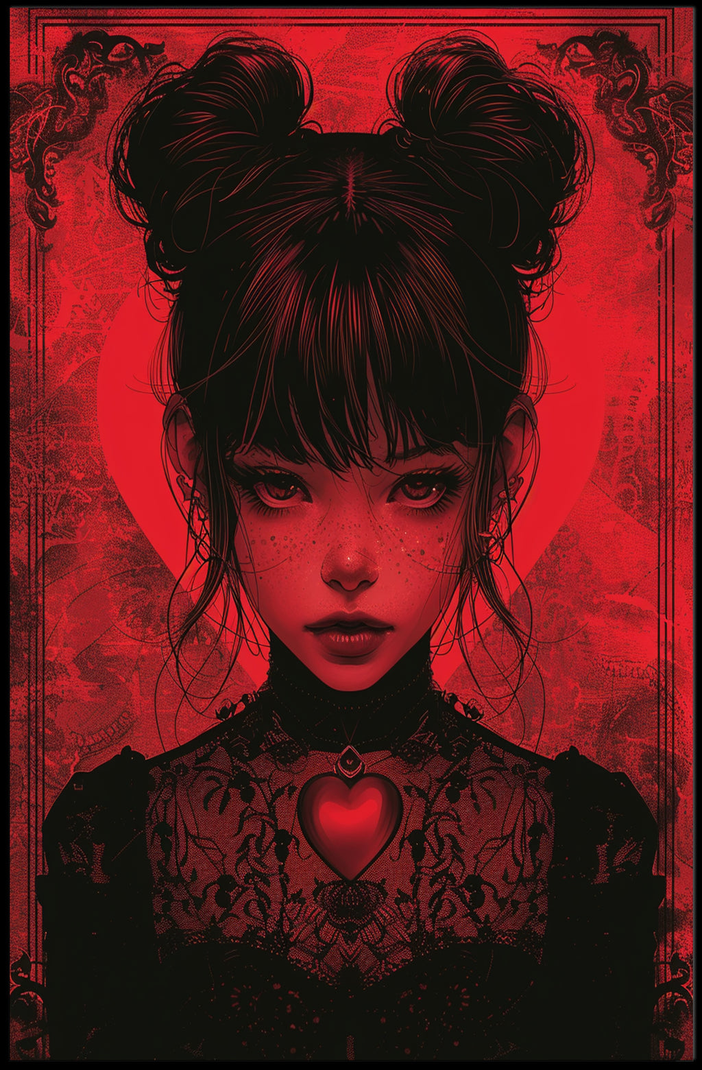 Immerse your space in brooding beauty with the Gothic Elegance Poster from PosterGoat — a striking art print that fuses dark romance and minimalist design into a show-stopping centerpiece. Rendered in dramatic red and black, this portrait-style poster features an enigmatic heroine framed by ornate gothic flourishes, delicate lace textures, and a luminous heart pendant that draws the eye. The result is a captivating visual statement that elevates living rooms, bedrooms, studios, and curated gallery walls alike.