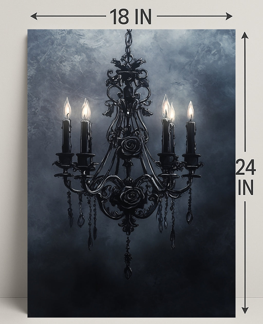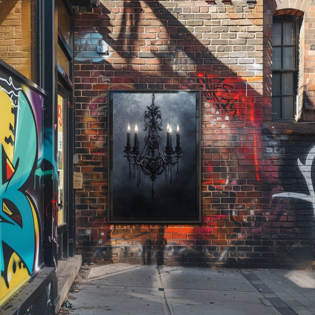 Elevate your walls with the Gothic Elegance Poster from PosterGoat — a moody, vintage-collage inspired art print that blends dark romance and refined décor. This striking poster features an ornate, black chandelier with dripping candle wax, sculpted roses and dangling crystal drops suspended against a textured, smoky navy-gray backdrop. It's a perfect statement piece for fans of gothic style, Halloween ambience, and atmospheric wall art.