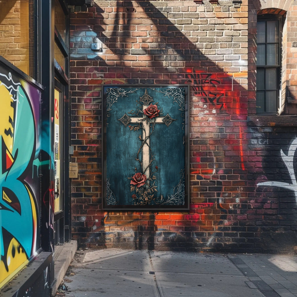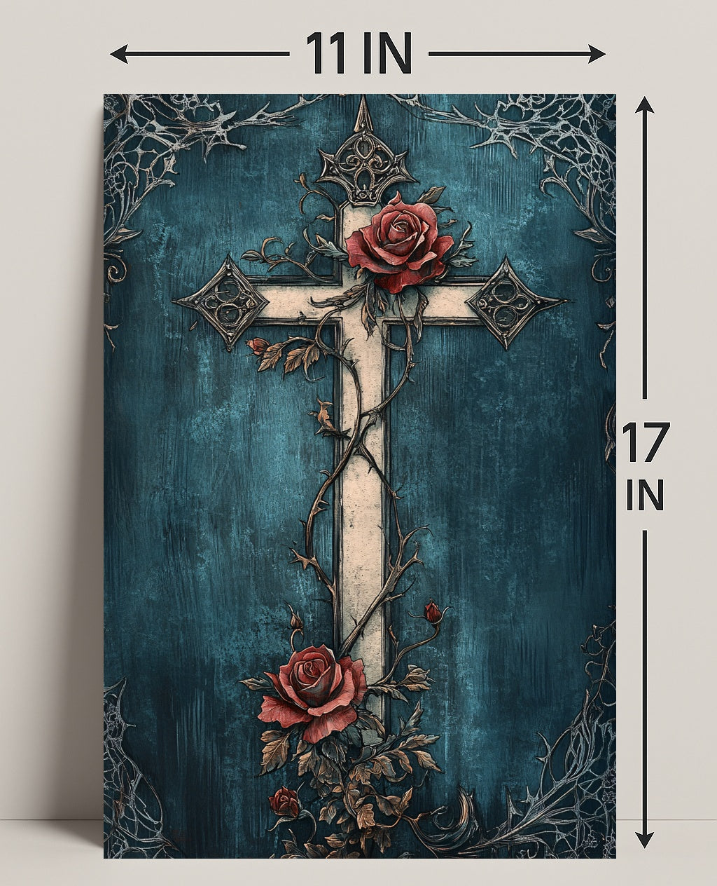 Bring a striking blend of dark romance and refined design to your walls with the Gothic Elegance Poster from PosterGoat. This artful poster features an ornate cross entwined with thorned vines and blooming roses set against a richly textured teal background — a powerful focal piece for living rooms, bedrooms, studios, or seasonal displays.