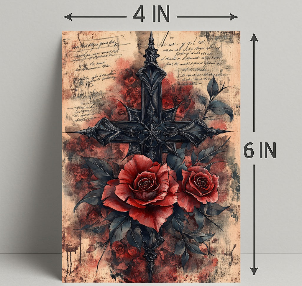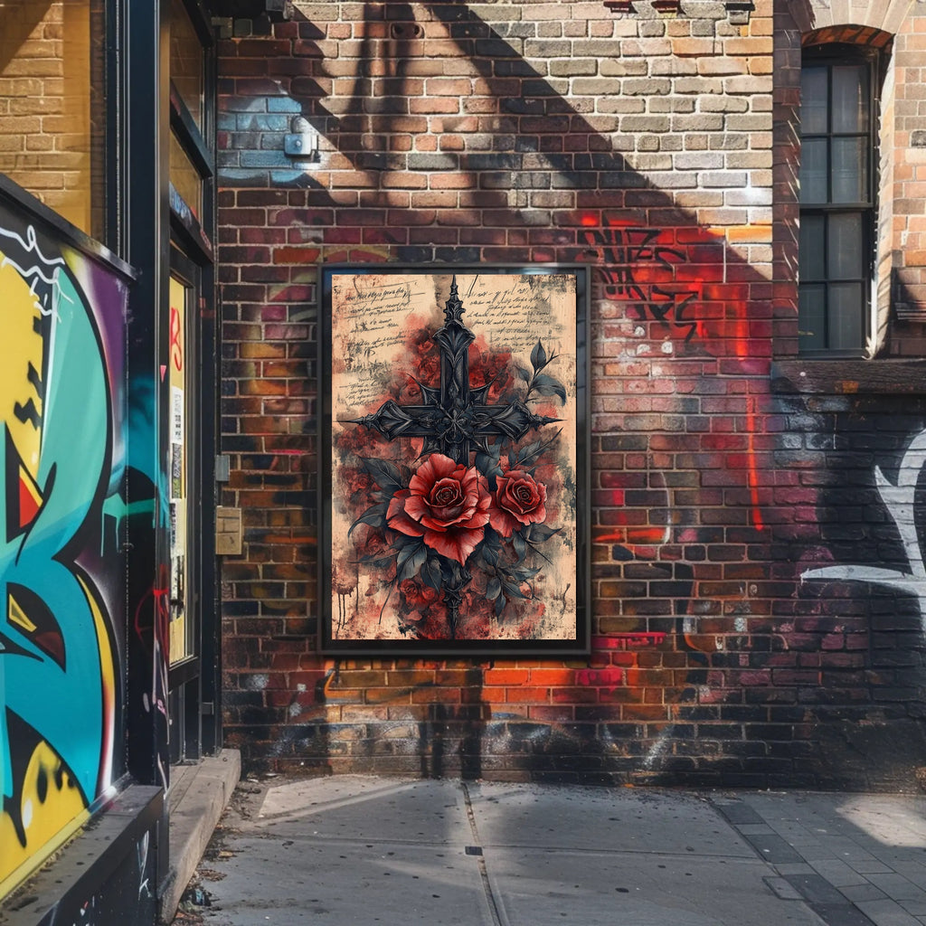 Elevate your space with the Gothic Elegance Poster from PosterGoat — a striking fusion of dark romanticism and minimalist composition designed for modern interiors. This evocative print centers on a sculpted, ornamental black cross entwined with lush, blood-red roses set against an aged parchment backdrop. Handwritten script, subtle paint drips, and textured shadows add dramatic depth, creating a moody focal point that works beautifully in living rooms, bedrooms, or entryways.