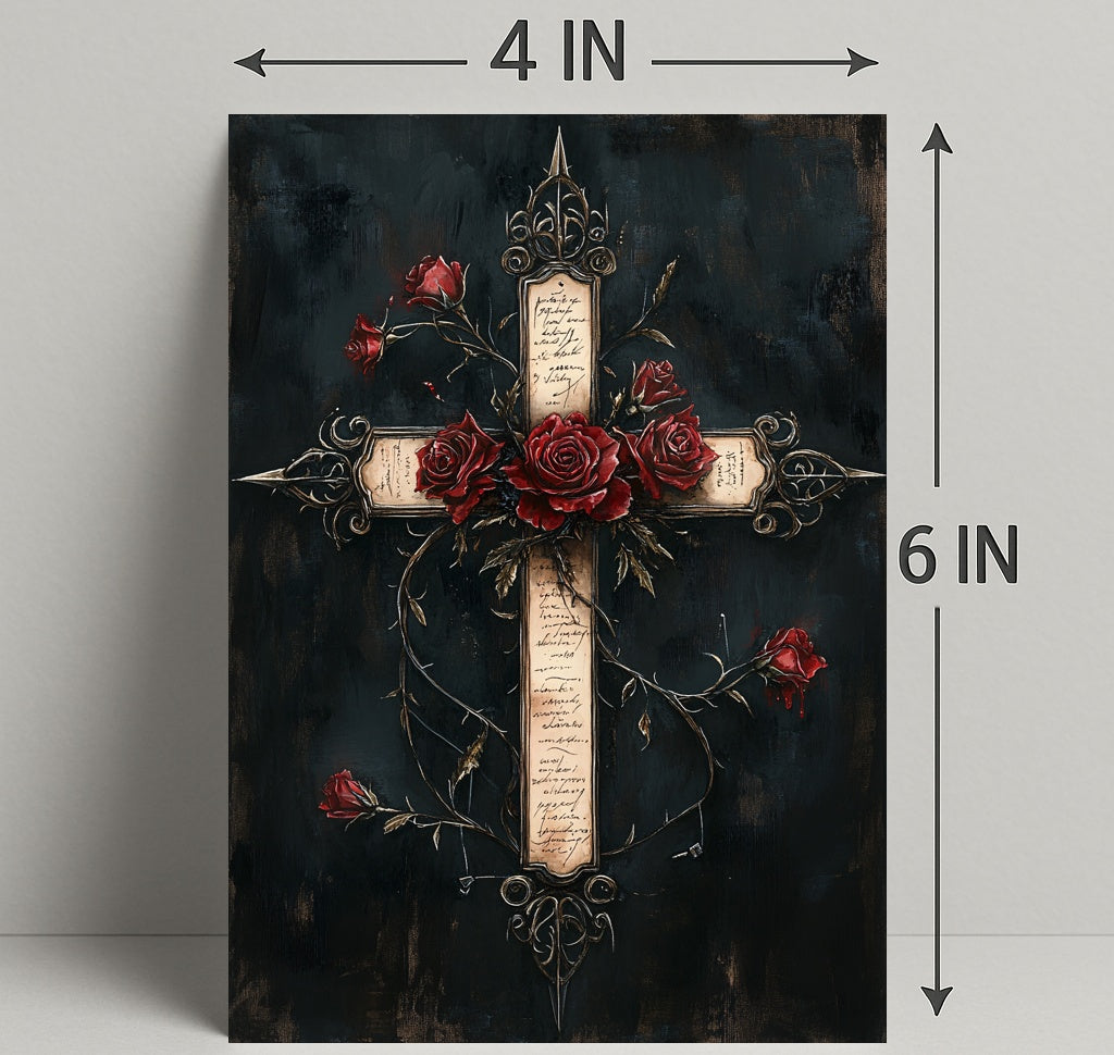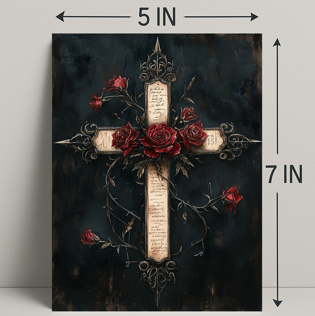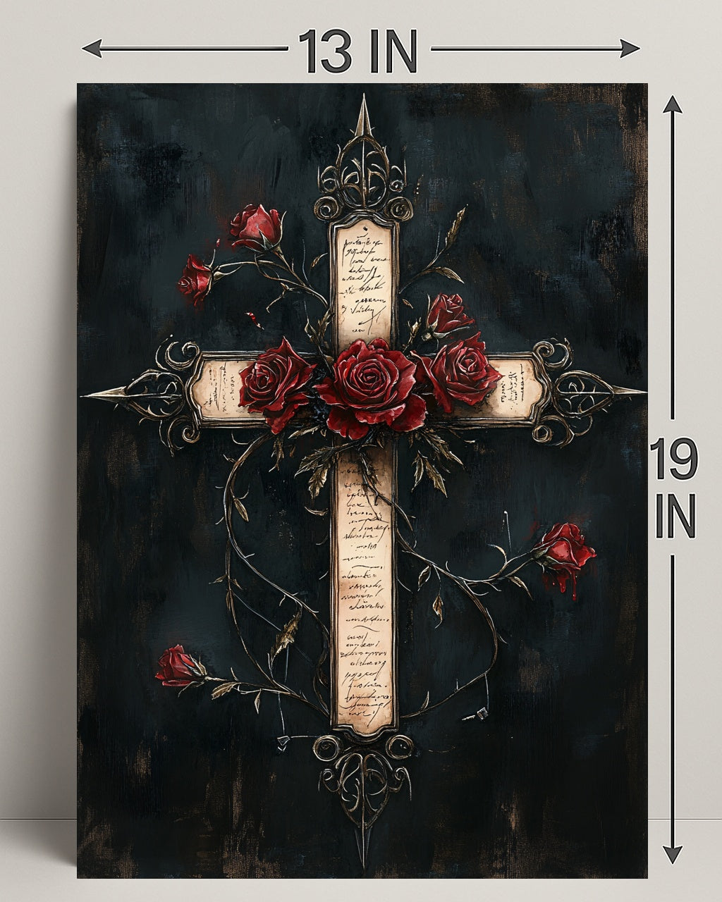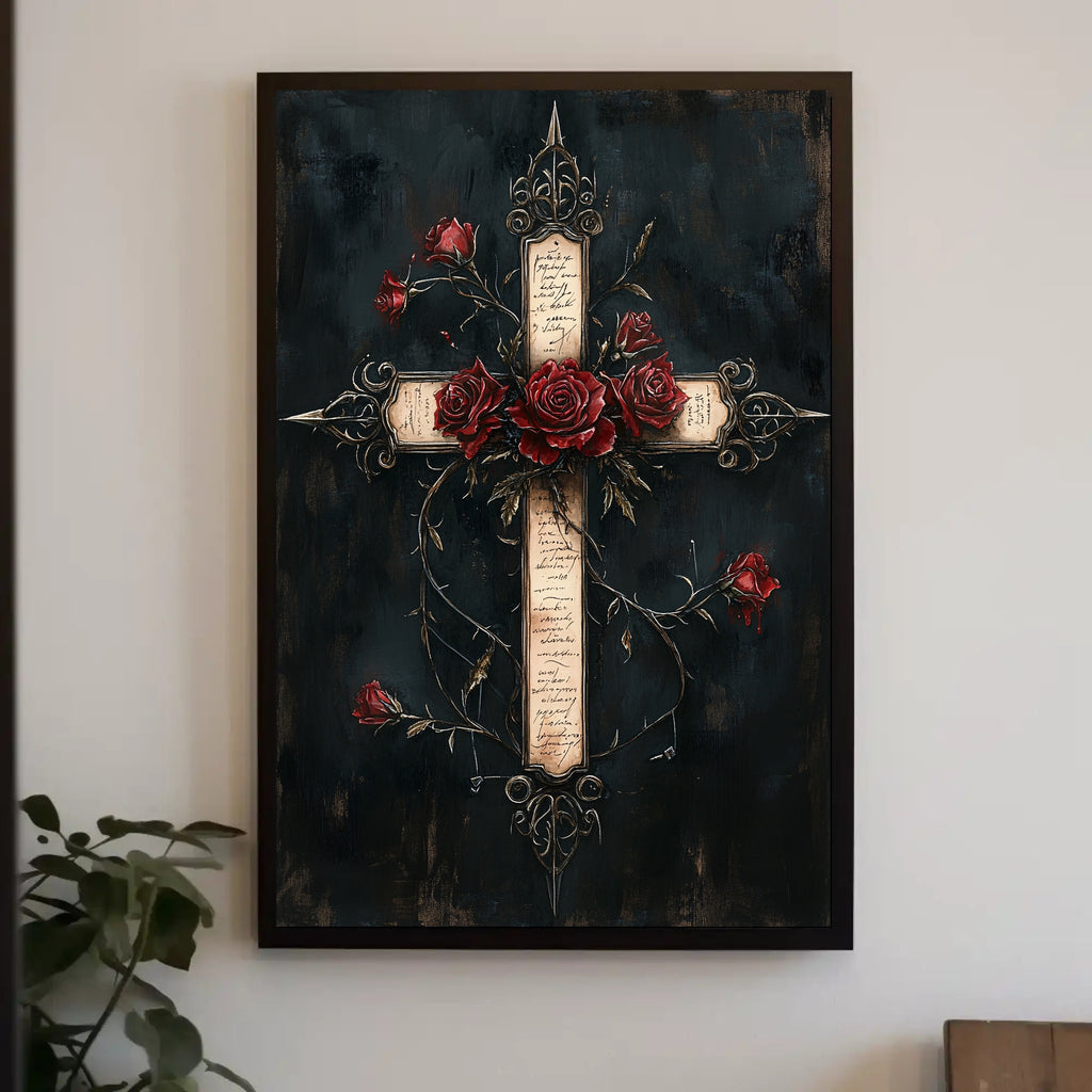 Visual features: Ornate cross motif, gilded filigree, handwritten script panels, twisted vines and vivid red roses on a textured dark background