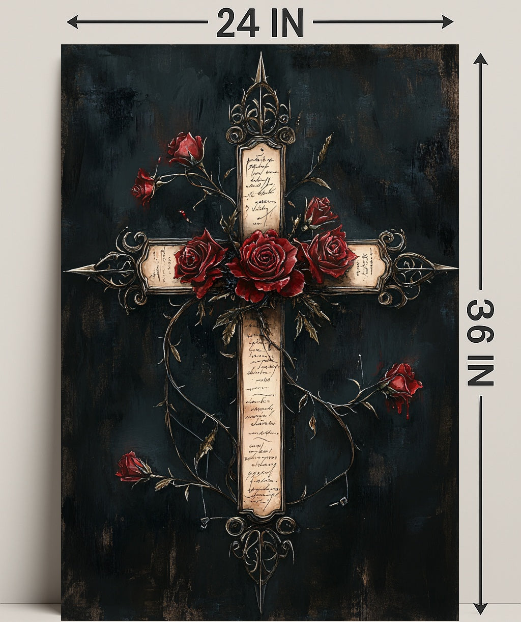 Discover the Gothic Elegance Poster by PosterGoat — a dramatic wall art piece that blends classical Gothic architecture with romantic, haunting beauty. Rich, moody blacks and distressed textures form a deep backdrop for an ornate metallic cross wrapped in thorned vines and crowned with lush, crimson roses. Fine script panels and gilded filigree details give this print an antique, gallery-ready presence that elevates any Home & Garden decor collection.