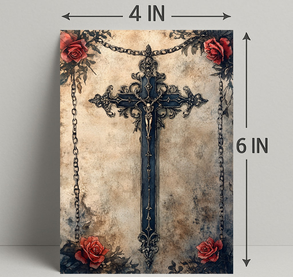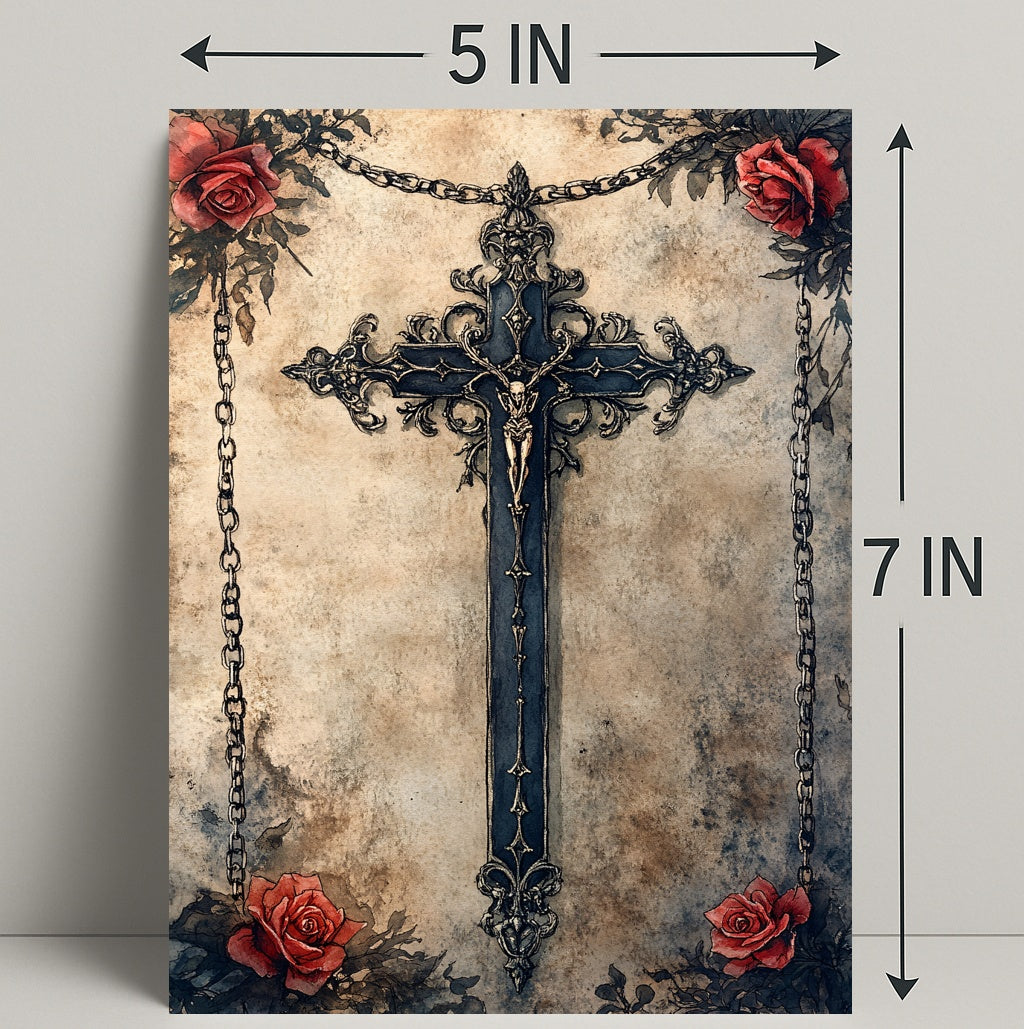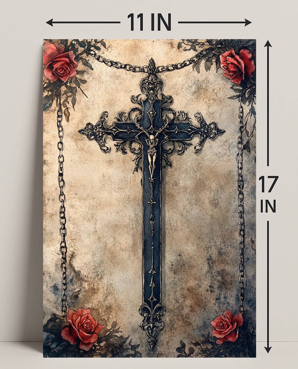 Why you'll love it: This print features an ornate, inked cross suspended by chains, framed by richly detailed red roses and a distressed parchment backdrop that evokes antique charm and moody sophistication. The balanced composition works equally well in modern, rustic, or Halloween-themed decor settings.