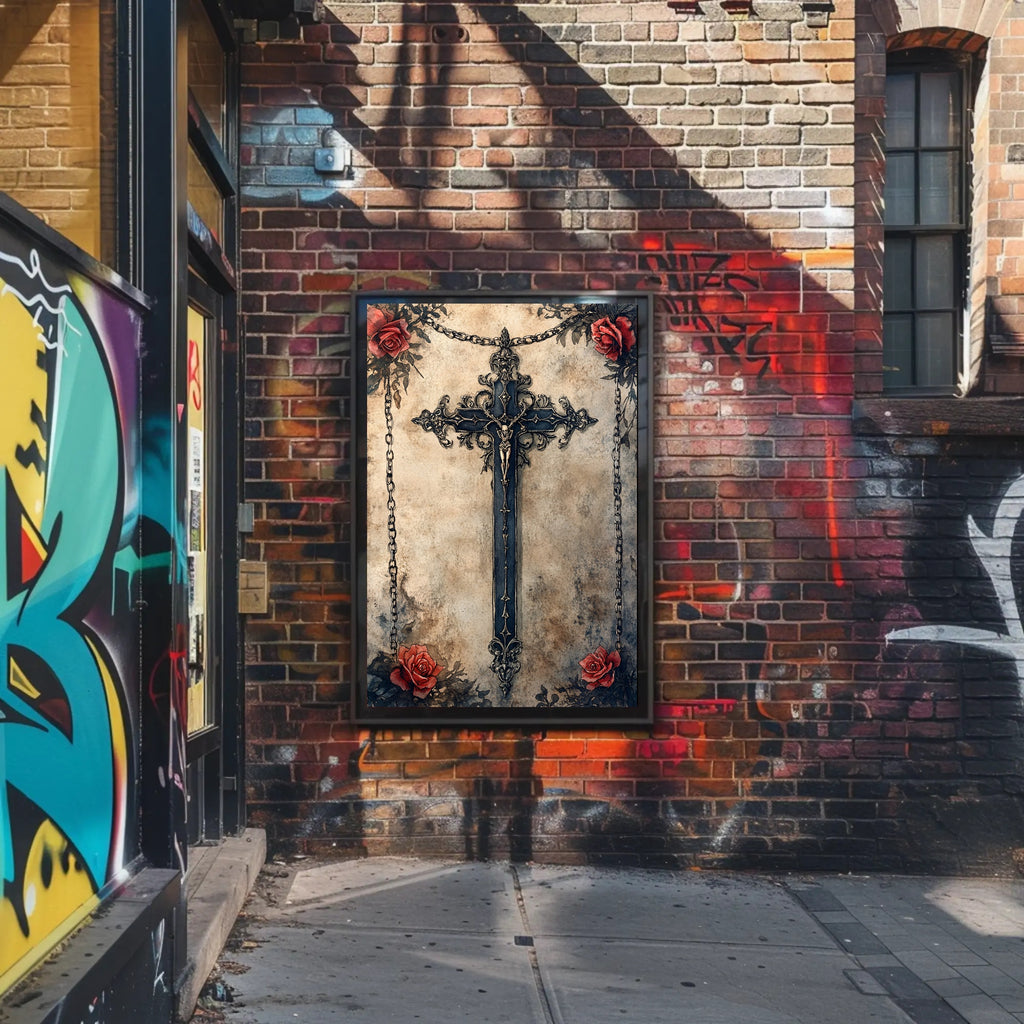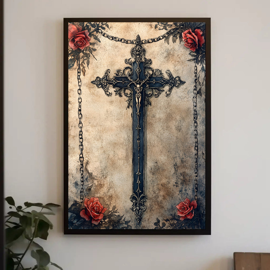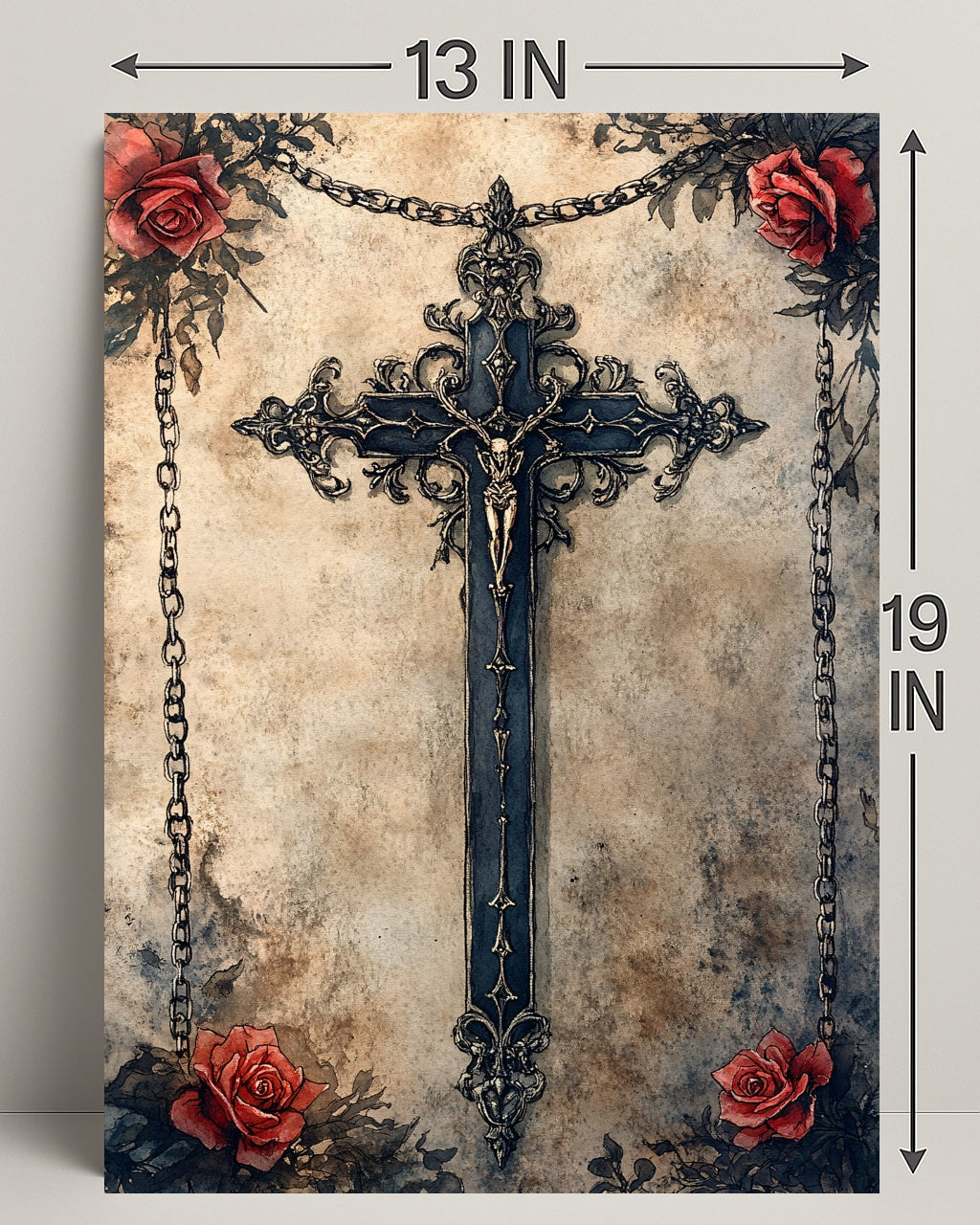 Why you'll love it: This print features an ornate, inked cross suspended by chains, framed by richly detailed red roses and a distressed parchment backdrop that evokes antique charm and moody sophistication. The balanced composition works equally well in modern, rustic, or Halloween-themed decor settings.