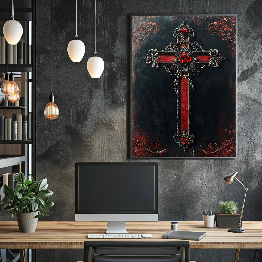 Immerse your room in dramatic, refined style with the Gothic Elegance Poster from PosterGoat — a striking wall art piece that blends ornate gothic motifs with bold, contemporary contrast. This print features a richly textured black background, an antique-style cross with metallic filigree, and vivid red roses that create an arresting focal point perfect for modern living rooms, entryways, or themed décor displays.