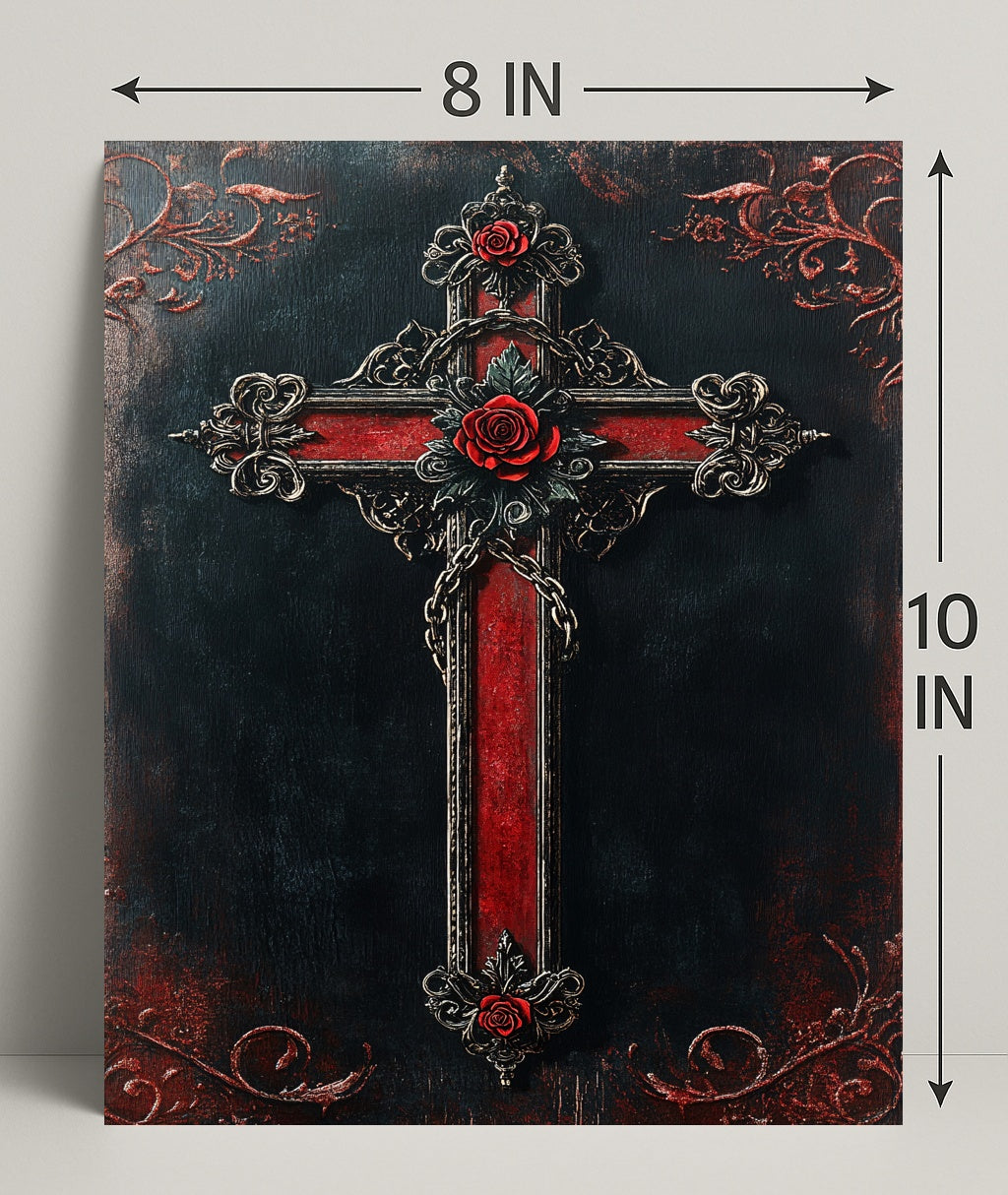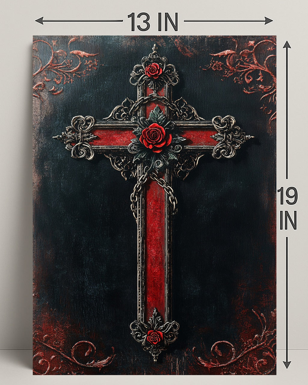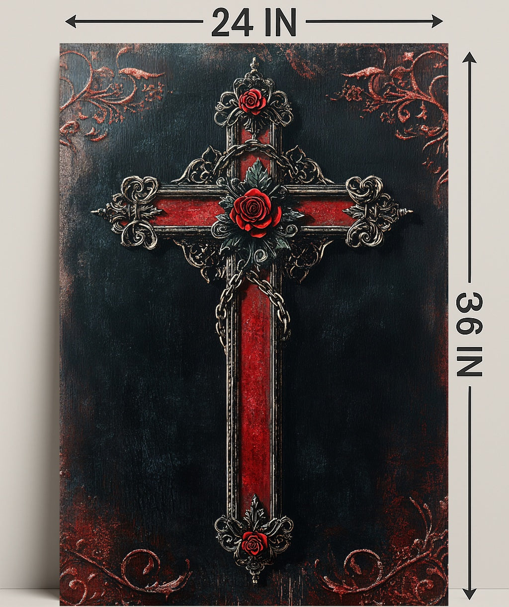 Eye-catching design: Intricate baroque filigree and sculpted chain details frame a crimson cross, accented by lifelike red roses for a powerful visual statement.