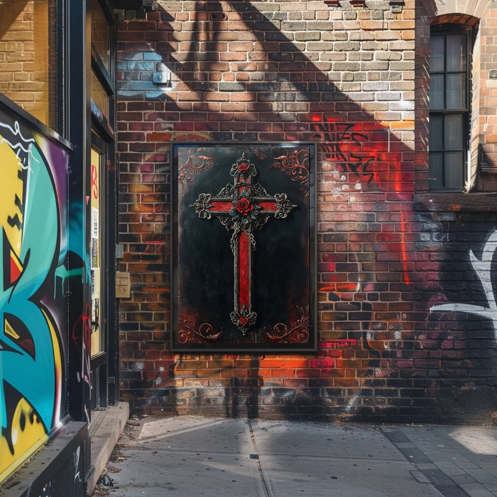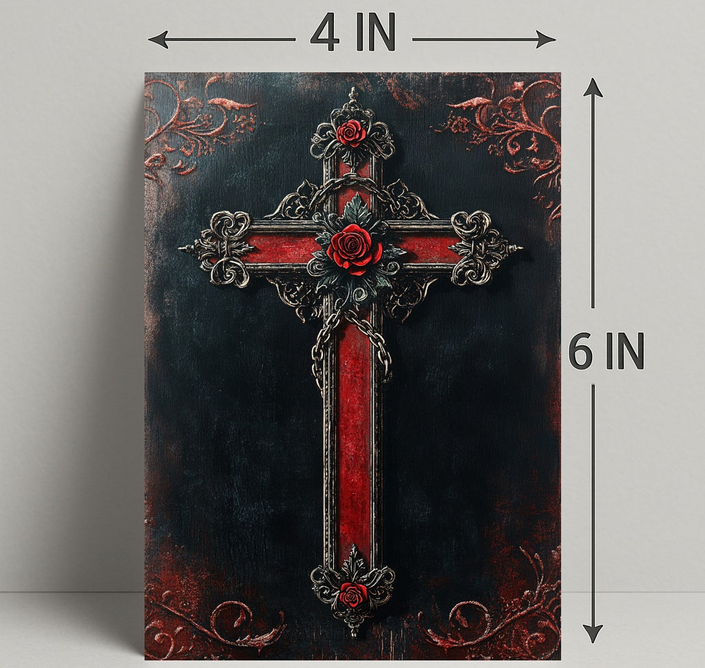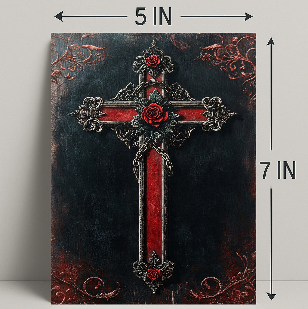Eye-catching design: Intricate baroque filigree and sculpted chain details frame a crimson cross, accented by lifelike red roses for a powerful visual statement.
