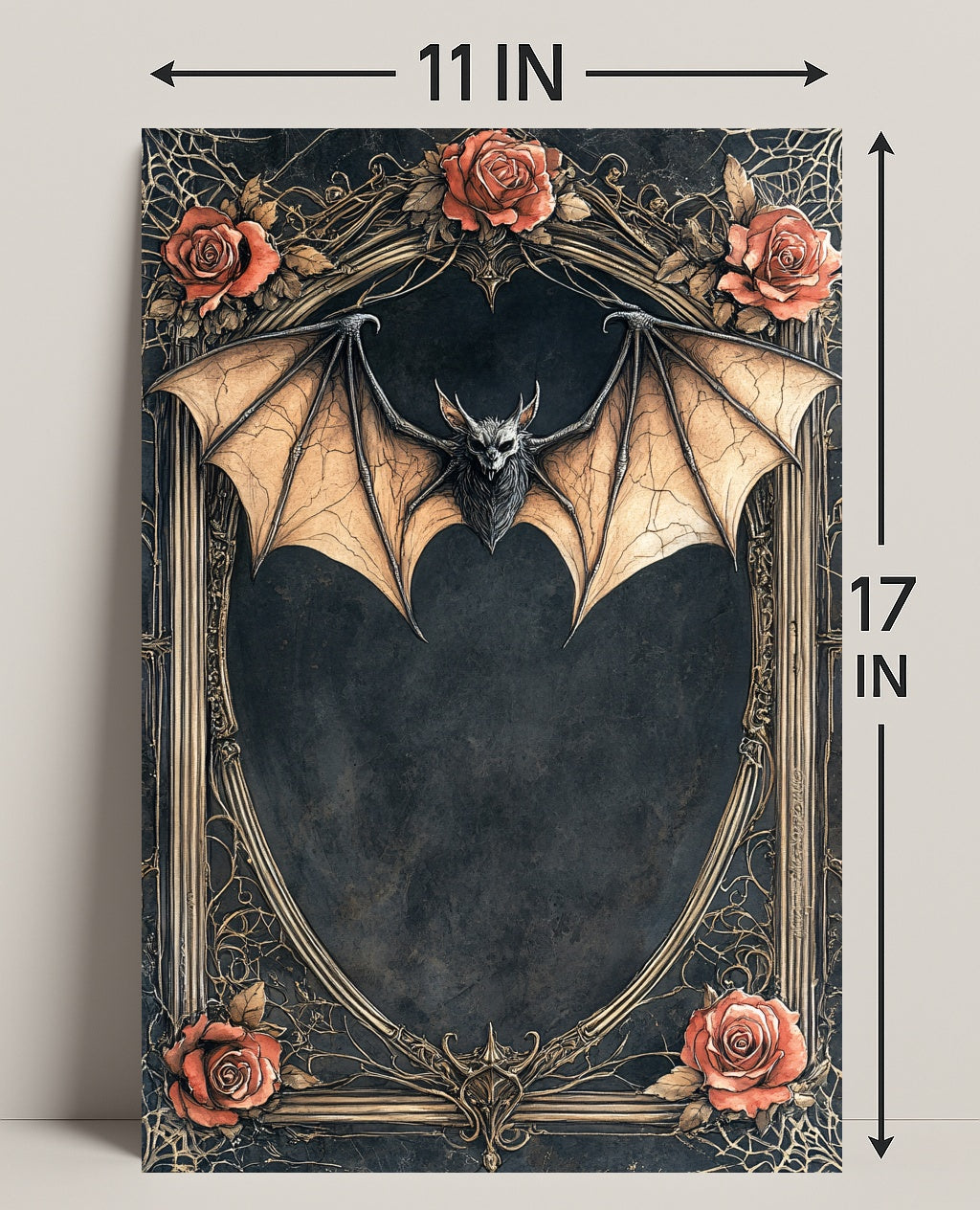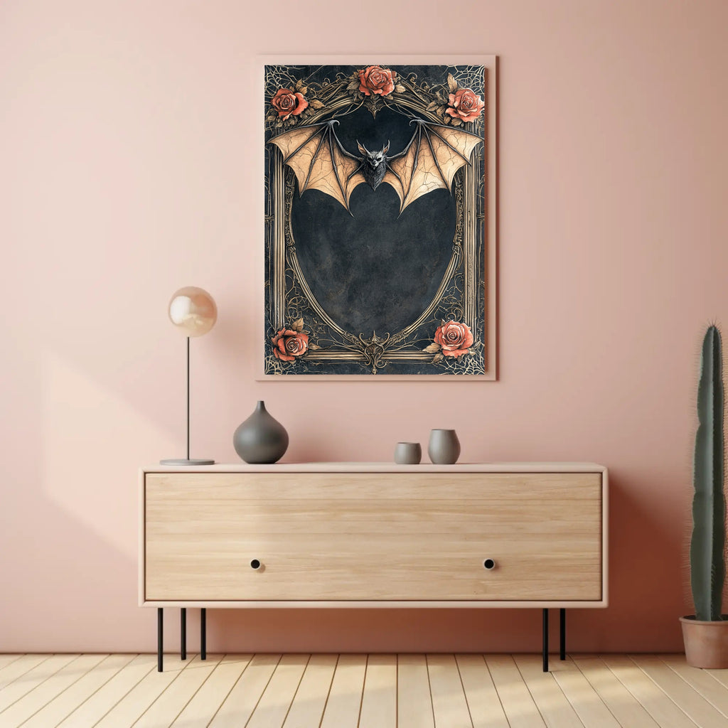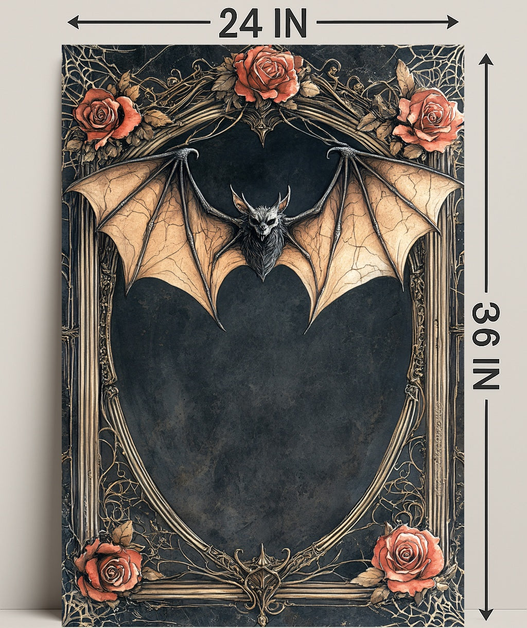 Infuse your walls with a dramatic blend of romance and shadow with the Gothic Elegance Poster from PosterGoat. This striking poster pairs a sculpted bat motif with an ornate, vintage-style frame and delicate roses to create a darkly beautiful focal point for living rooms, bedrooms, studios, and seasonal Halloween displays.
