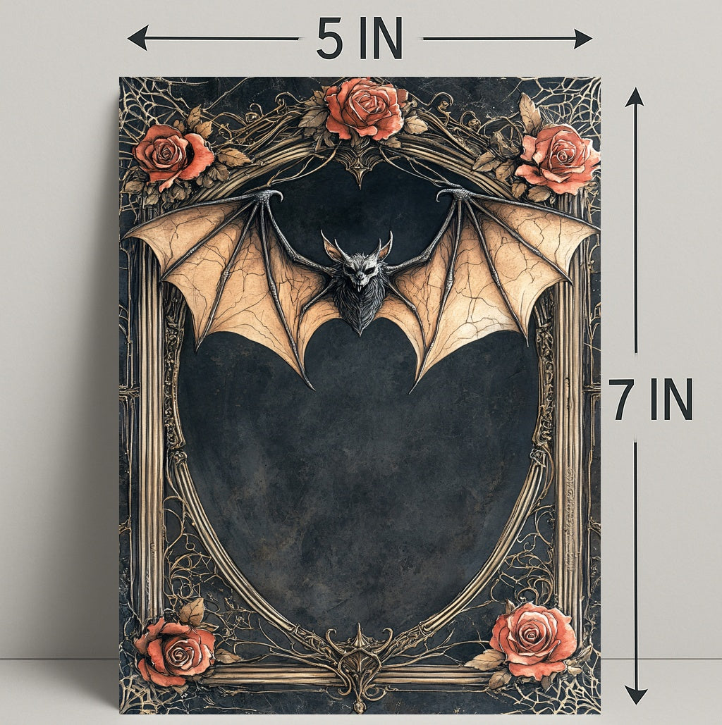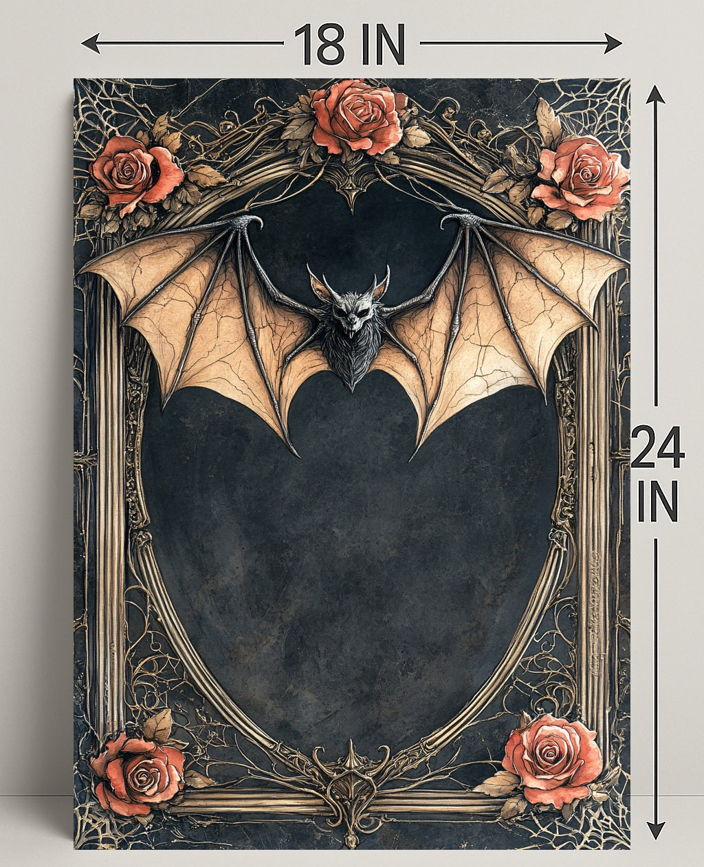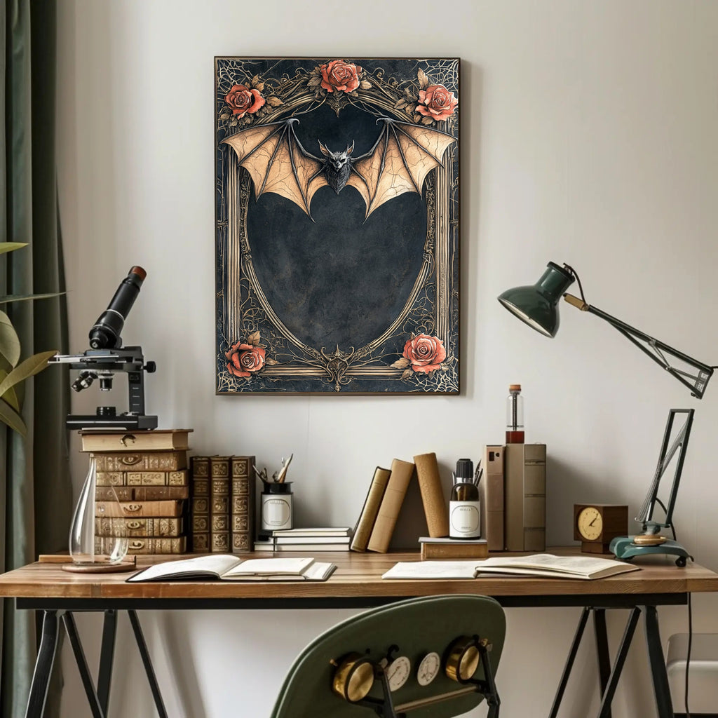 Infuse your walls with a dramatic blend of romance and shadow with the Gothic Elegance Poster from PosterGoat. This striking poster pairs a sculpted bat motif with an ornate, vintage-style frame and delicate roses to create a darkly beautiful focal point for living rooms, bedrooms, studios, and seasonal Halloween displays.
