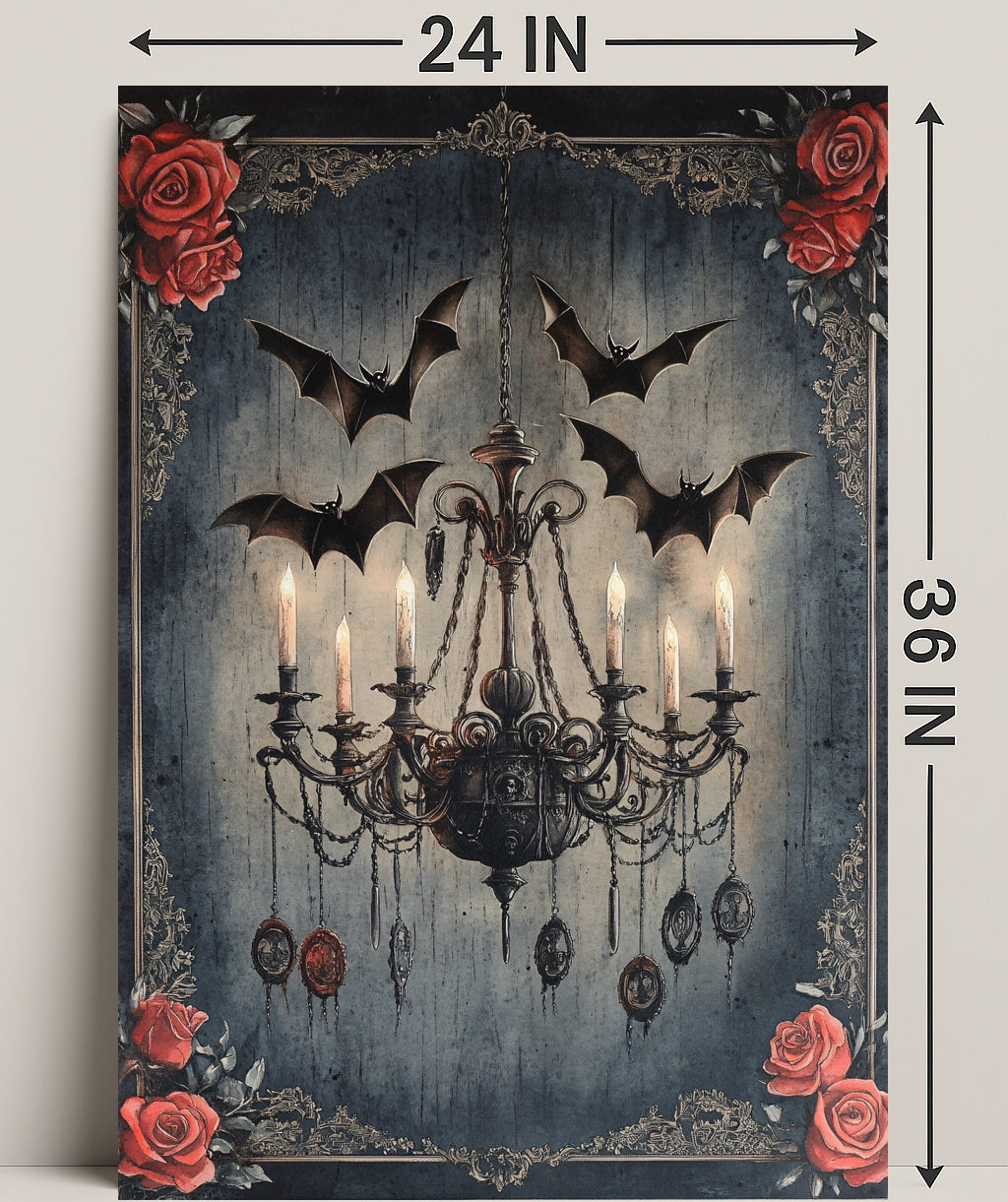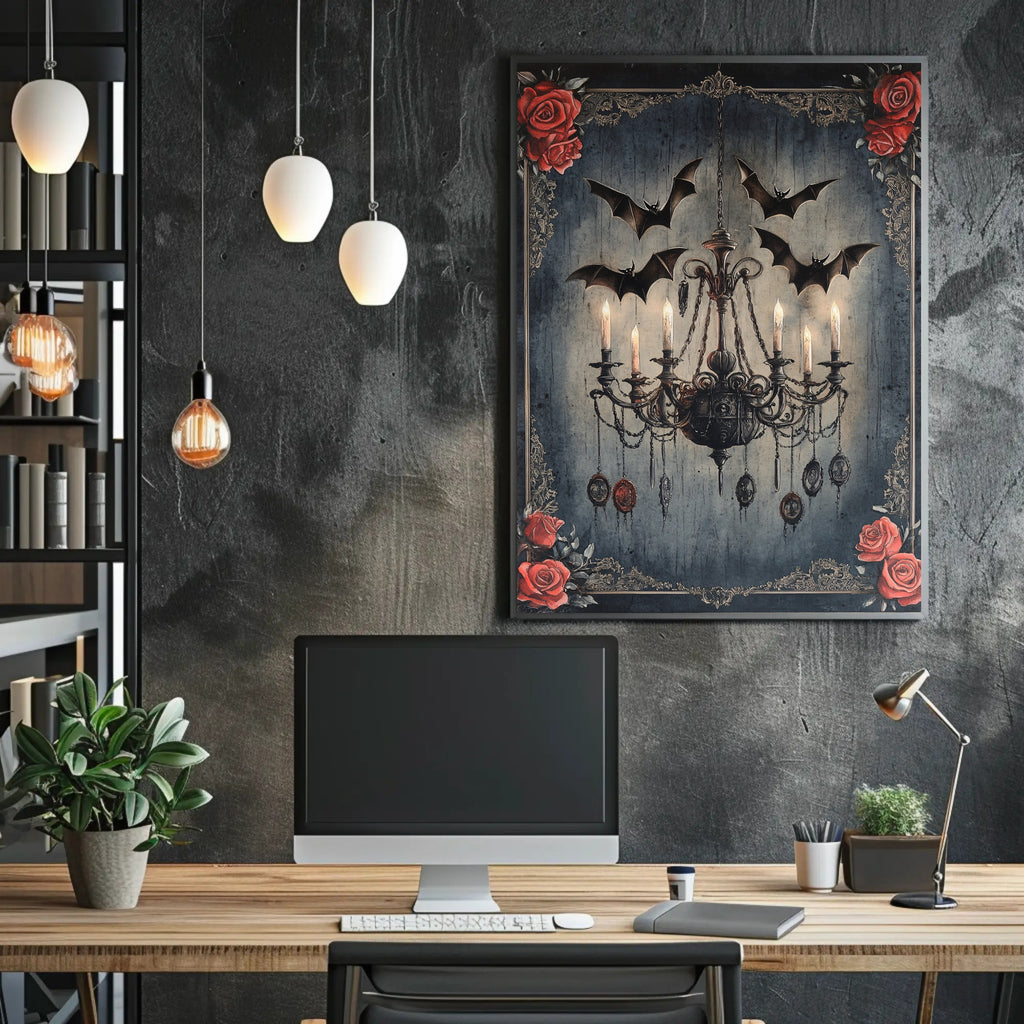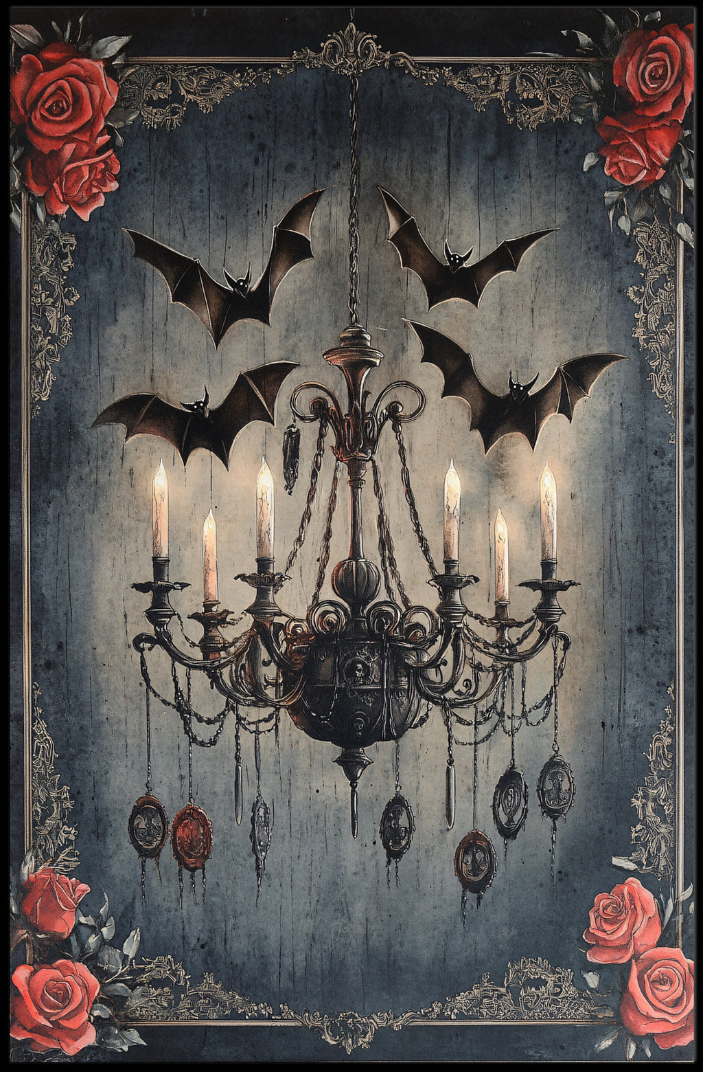 Elevate your walls with the Gothic Elegance Poster from PosterGoat — a photorealism-inspired art print that blends Victorian drama with delicate romance. This striking poster features an ornate, candlelit chandelier suspended against a distressed, shadowed backdrop, flanked by fluttering bats and dripping wax seals, while crimson roses and filigree borders frame the composition for a hauntingly beautiful finish.