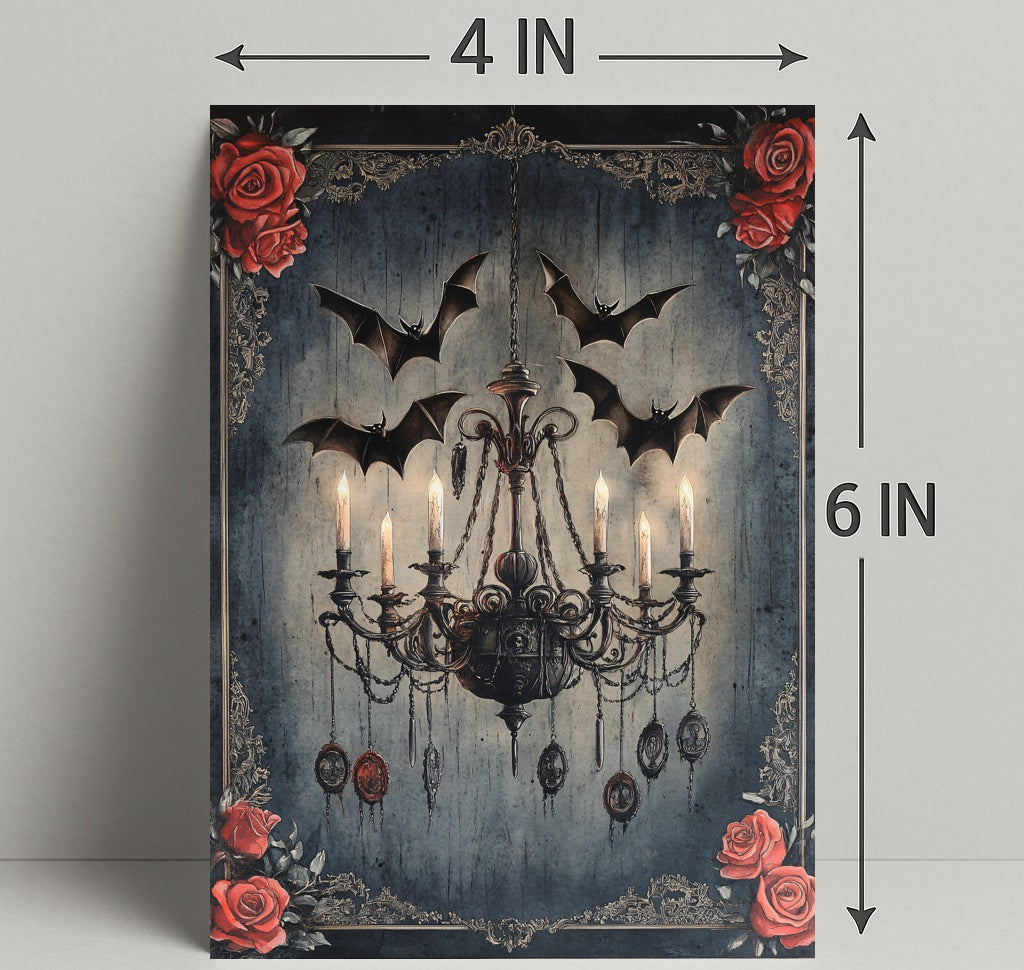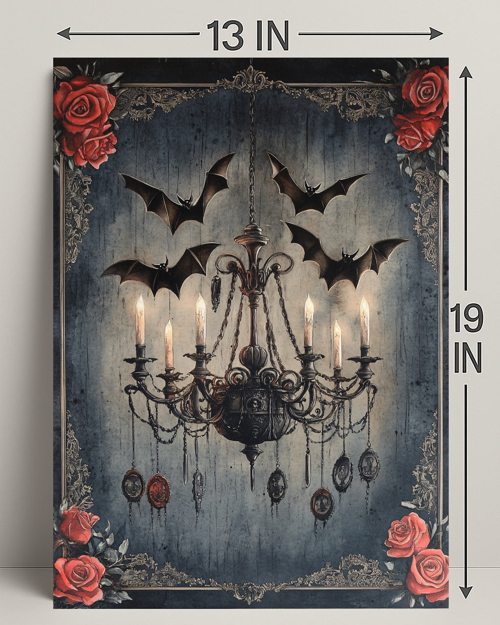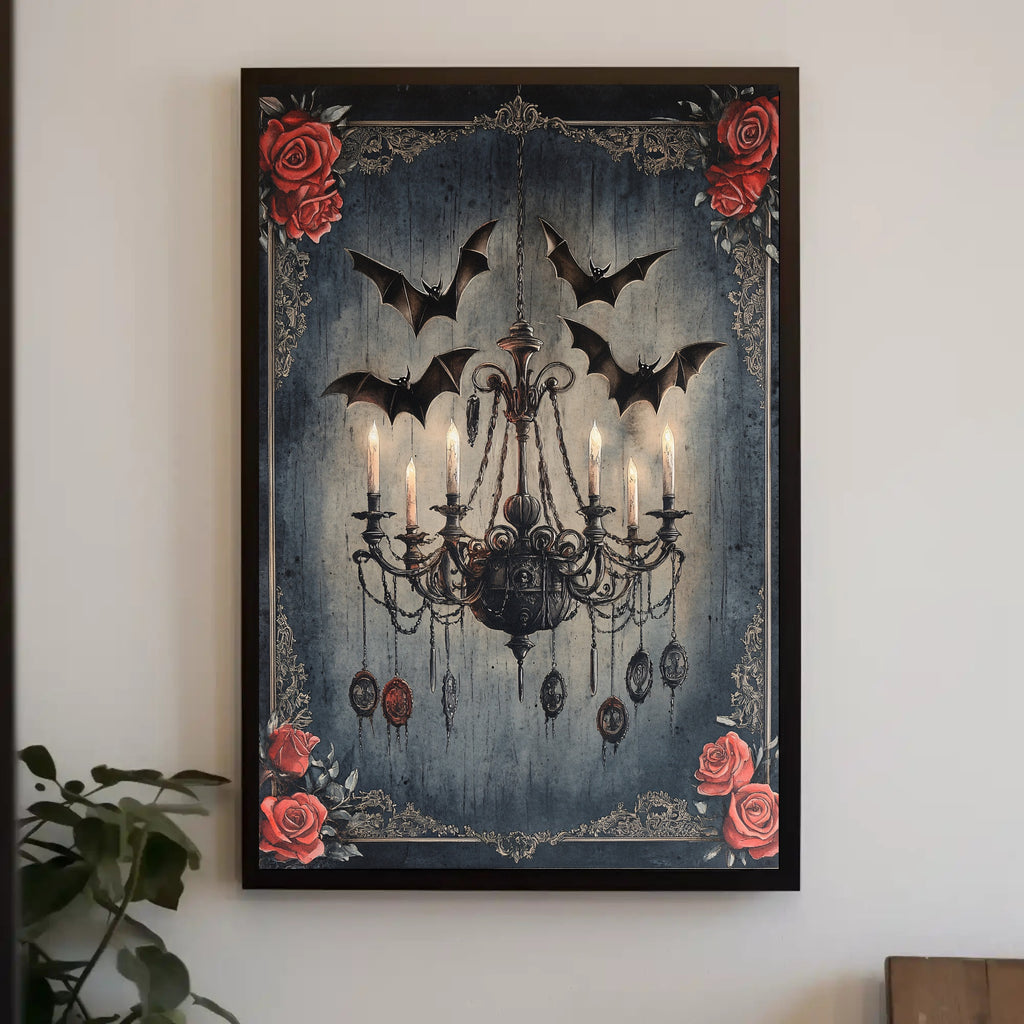 Elevate your walls with the Gothic Elegance Poster from PosterGoat — a photorealism-inspired art print that blends Victorian drama with delicate romance. This striking poster features an ornate, candlelit chandelier suspended against a distressed, shadowed backdrop, flanked by fluttering bats and dripping wax seals, while crimson roses and filigree borders frame the composition for a hauntingly beautiful finish.