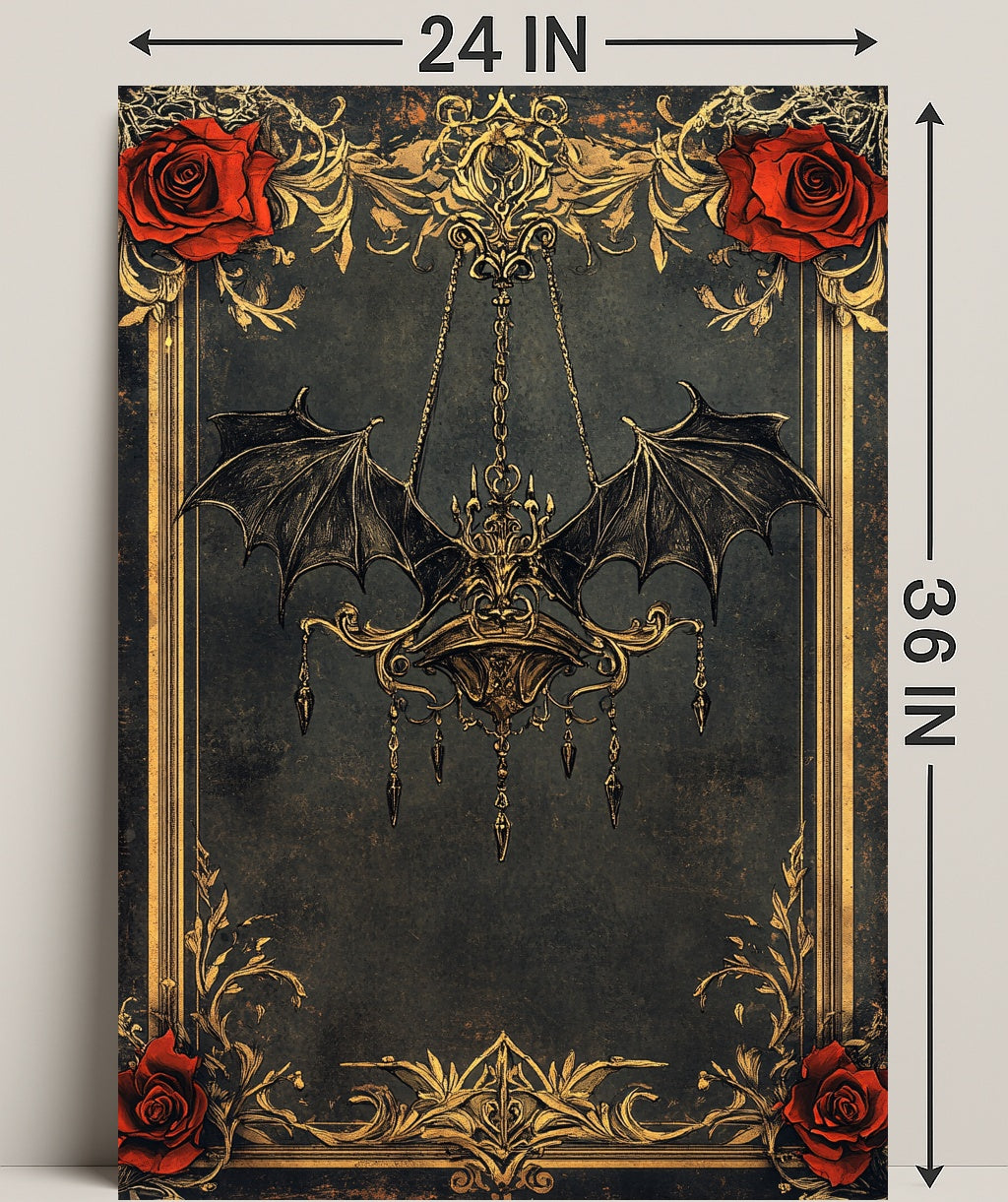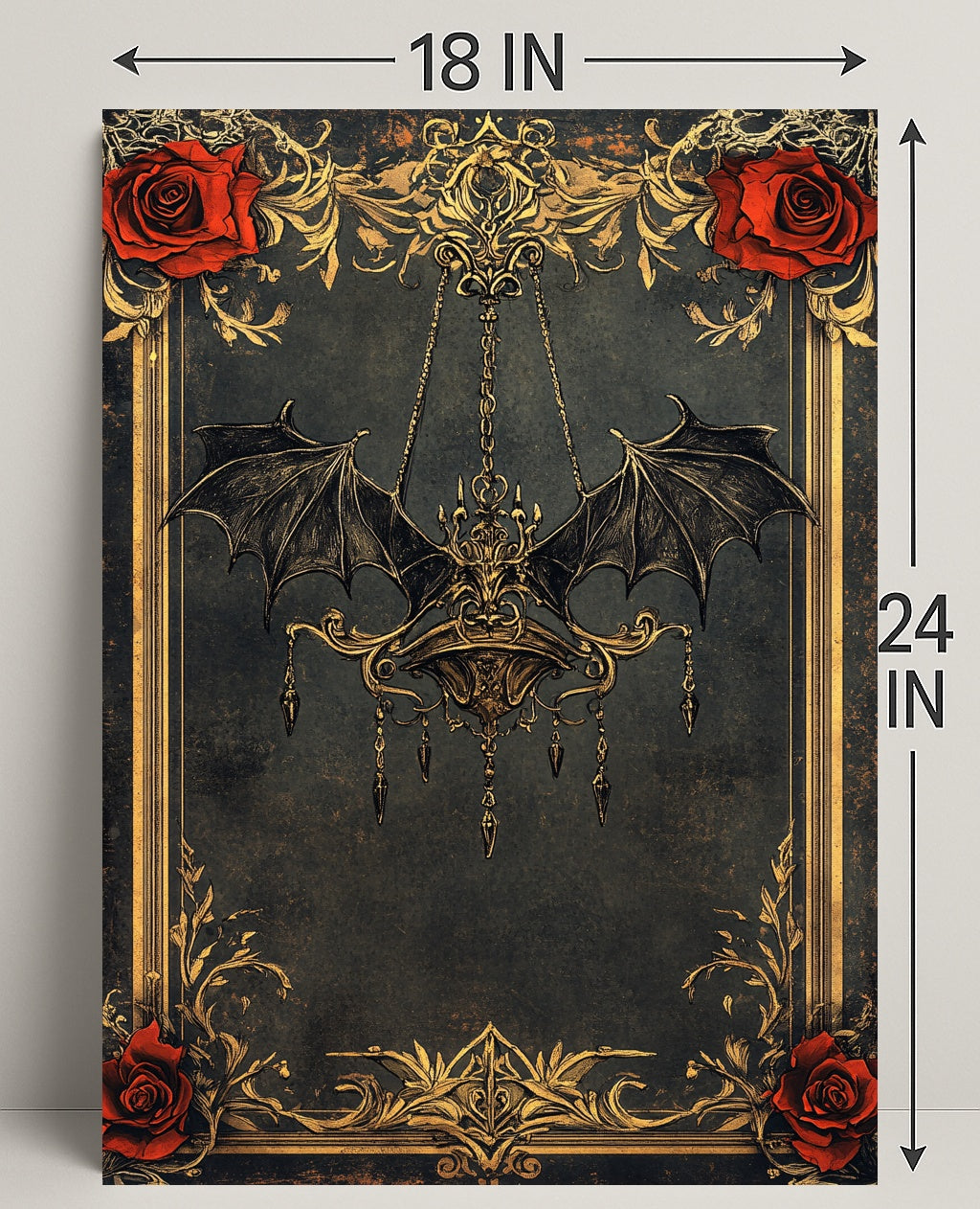 Elevate your walls with the Gothic Elegance Poster from PosterGoat — a dramatic art print that blends Victorian ornamentation with dark, romantic flair. This striking poster features a textured, moody background framed by intricate gold filigree, crimson roses at each corner, and a central bat-wing chandelier that draws the eye and sets an unforgettable atmosphere.