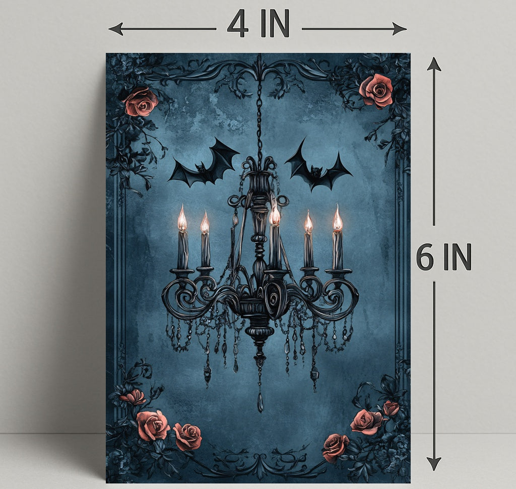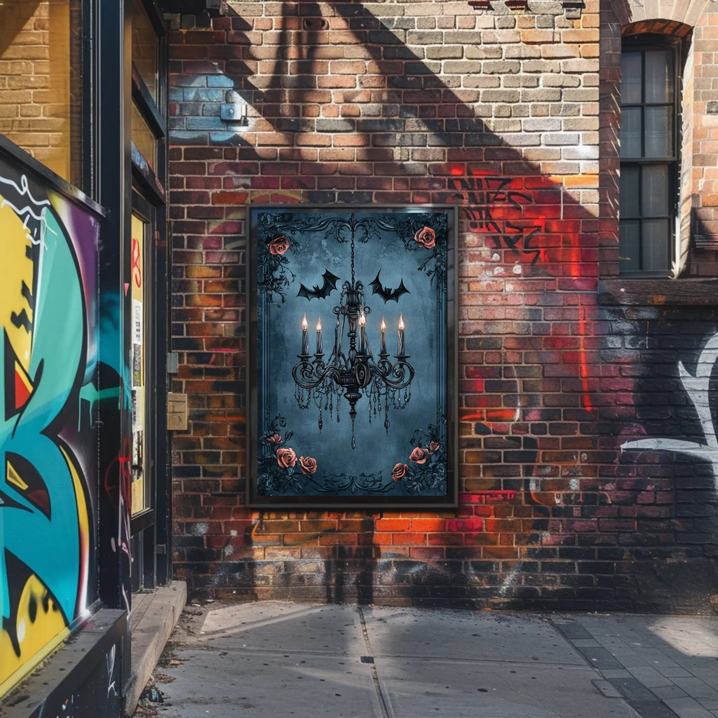 Striking Design: Featuring a gothic chandelier surrounded by roses and bats, this poster is a visual feast that draws the eye and sparks conversation.