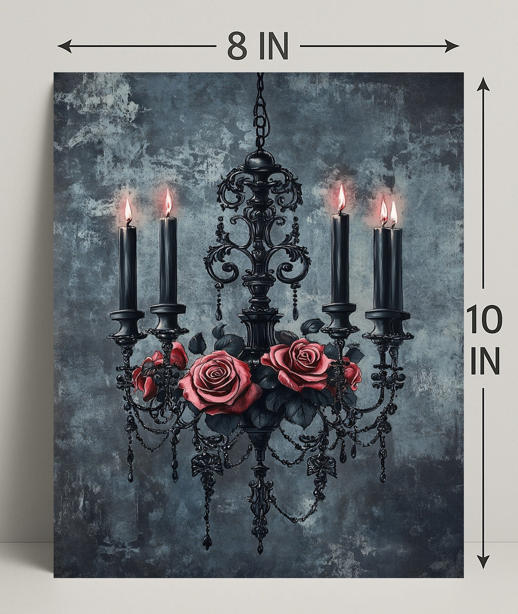 Stunning Artwork: Features a captivating chandelier adorned with vibrant roses, merging elegance with a touch of mystery.