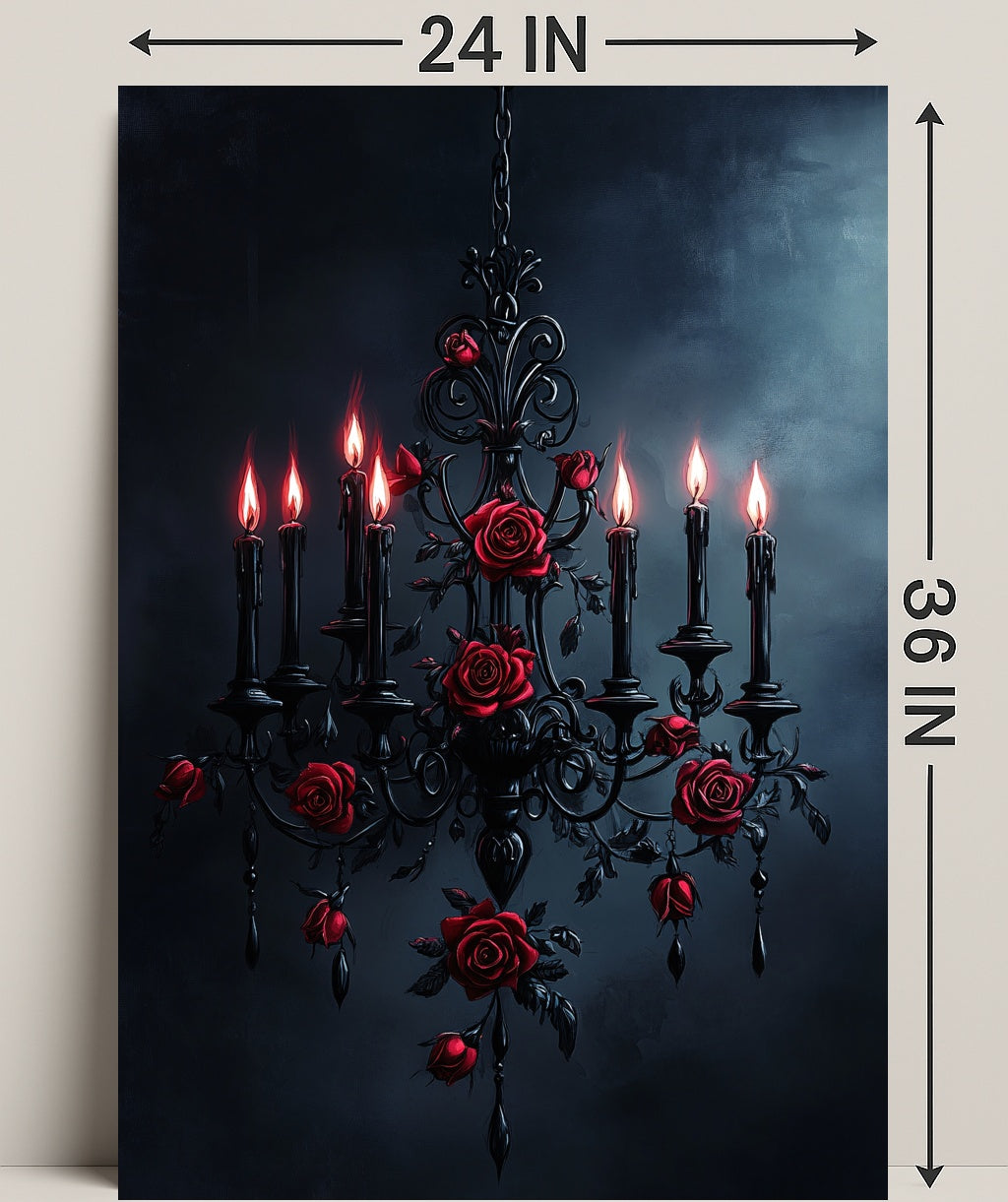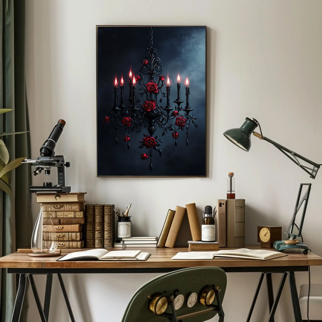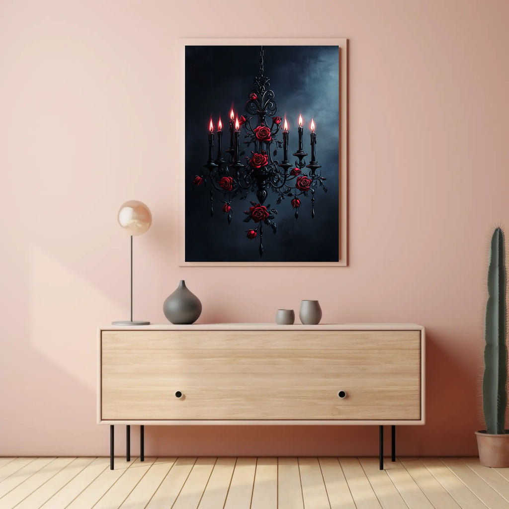 Elevate your walls with the Gothic Elegance Poster from PosterGoat — a moody, high-impact art print that fuses Victorian glamour with dark romance. This striking poster features an ornate black chandelier entwined with crimson roses and glowing candle flames set against a stormy, textured backdrop — a dramatic centerpiece that commands attention in any room.