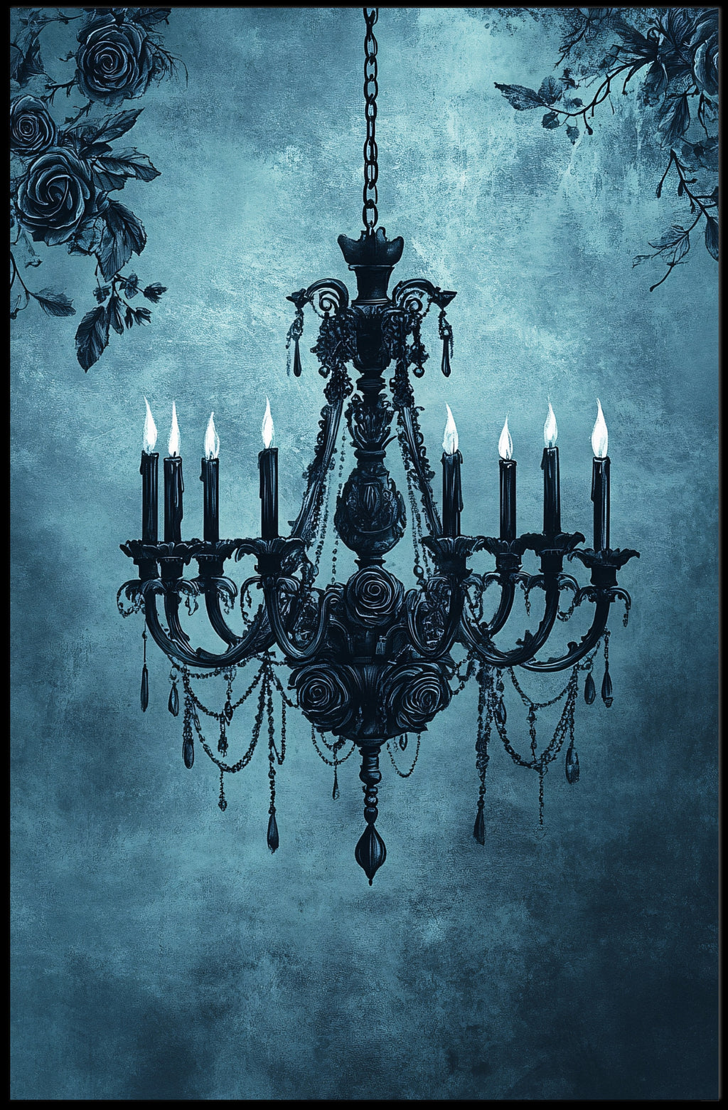Gothic Elegance Poster from PosterGoat brings antique drama and refined darkness to your walls. This striking poster features a detailed vintage collage-style chandelier hung against a textured teal backdrop, accented with delicate rose motifs and flickering candle flames — a perfect blend of gothic charm and polished elegance for any home or seasonal display.