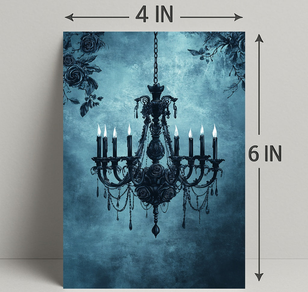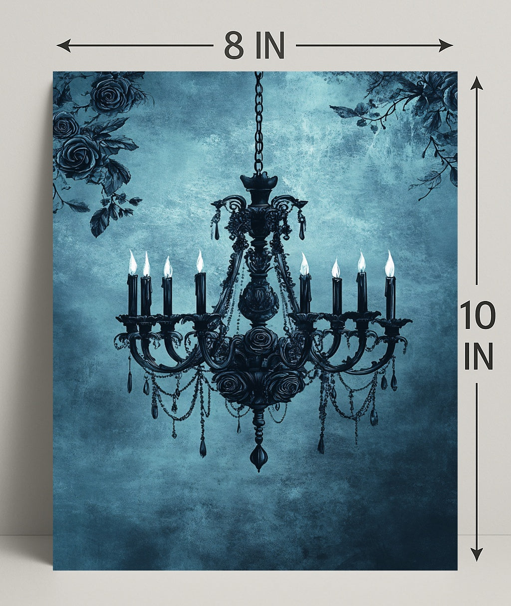 Designed for decor lovers, collectors, and seasonal stylists, this print transforms living rooms, bedrooms, hallways, and office spaces into moody, sophisticated interiors. The high-contrast silhouette of the ornate chandelier and the subtle floral corners create a focal point that feels both classic and contemporary.