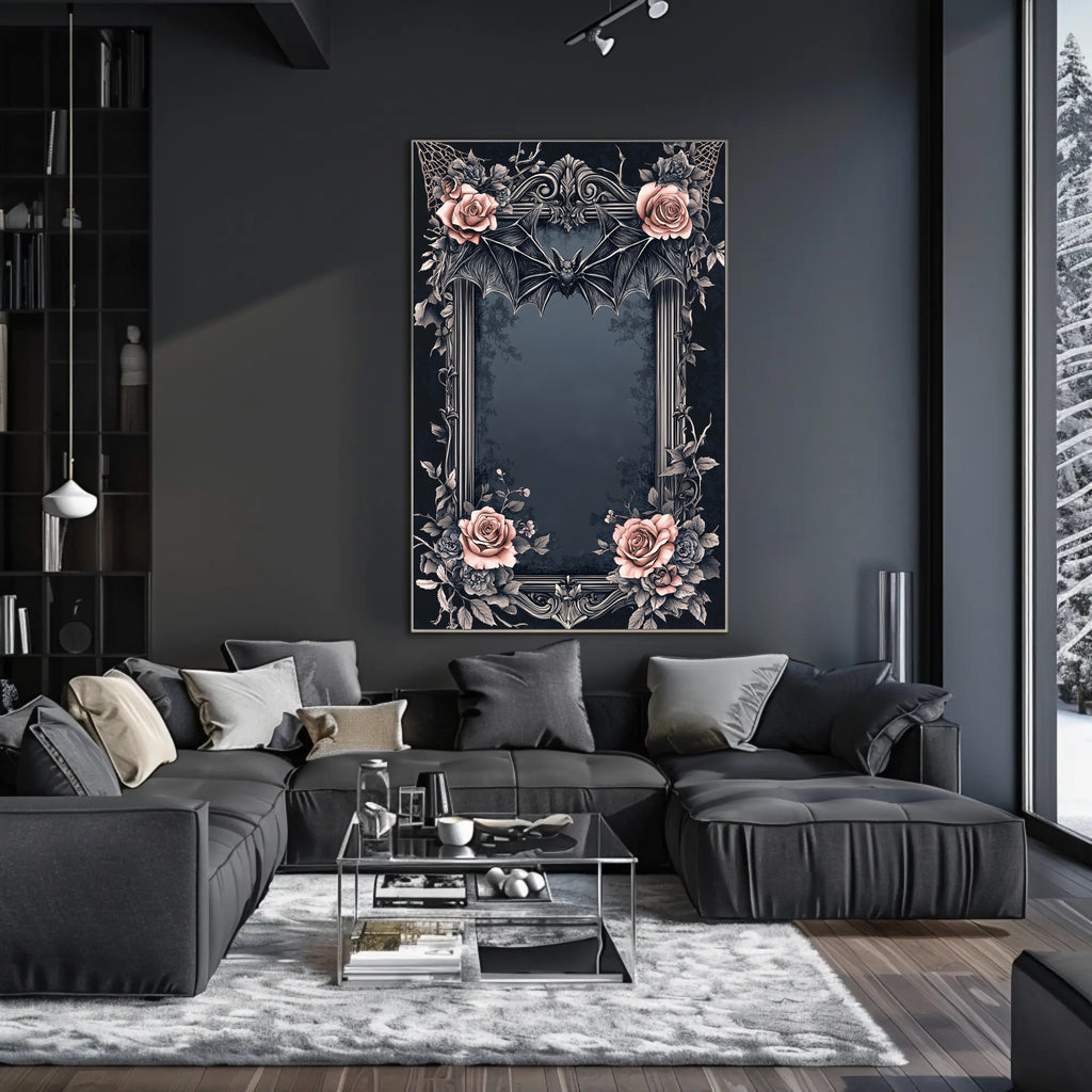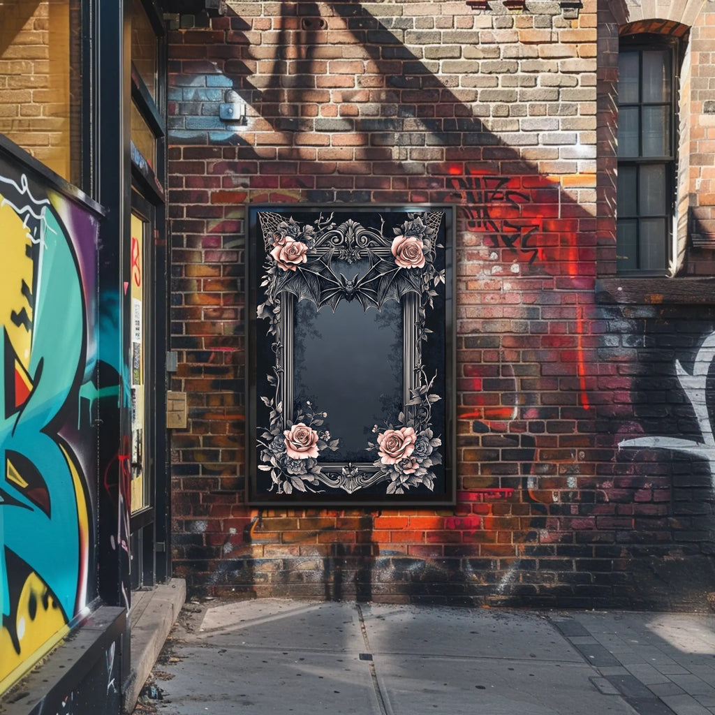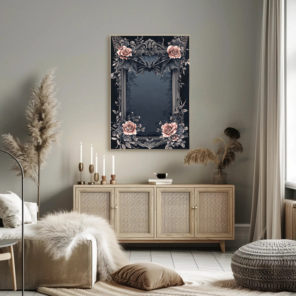 This Gothic Elegance Poster is more than a print — it’s a mood creator. Use it to add atmospheric depth to modern minimal interiors or to complete a vintage, Halloween-inspired vignette. The muted palette with blush highlights pairs beautifully with both dark frames and light, contemporary surroundings as shown, offering versatile styling options.