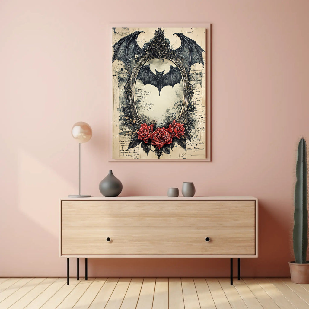 Elevate your interior with the Gothic Elegance Poster from PosterGoat — a dramatic, vintage-collage wall art piece that blends Victorian ornamentation with dark romanticism. Detailed inkwork reveals a haunting bat mirrored within an ornate oval frame, accented by blood-red roses and handwritten script for a timeless, moody statement that transforms any room into an artful sanctuary.