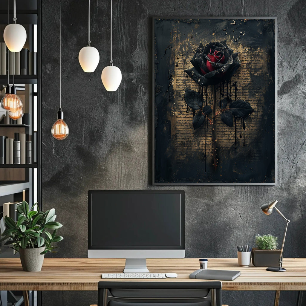 Gothic Romantic Rose on Aged Manuscript Artistic Poster — a darkly beautiful statement print from PosterGoat that fuses photorealism with vintage charm. This striking poster places a red-centered black rose against an aged manuscript backdrop, accented by ink drips, glistening water droplets and gold-flecked textures for a dramatic, mysterious effect.