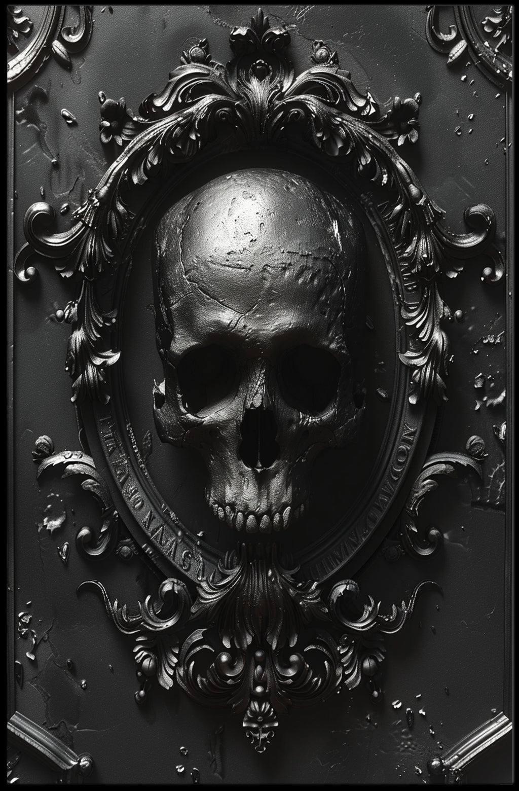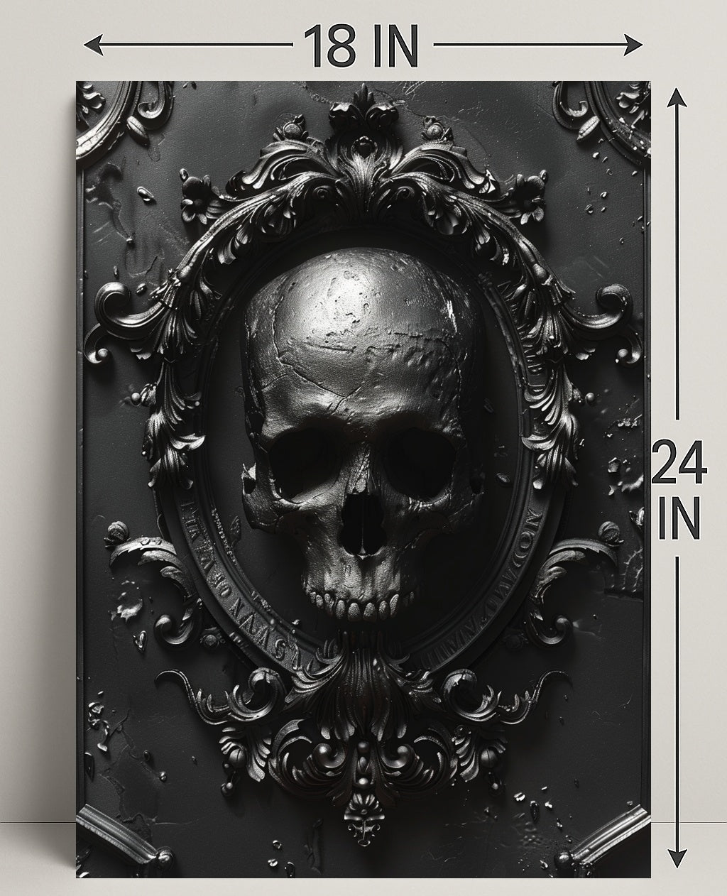 Dark, dramatic, and impossibly detailed — the Gothic Skull Emblem Poster from PosterGoat brings baroque gothic elegance into modern interiors. A sculpted skull set within an ornate oval emblem creates a striking focal point that reads like carved metal: deep shadows, textured highlights, and meticulous ornamental flourishes make this piece a conversation-starting addition to any room.