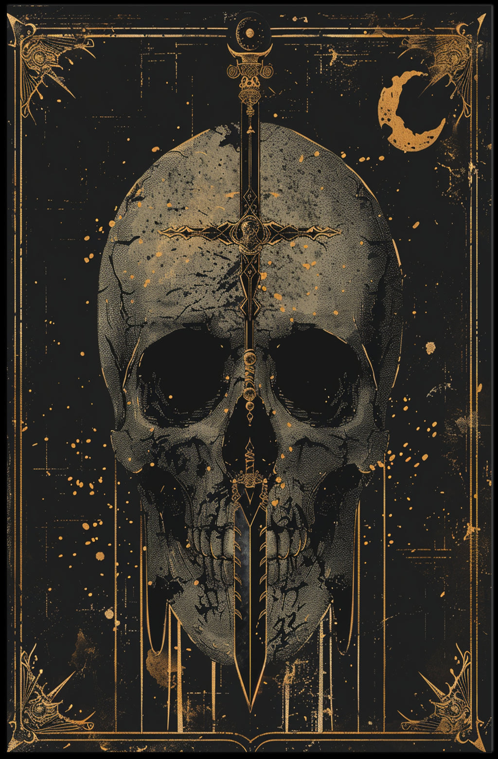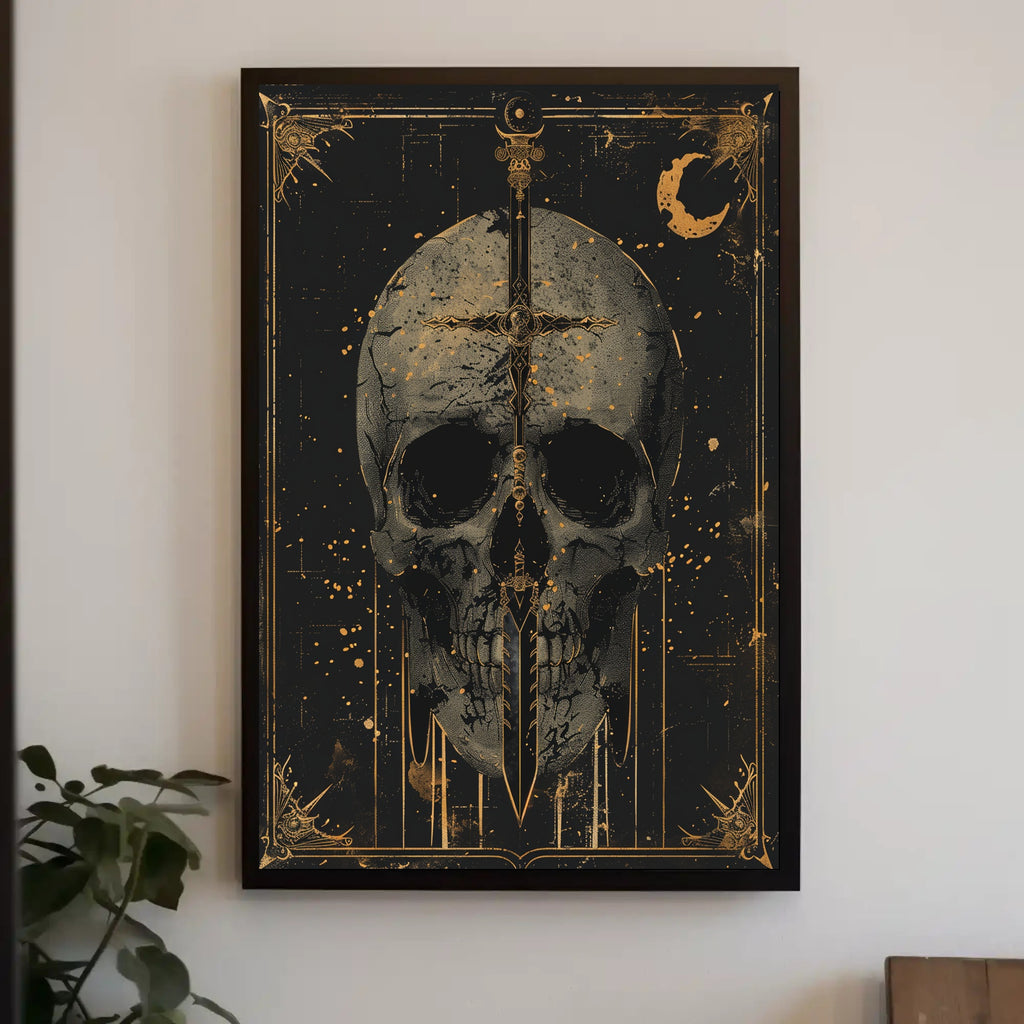 This striking wall art features a finely detailed skull pierced by an intricately decorated sword running vertically through the center, framed by delicate decorative borders, celestial motifs and gold splatter accents on a deep black background. The high-contrast black and gold palette and distressed, vintage collage style create an eerie allure perfect for gothic art lovers and collectors of mystical decor.
