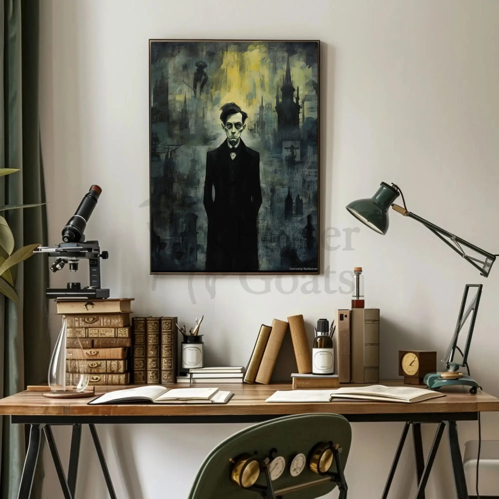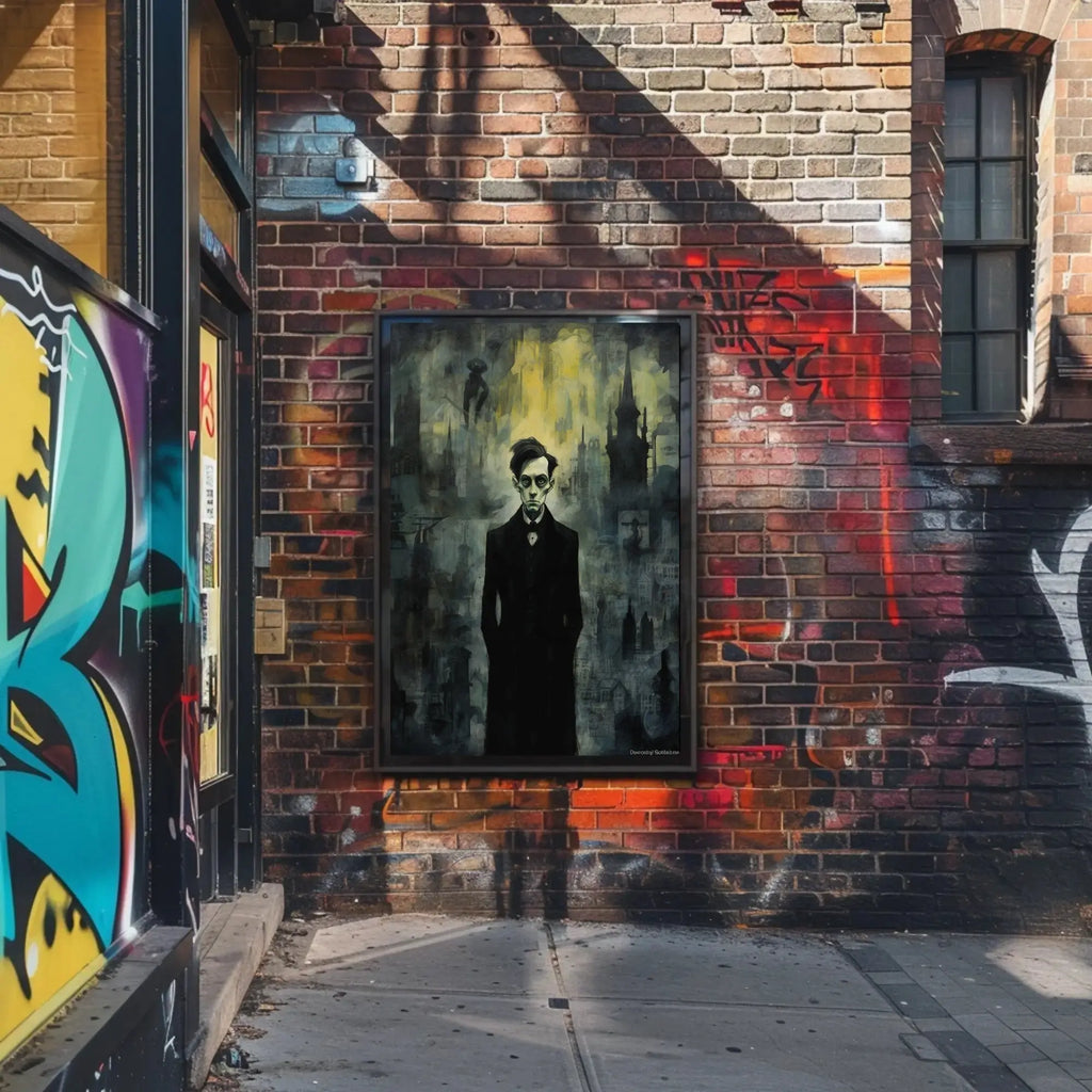 Bring a haunting, artful presence to your walls with the Gothic Victorian Solitude Atmospheric Artistic Culture Poster from PosterGoat. This atmospheric poster captures a solitary, gaunt figure in a long Victorian coat standing against an evocative, mist-filled cityscape—layers of spires, shadowed buildings and washed-out architectural motifs drift into a pale yellow-green glow, creating a mood that is equal parts mysterious and mesmerizing.
