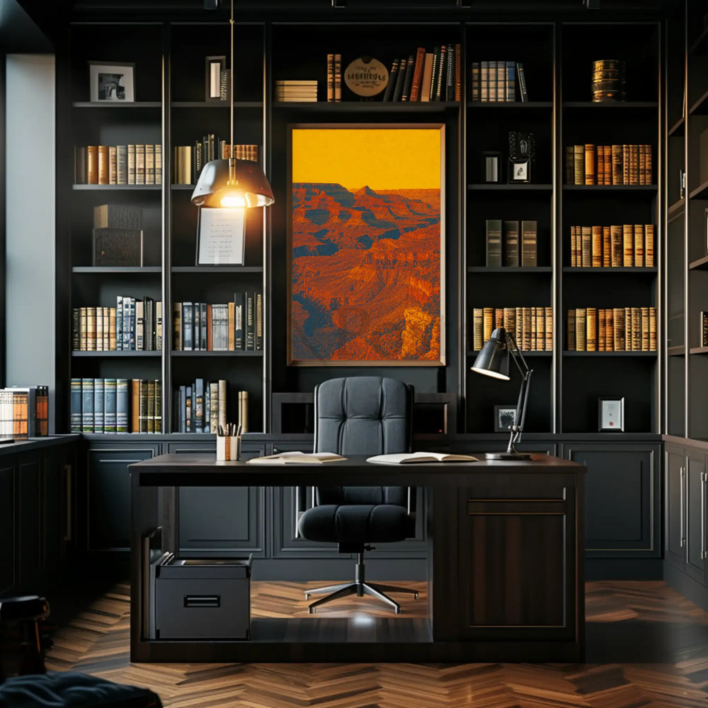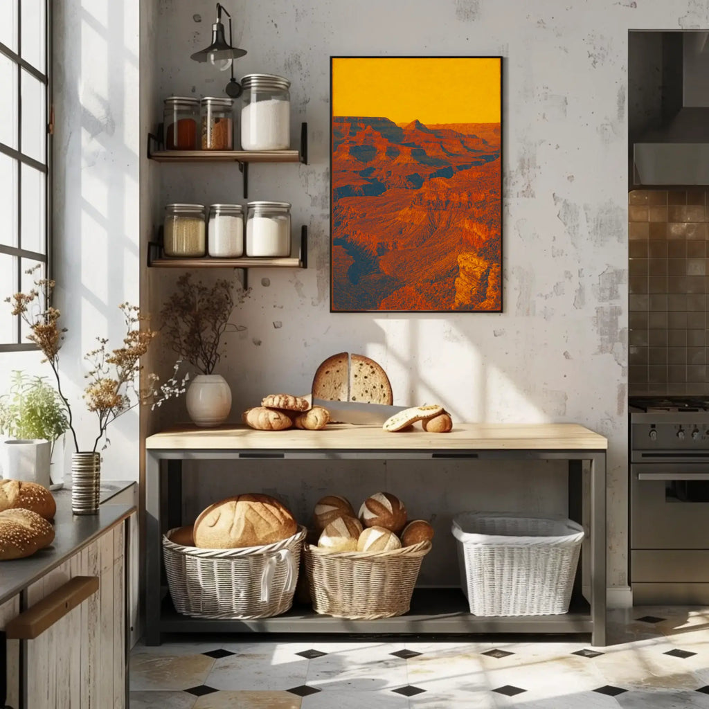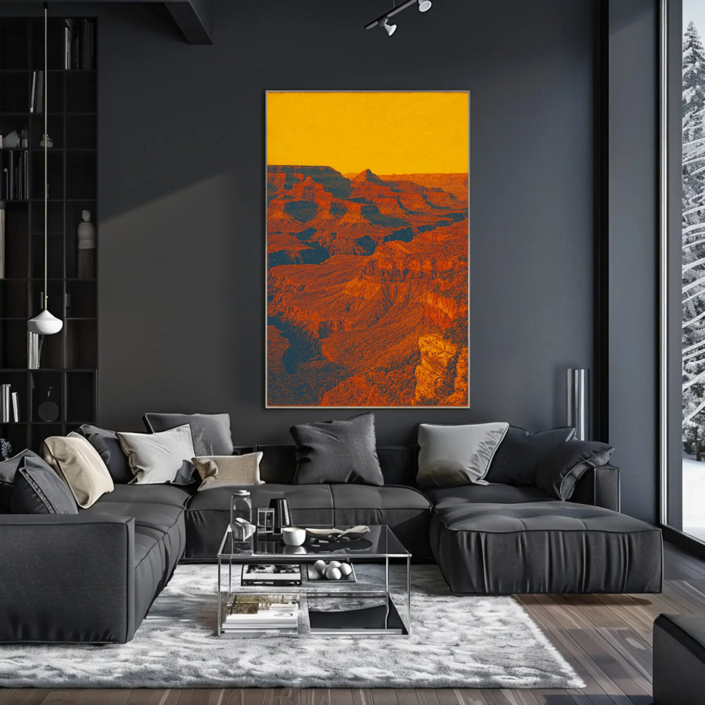 Bring the timeless grandeur of the Grand Canyon into your living space with this Grand Canyon Vintage Travel Art National Park Poster by PosterGoat. Rendered in bold, warm colors and a retro pop-art style, the poster transforms the canyon's rugged cliffs and layered formations into a stylized landscape that commands attention on any wall.