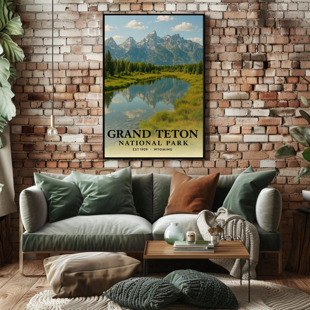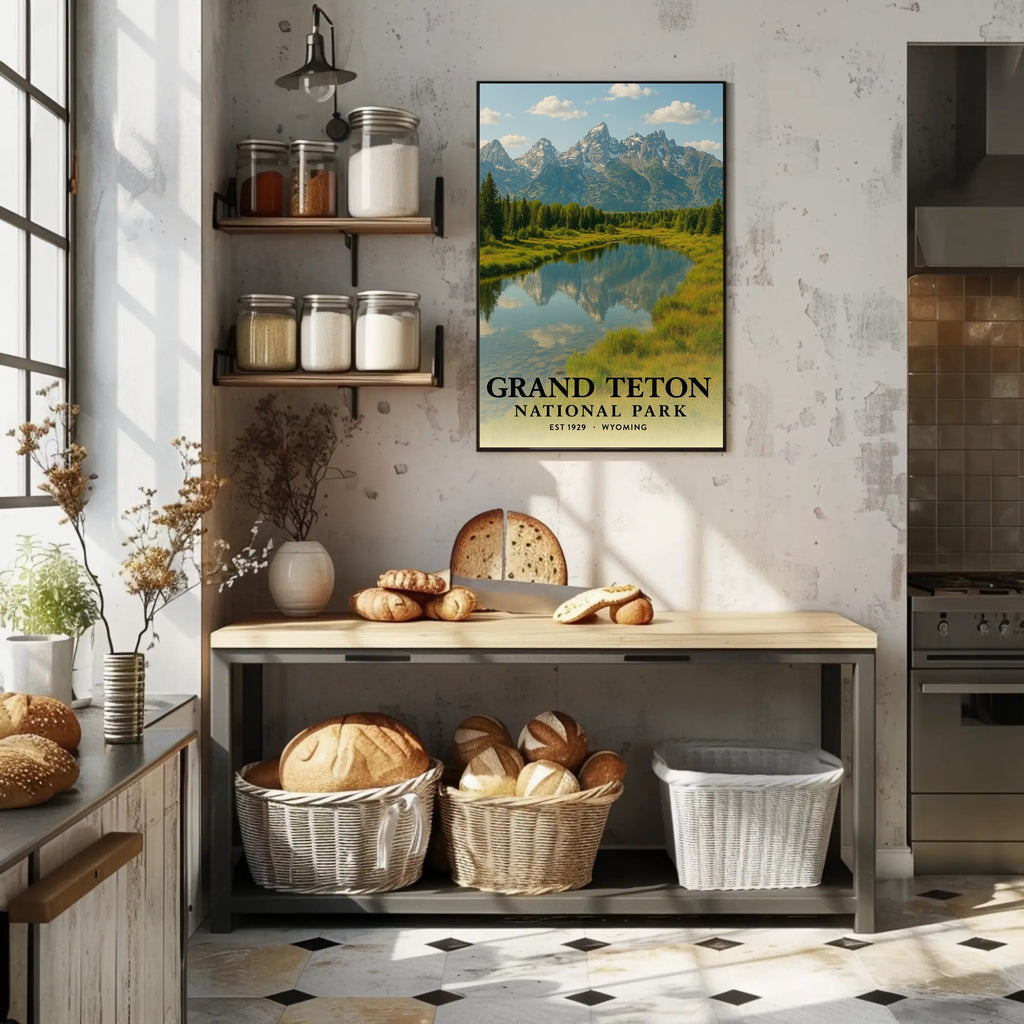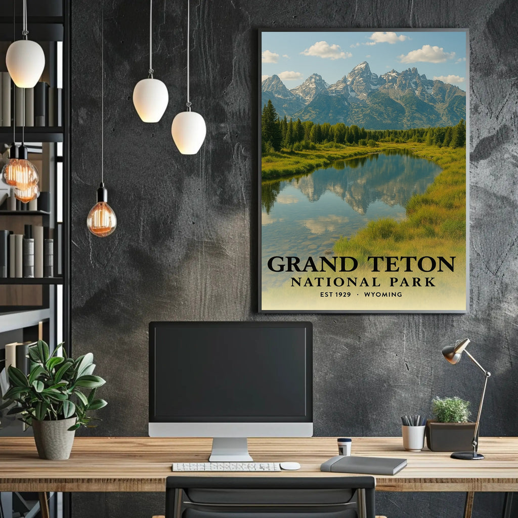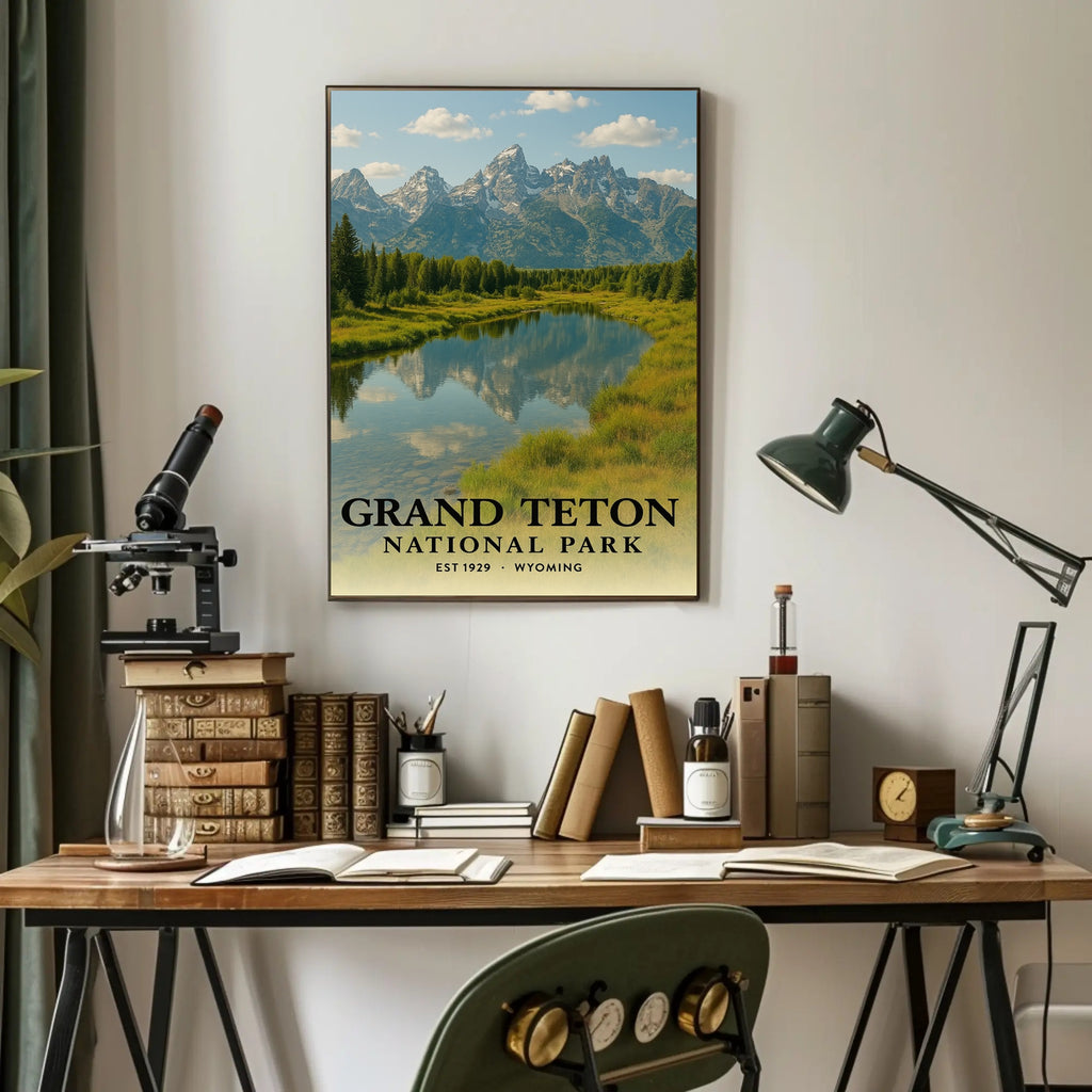 Classic travel-poster styling: Bold, vintage typography reading “GRAND TETON NATIONAL PARK — EST 1929 • WYOMING” adds nostalgic charm and makes the print a standout piece of decor.