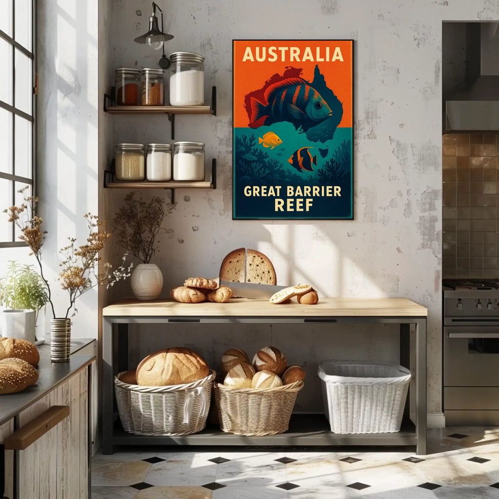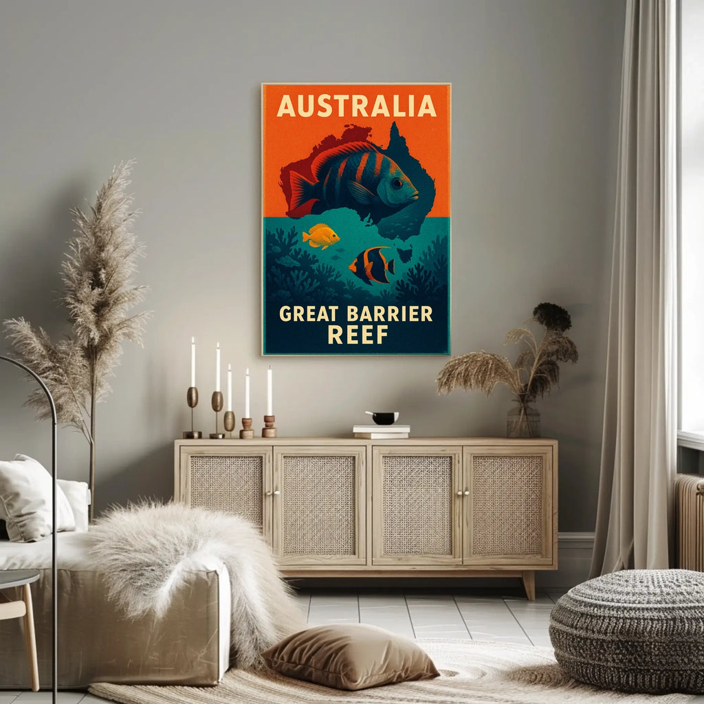 Discover the breathtaking allure of the Great Barrier Reef with this vibrant vintage travel poster. Featuring a striking illustration of vivid marine life, the design centers on a large fish overlaying a silhouette of Australia. Smaller, colorful fishes swim among the enchanting coral reefs, all depicted with bold colors and simplified forms to enhance its retro appeal. This art piece captures the essence of adventure, discovery, and Australia's natural beauty, making it a captivating homage to one of the world's most iconic destinations. An ideal choice for travelers and nature enthusiasts seeking artistic inspiration.