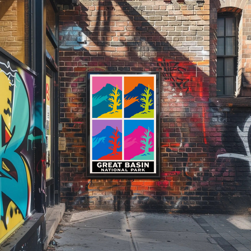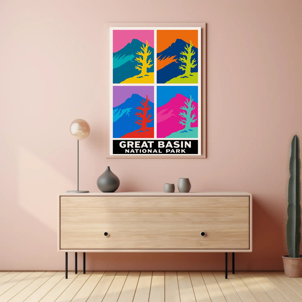 Great Basin National Park Poster from PosterGoat — a bold, minimalist poster that brings a pop-art celebration of Great Basin National Park into your home. This 18x24 poster captures the park's iconic silhouette and bristlecone pine in four vibrant color panels, creating a modern travel-art statement for any room.