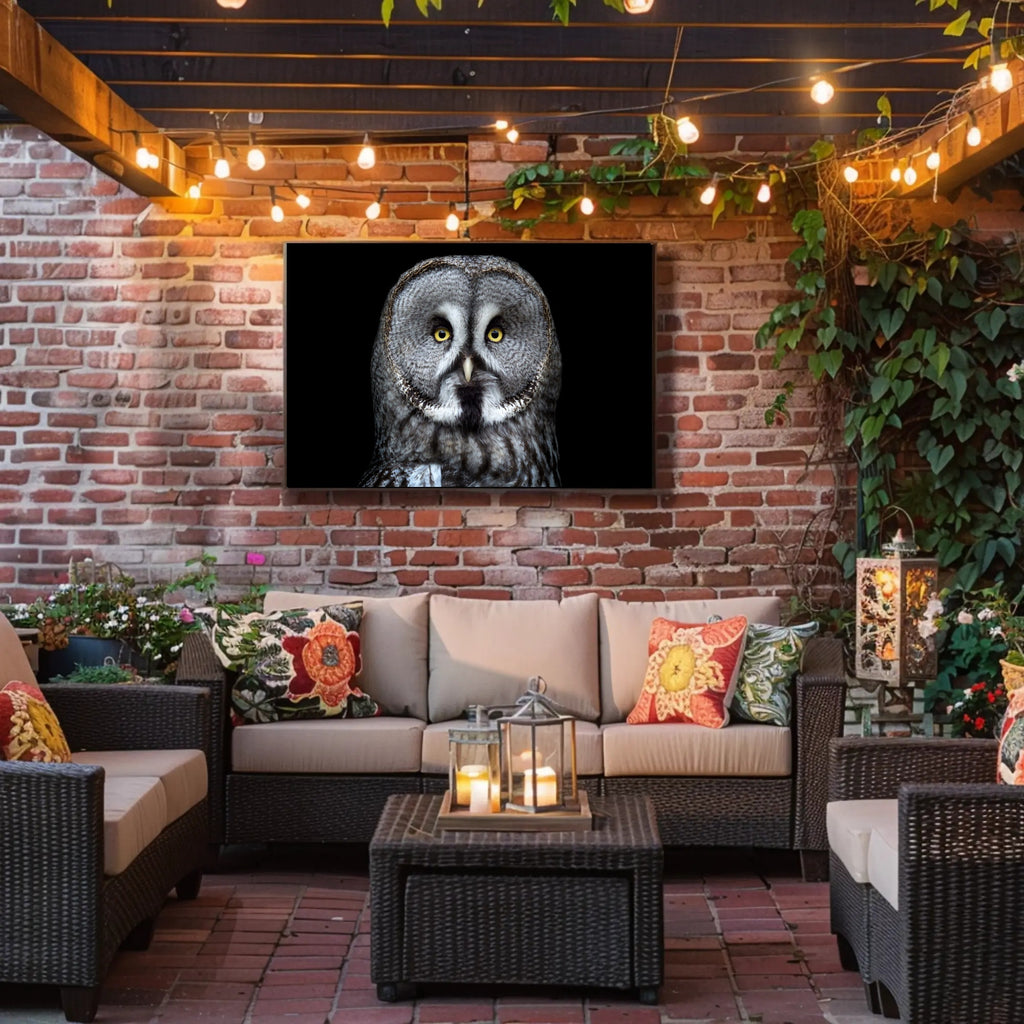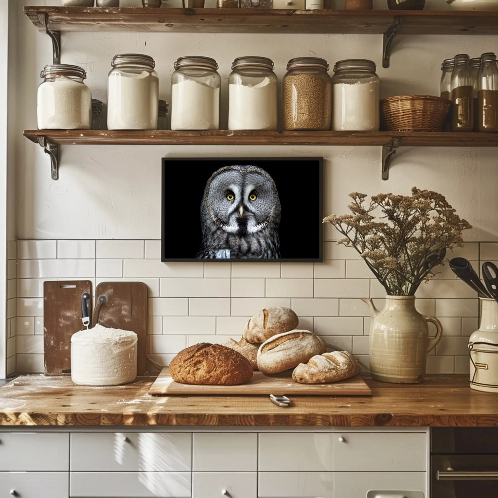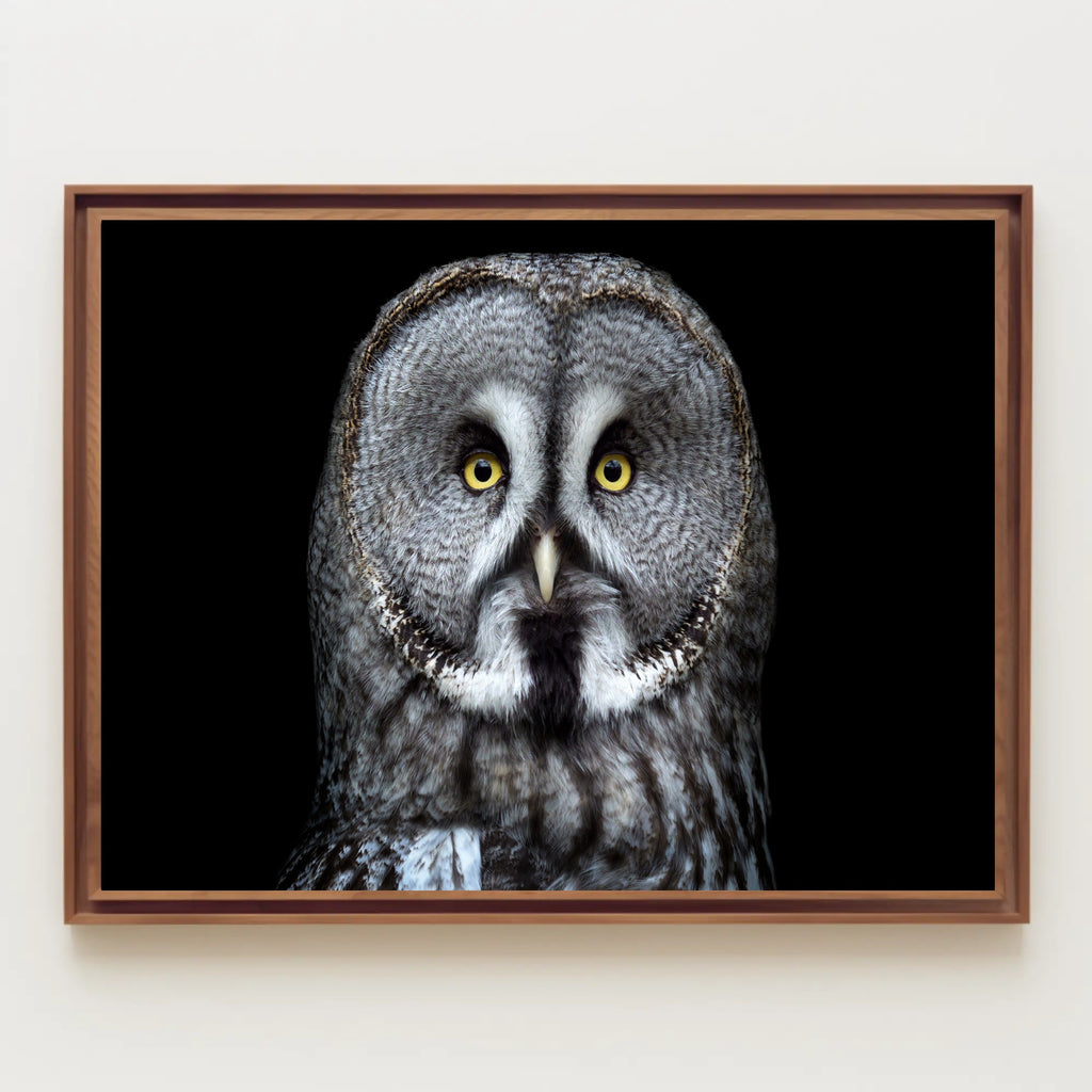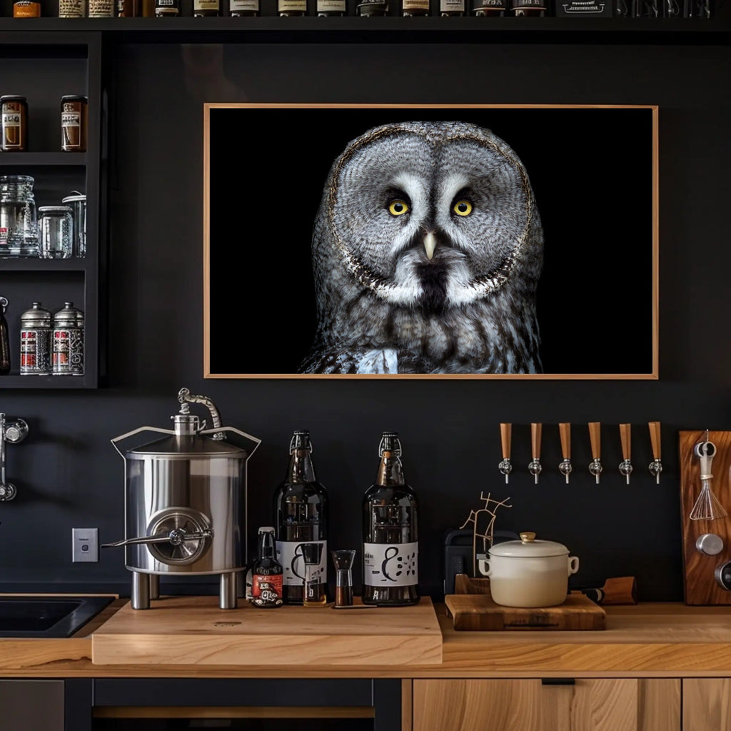 Immerse your space in the majesty of nature with this stunning Great Grey Owl close-up poster. The image centers on the owl's penetrating yellow eyes, capturing a moment of wild beauty against a stark black background. Designed to attract and captivate, this poster accentuates the intricate details of the owl's feathers, offering an elegant glimpse into the enigmatic world of nocturnal birds. Perfect for wildlife enthusiasts or those looking to introduce a sophisticated and attention-grabbing piece to their home or office décor. Elevate your environment with this striking depiction of natural grace and mystery.