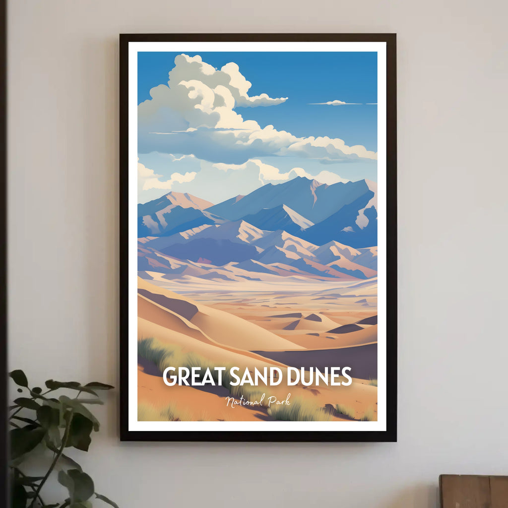 This Great Sand Dunes travel poster makes an ideal gift for hikers, nature lovers and anyone who appreciates national park art and desert wall art. Add a touch of scenic wanderlust to your walls — order your PosterGoat print today and transform your space with iconic Great Sand Dunes imagery.