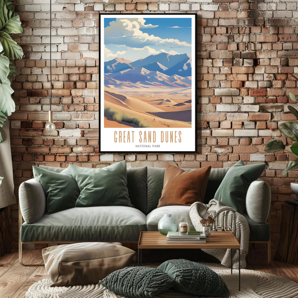Bring the majestic sweep of Great Sand Dunes National Park into your home or office with this PosterGoat scenic poster print. A minimalist, artful landscape captures sunlit sand waves, distant blue mountains and towering clouds in a clean, vintage-inspired composition — complete with the bold “GREAT SAND DUNES” title and crisp white border for gallery-ready display.