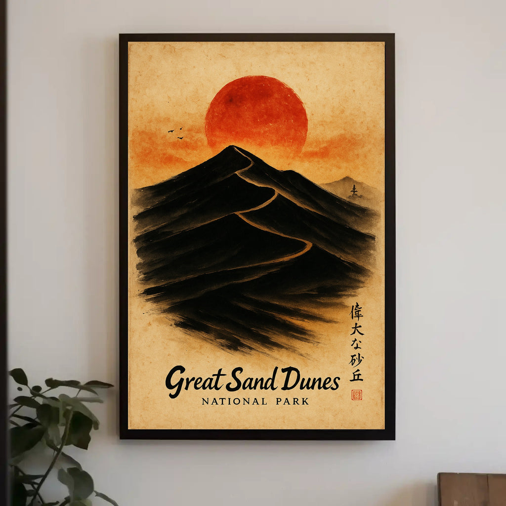 Bring the serene sweep of the Great Sand Dunes into your home with the Great Sand Dunes Tranquil National Park Artistic Poster by PosterGoat. This minimalist, Japanese ink–inspired print pairs bold, sweeping black dunes with a striking red sun and an aged paper texture to create a timeless, meditative focal point for any room.