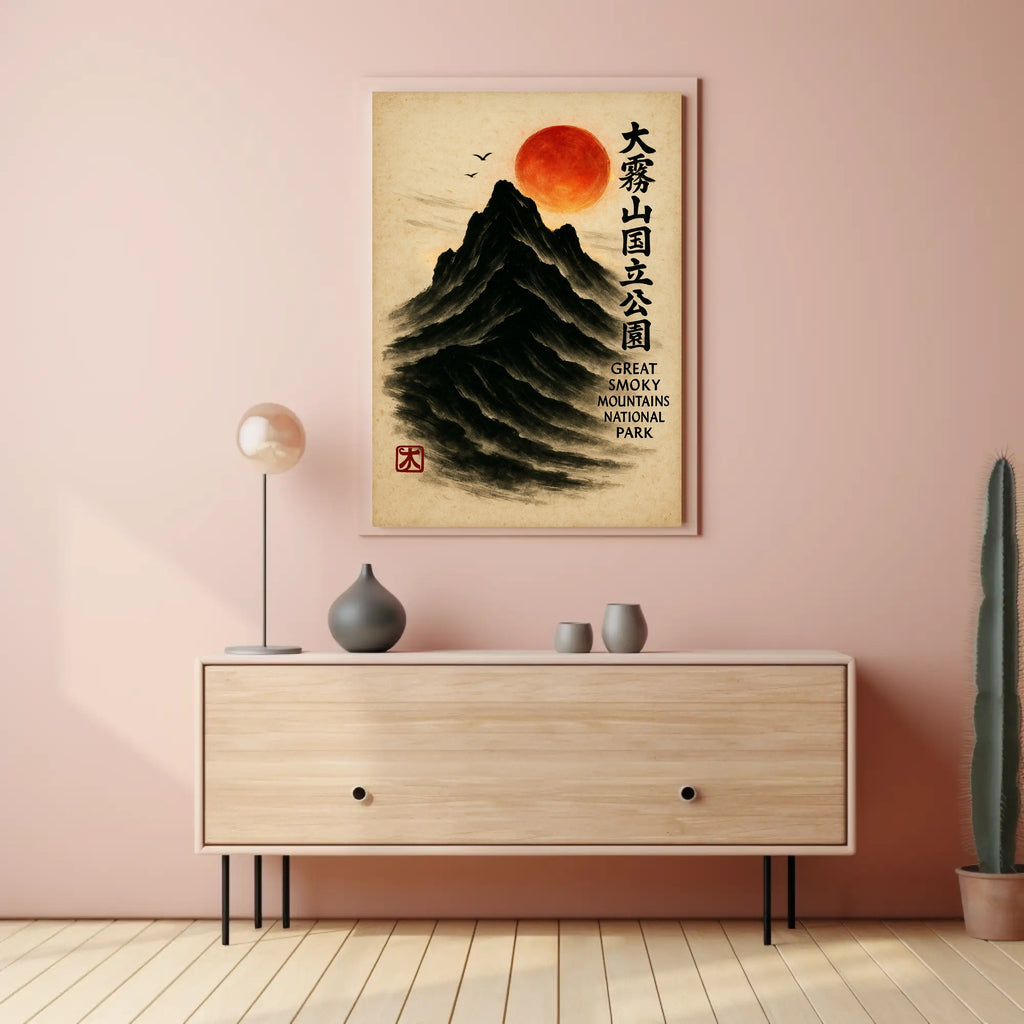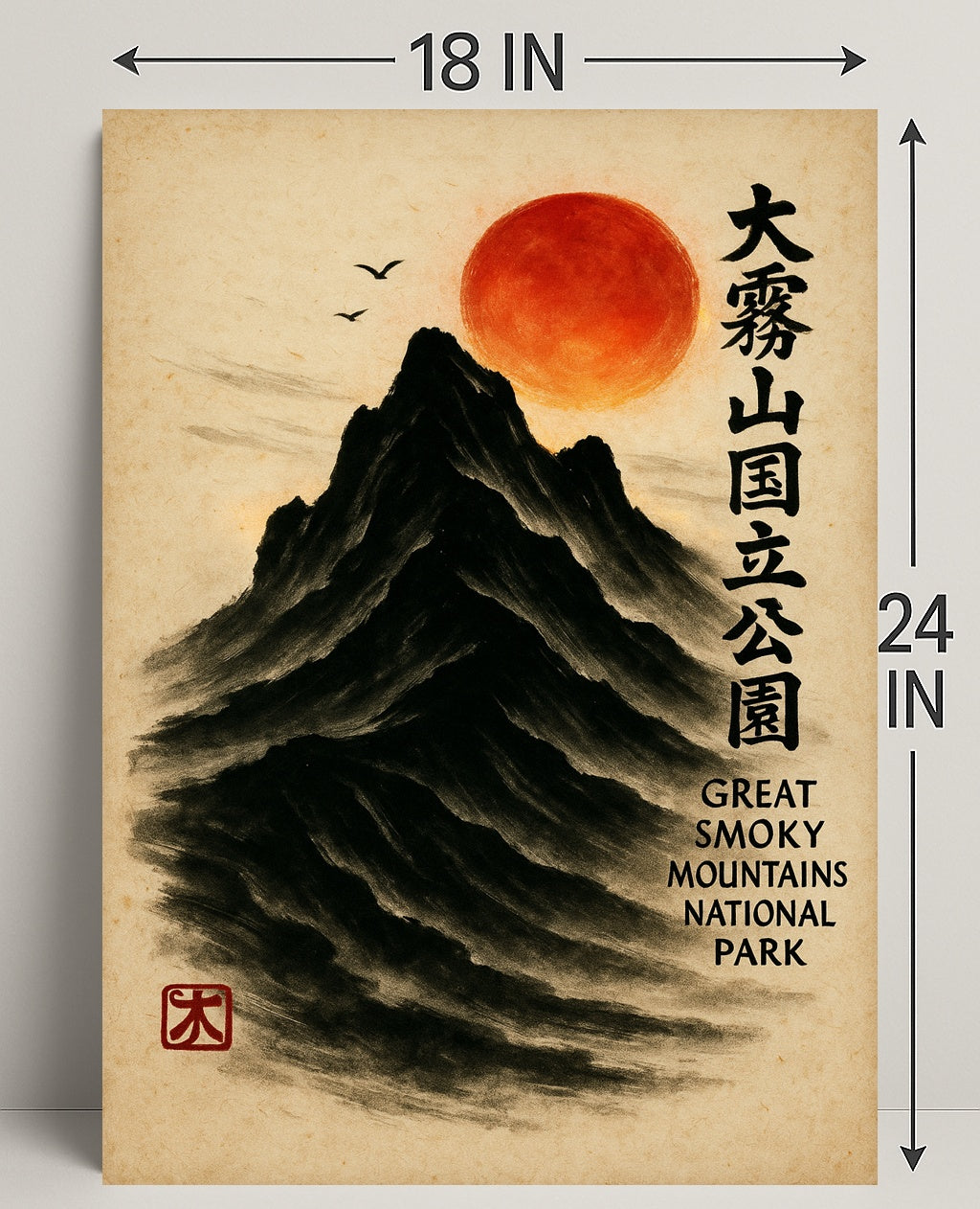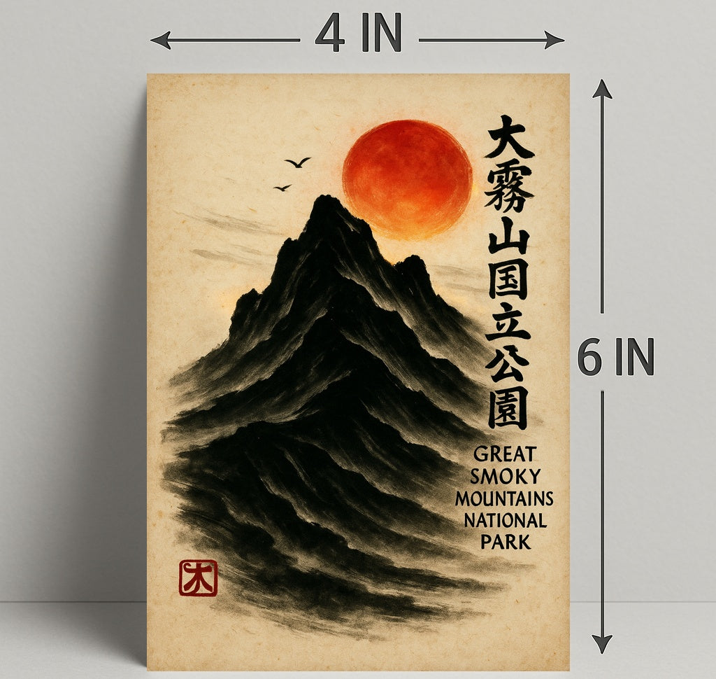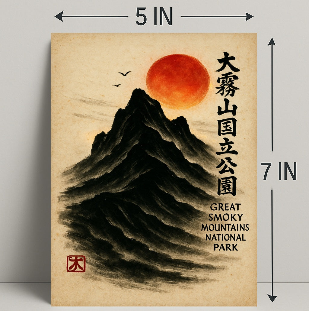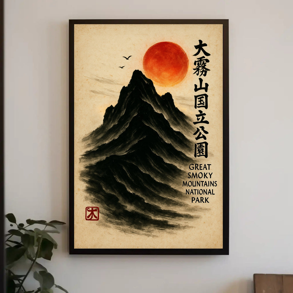 Bring a serene fusion of East Asian painting and Appalachian majesty into your home with the Great Smoky Mountains Cultural Heritage Artistic Poster from PosterGoat. Rendered in a minimalist sumi-e style, this poster depicts a towering black mountain carved from soft brushstrokes, a glowing red sun hovering above, delicate birds in flight, and elegant vertical calligraphy that celebrates the Great Smoky Mountains National Park. The textured parchment background and traditional red artist seal give this print an authentic, timeless feel.