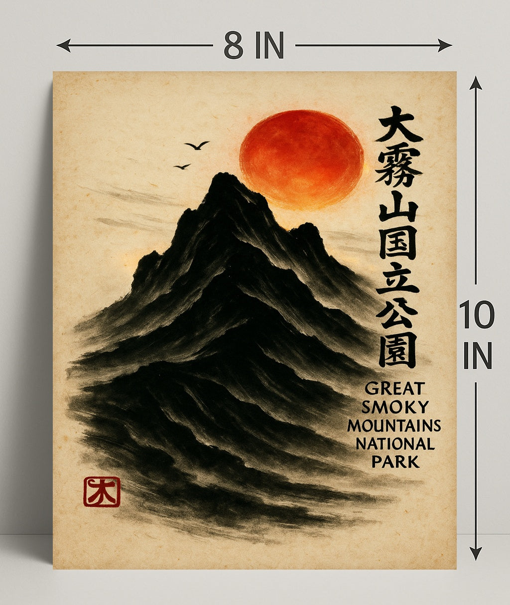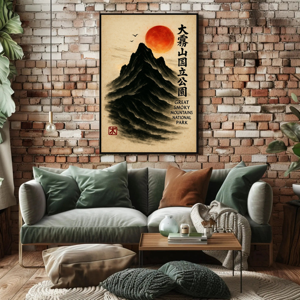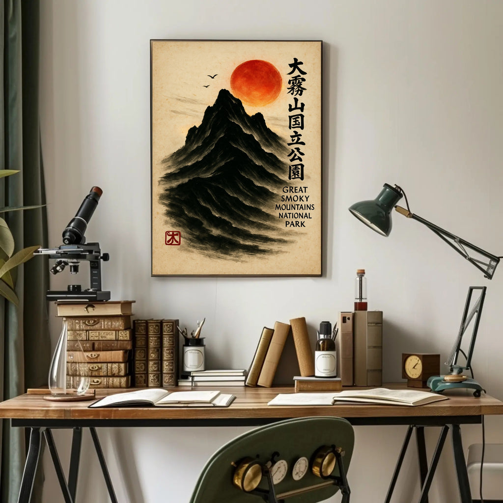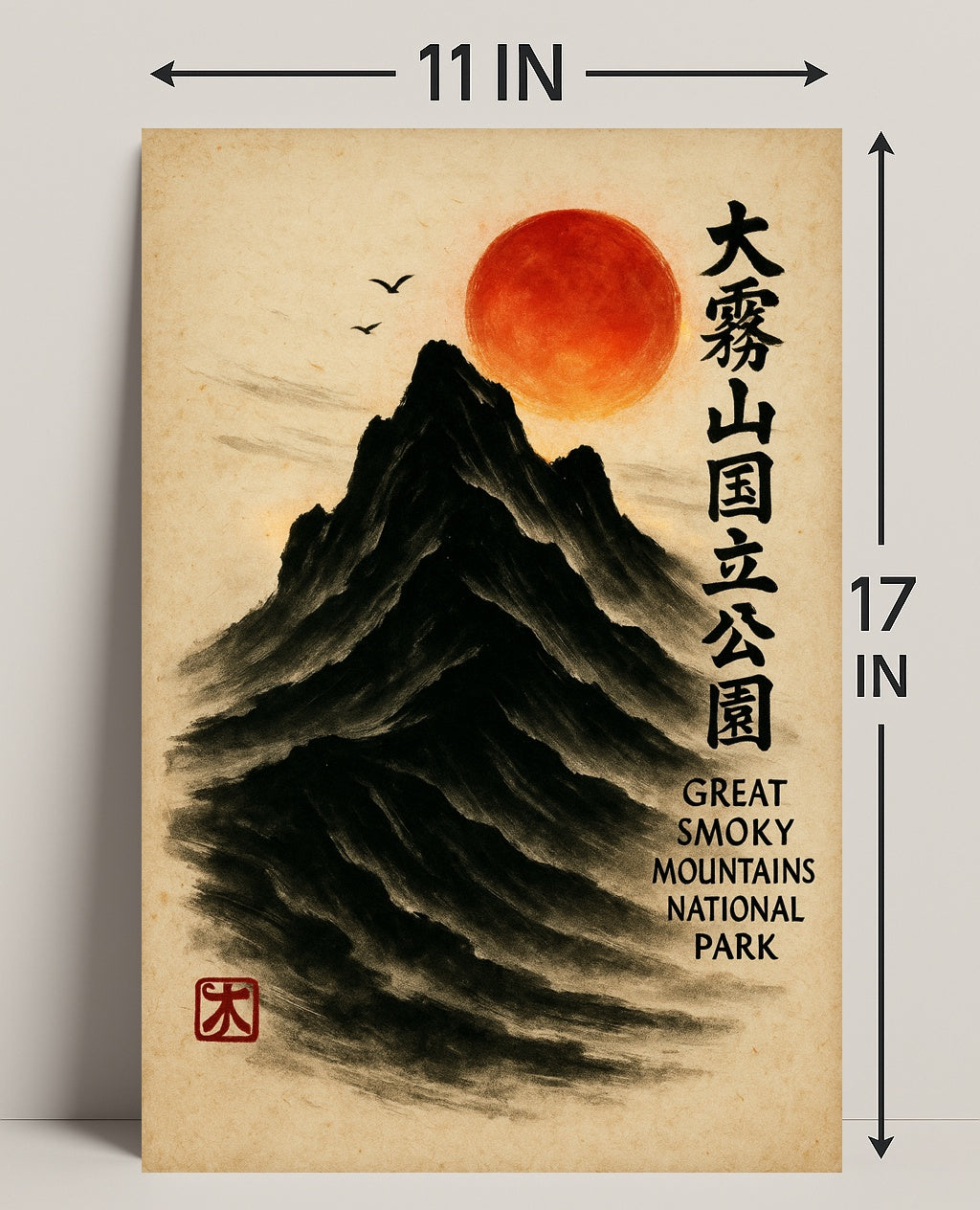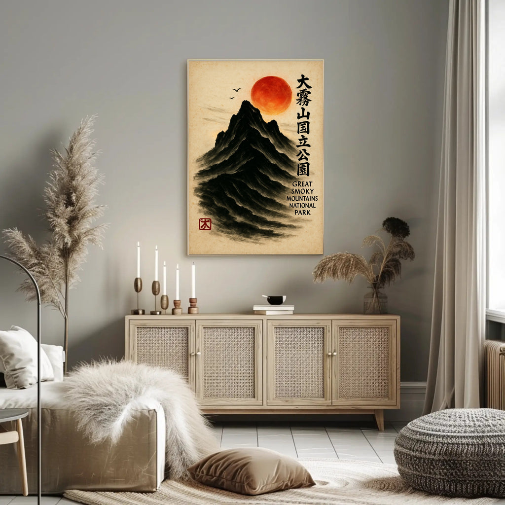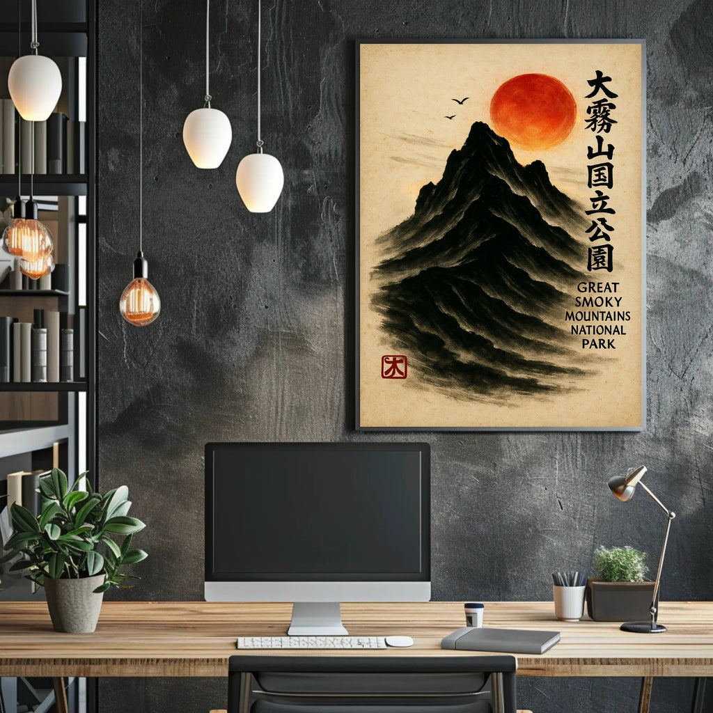 Bring a serene fusion of East Asian painting and Appalachian majesty into your home with the Great Smoky Mountains Cultural Heritage Artistic Poster from PosterGoat. Rendered in a minimalist sumi-e style, this poster depicts a towering black mountain carved from soft brushstrokes, a glowing red sun hovering above, delicate birds in flight, and elegant vertical calligraphy that celebrates the Great Smoky Mountains National Park. The textured parchment background and traditional red artist seal give this print an authentic, timeless feel.