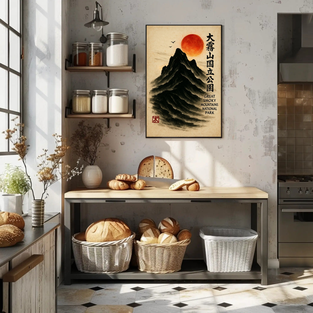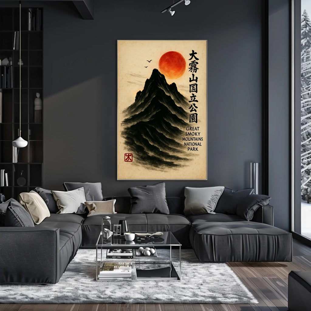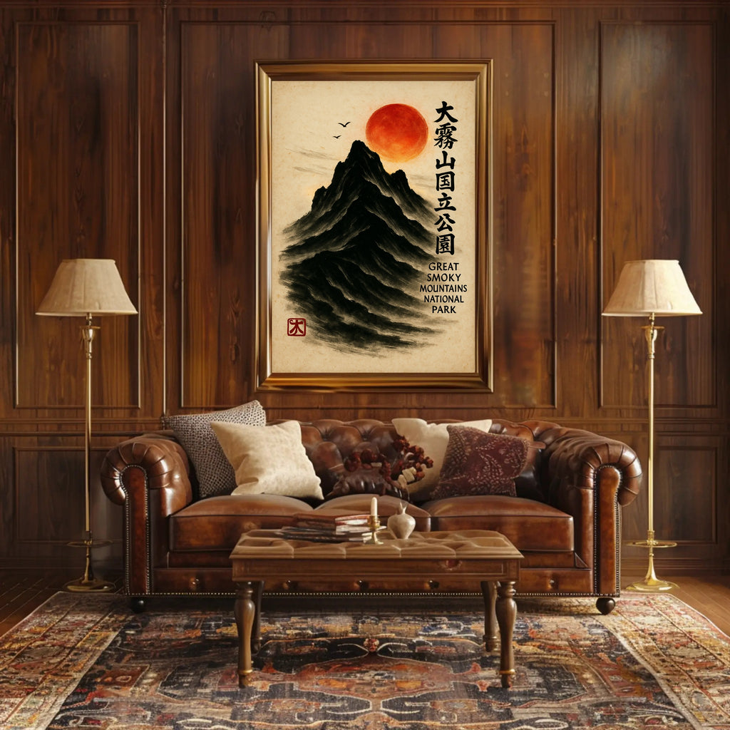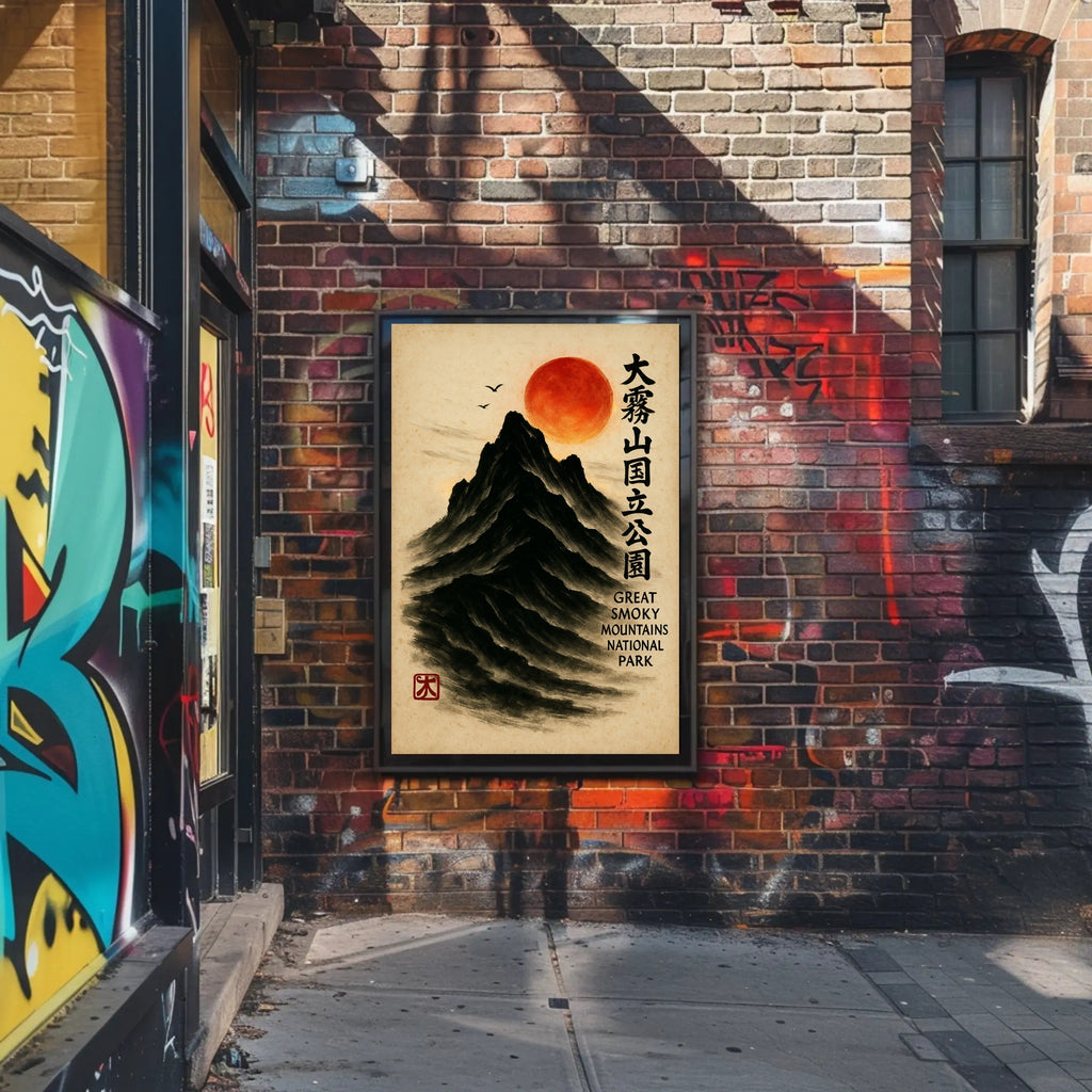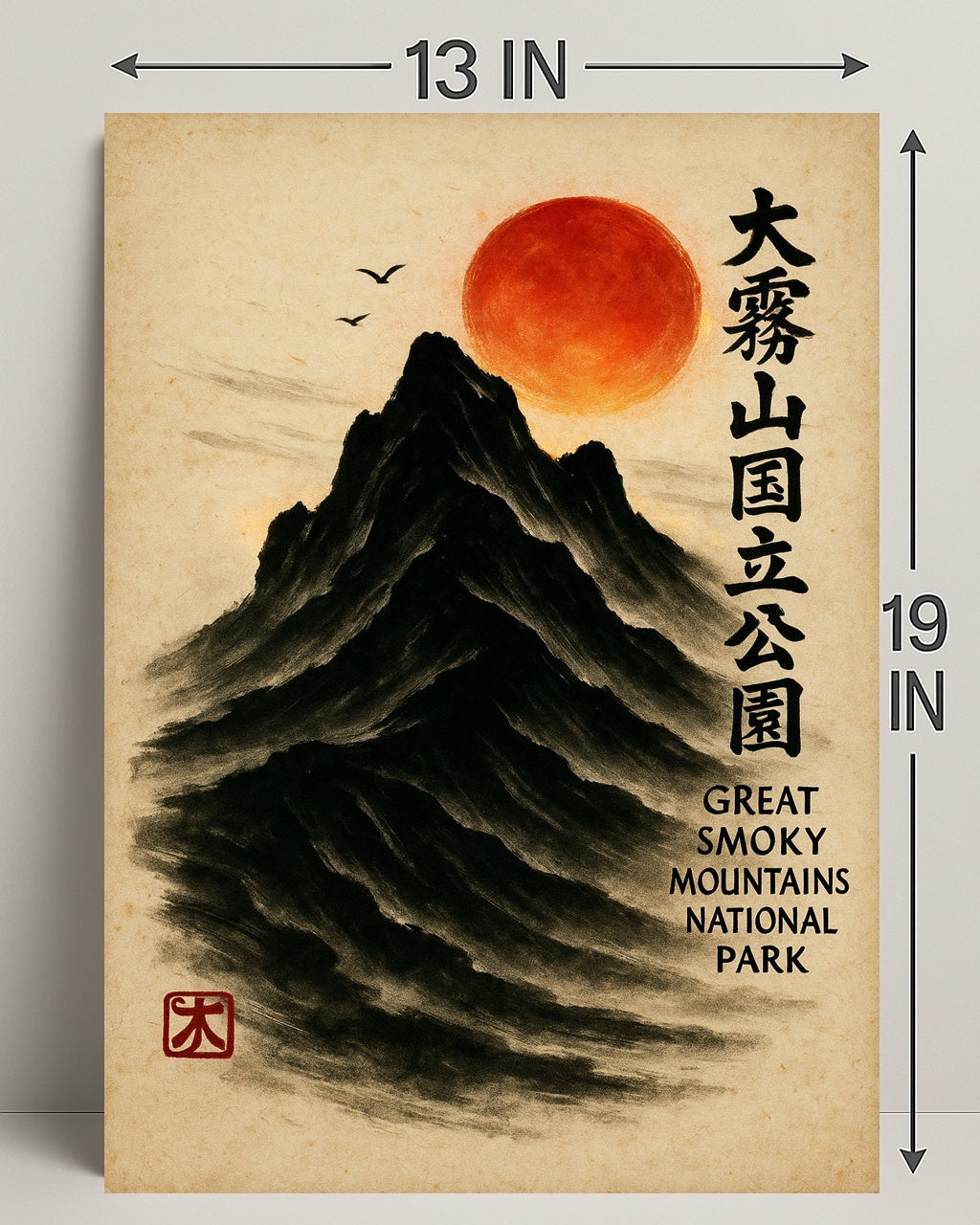 Bring a serene fusion of East Asian painting and Appalachian majesty into your home with the Great Smoky Mountains Cultural Heritage Artistic Poster from PosterGoat. Rendered in a minimalist sumi-e style, this poster depicts a towering black mountain carved from soft brushstrokes, a glowing red sun hovering above, delicate birds in flight, and elegant vertical calligraphy that celebrates the Great Smoky Mountains National Park. The textured parchment background and traditional red artist seal give this print an authentic, timeless feel.