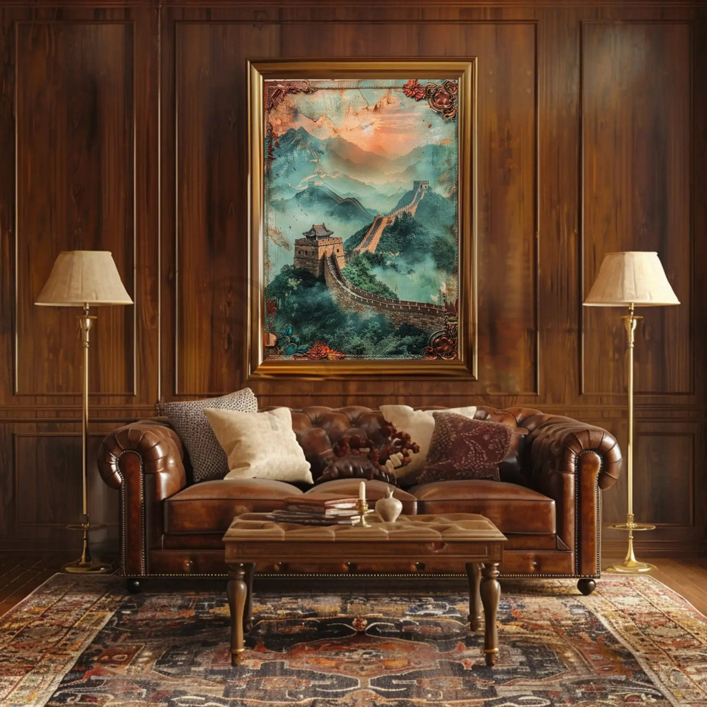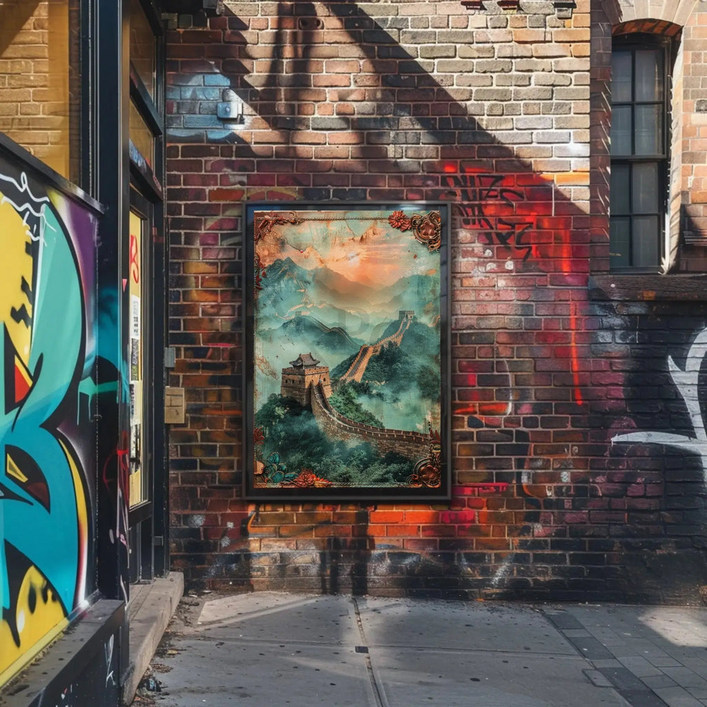 Great Wall of China Sunset Cultural Poster by PosterGoat captures the majestic sweep of the Great Wall as it winds through mist-clad mountains beneath a warm, glowing sunset. This poster blends photorealistic landscape detail with a vintage, postcard-style texture — ornate floral corners, aged paper tones, and painterly teal-and-amber hues — creating a piece that feels both historic and artful. Perfect for home or office decor, it brings cultural depth and serene mountain scenery to any wall.
