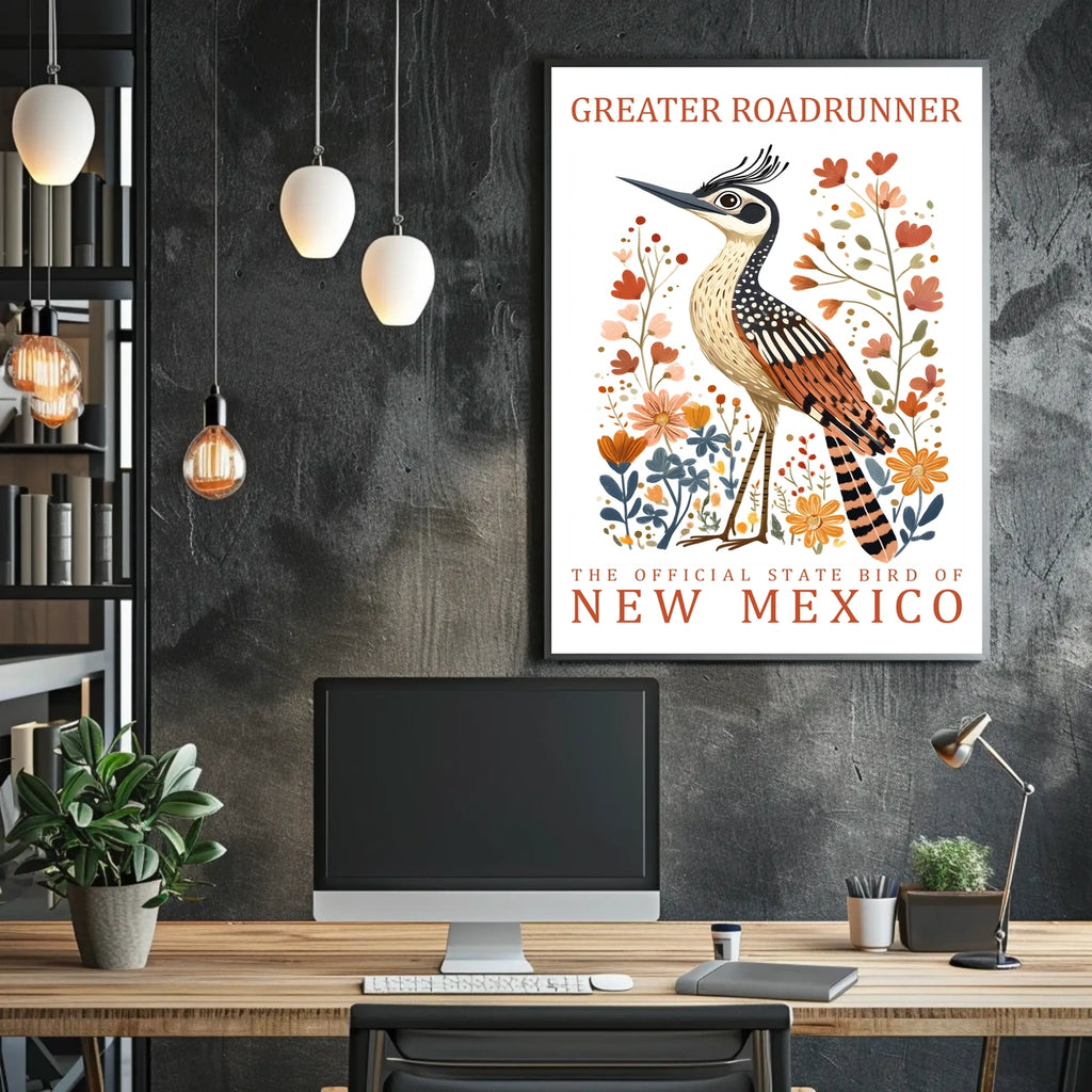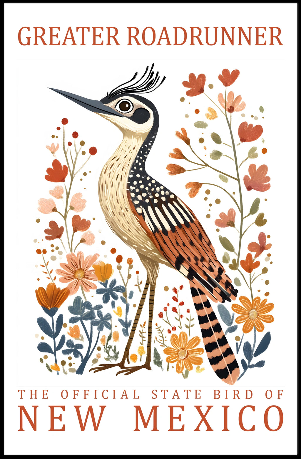 Celebrate the Greater Roadrunner poster, a striking New Mexico art print that honors the state's official bird with a modern, stylized look. This decorative piece blends warm, earthy tones with whimsical floral patterns, creating an inviting atmosphere for any room.