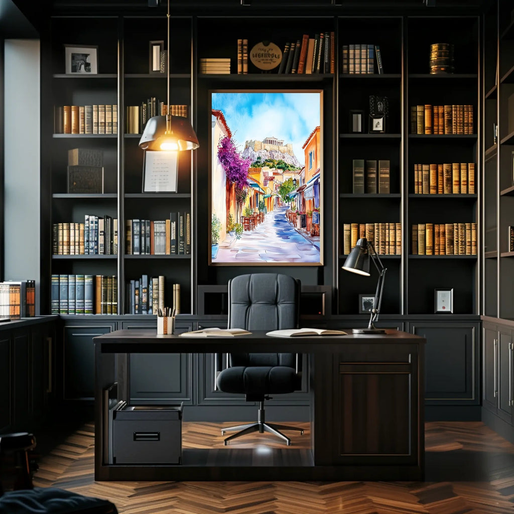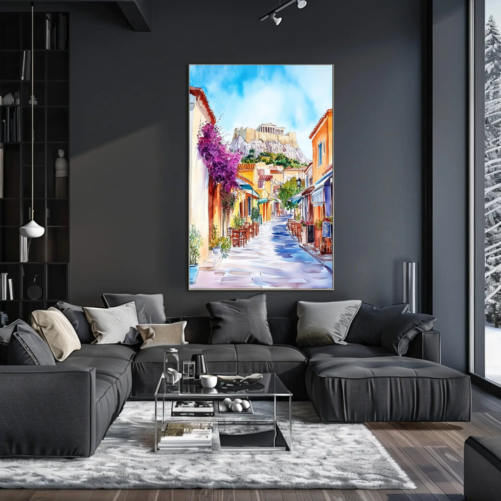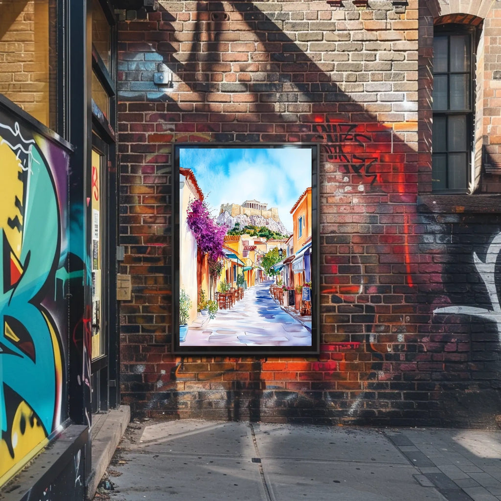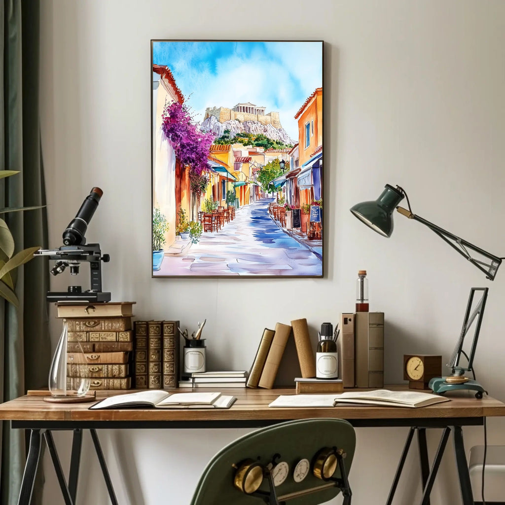 Greece Athens Acropolis Street View Poster from PosterGoat brings the iconic Acropolis street scene of Athens into your space with vibrant color and inviting depth.
